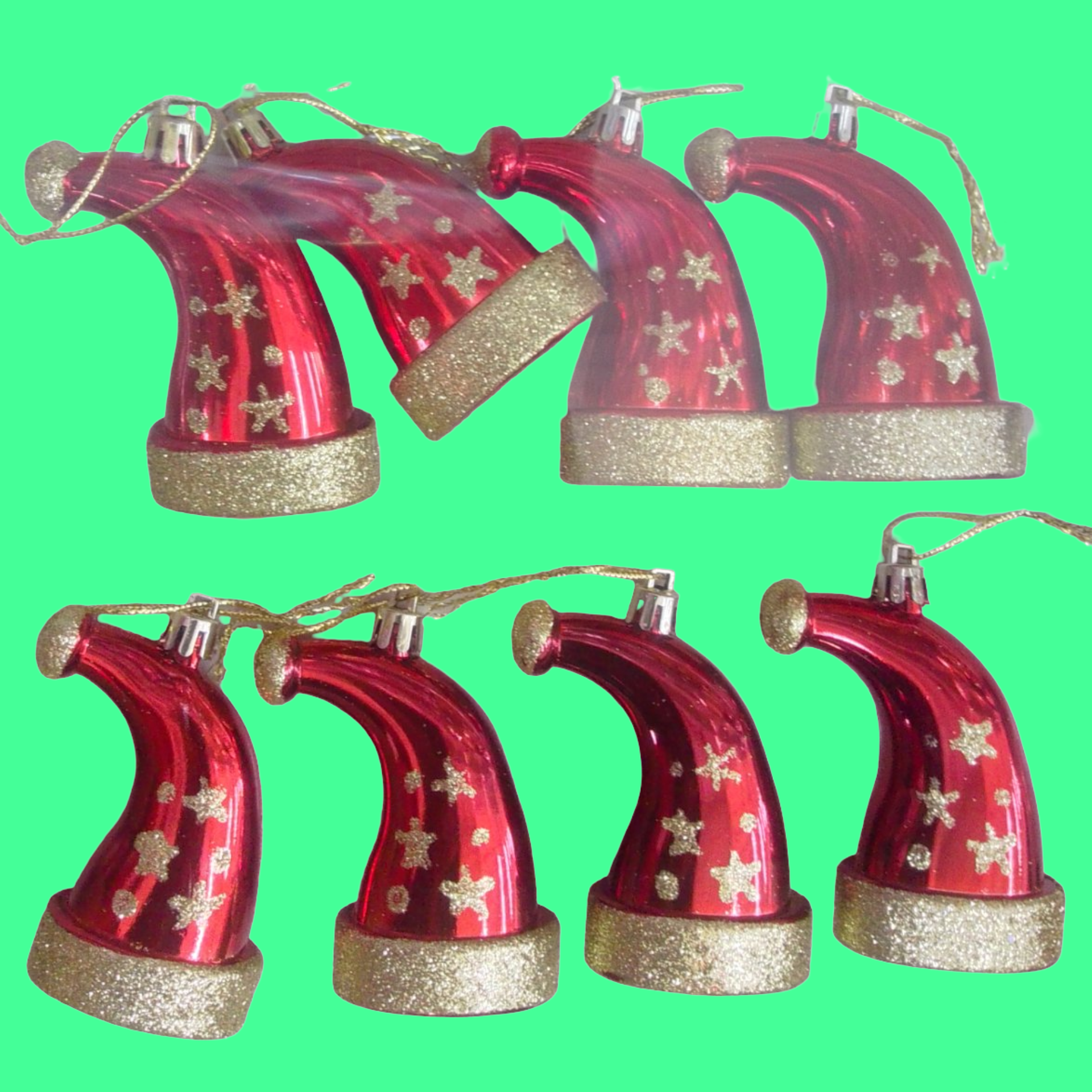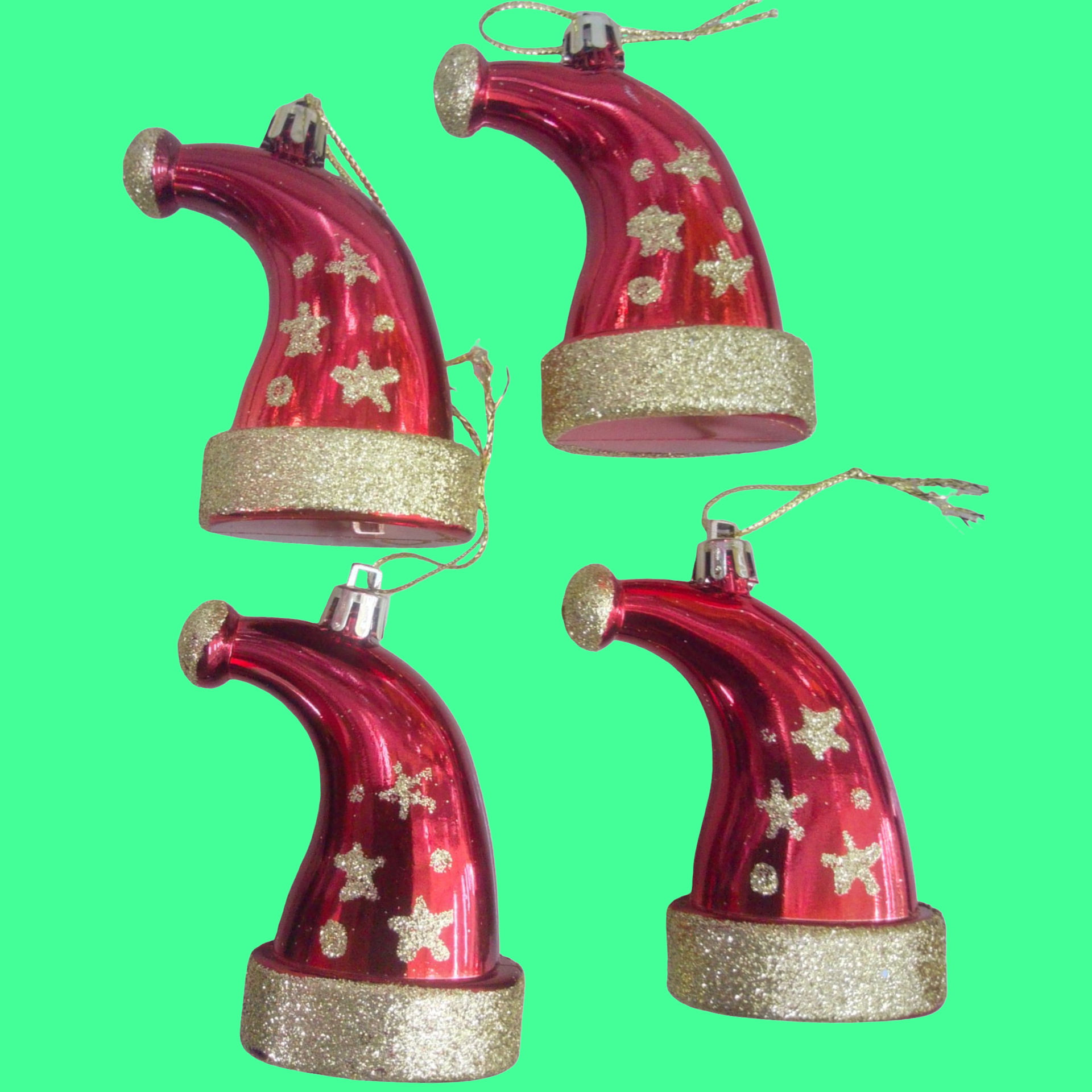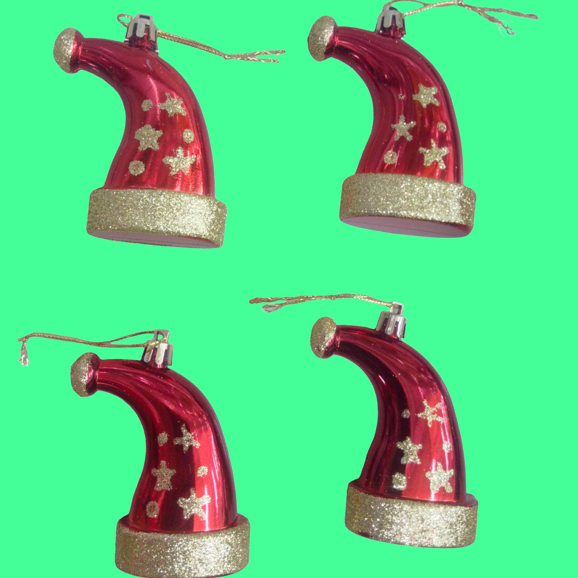SET DE 4 ADORNOS DECORATIVOS NAVIDEÑOS. DE FORMA DE GORRITO. COLOR ROJO CON ESCARCHA DORADA.