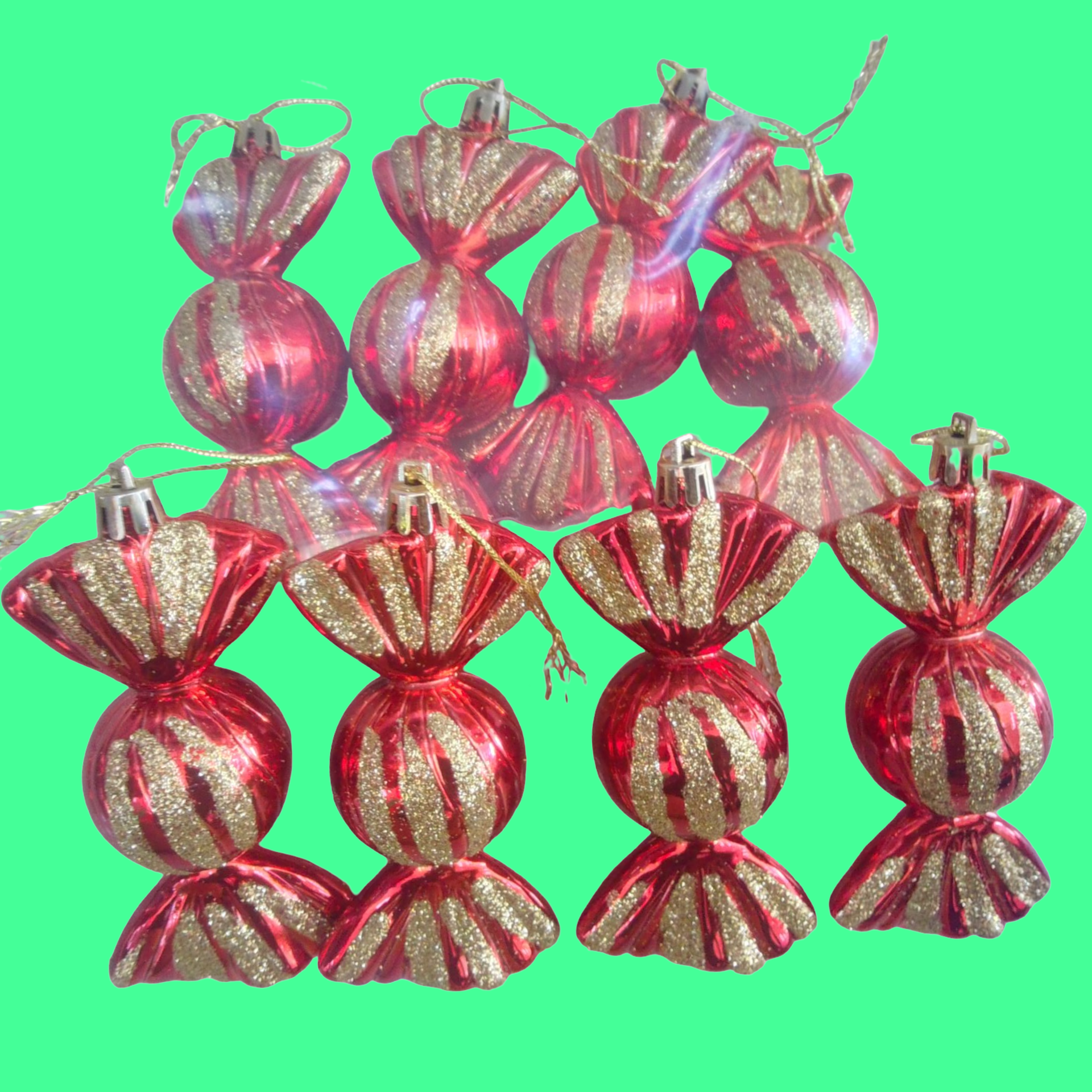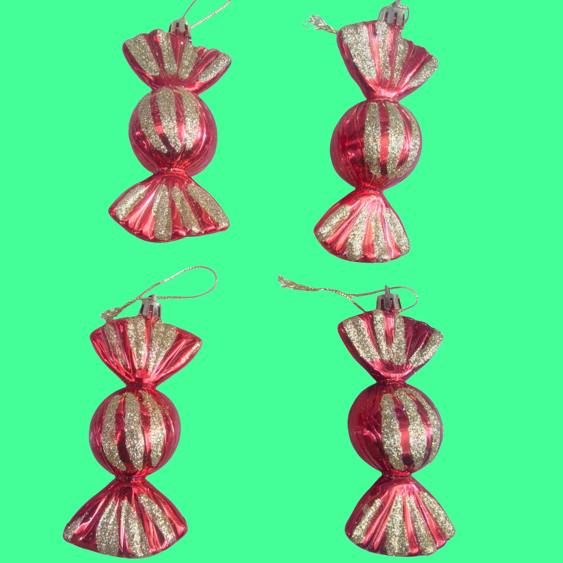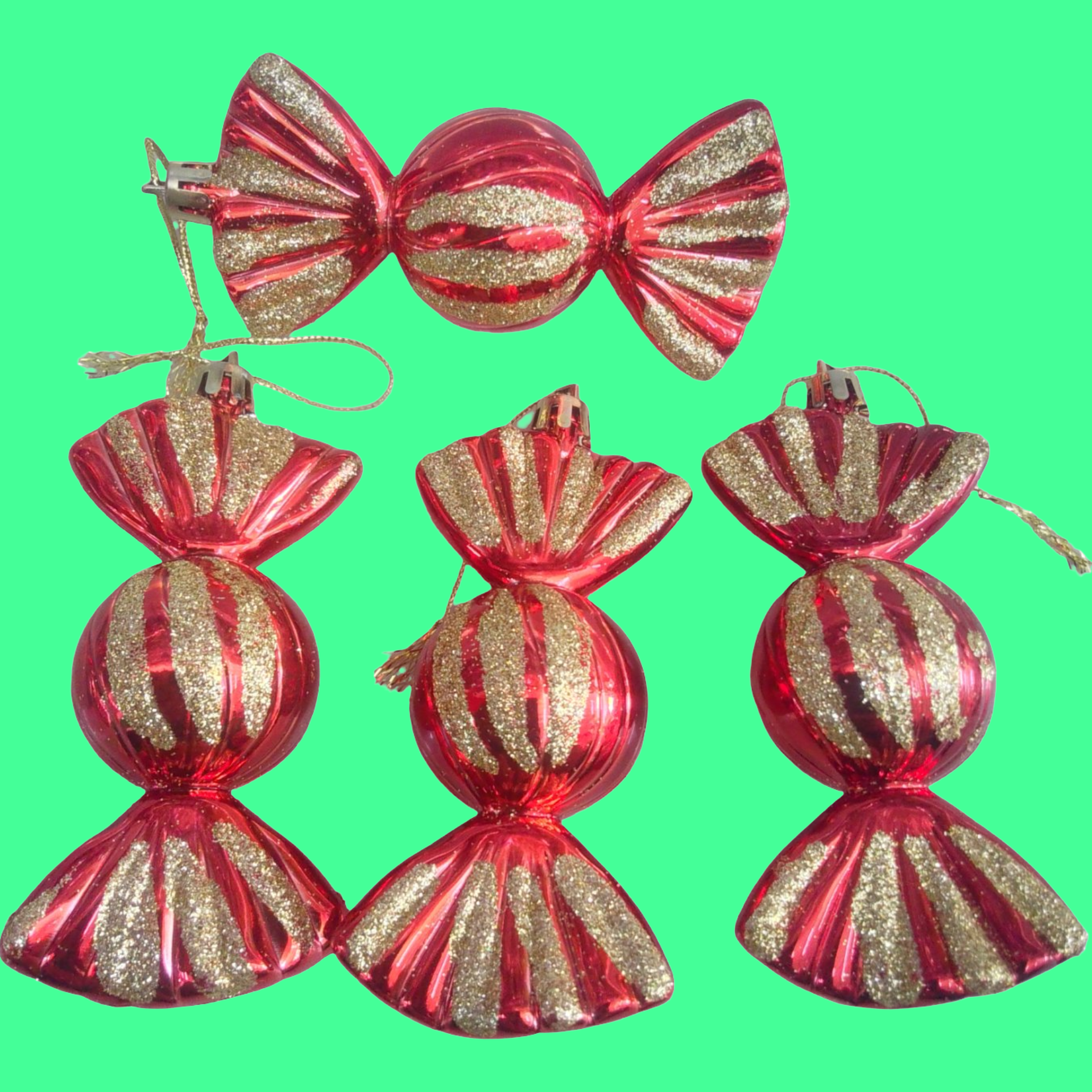 SET DE 4 BOMBONES, ADORNOS DECORATIVOS NAVIDEÑOS, COLOR ROJO CON DORADO ESCARCHADO.