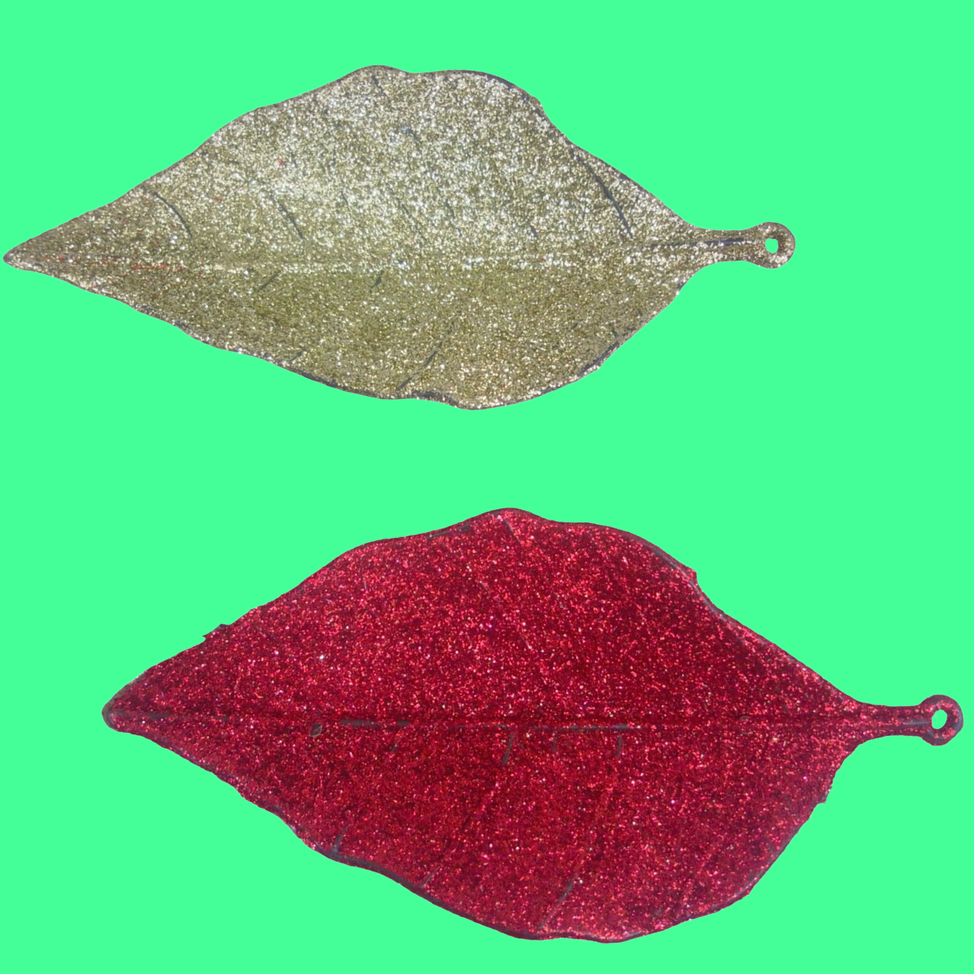 ADORNOS NAVIDEÑOS DECORATIVOS, PAR DE HOJAS ESCARCHADAS. UNA ROJA Y OTRA DORADO.