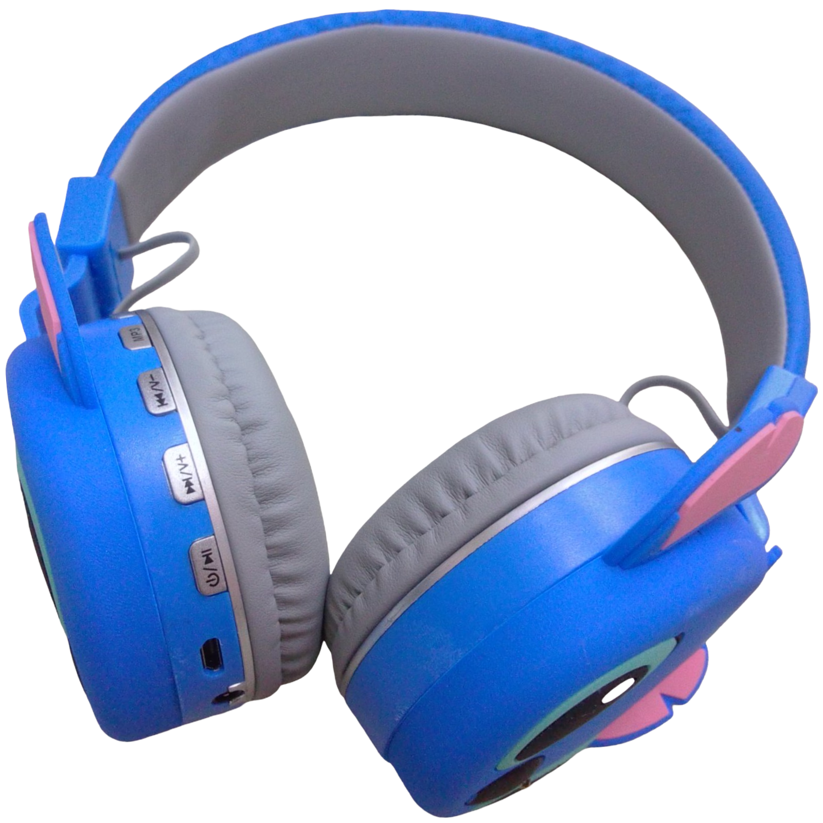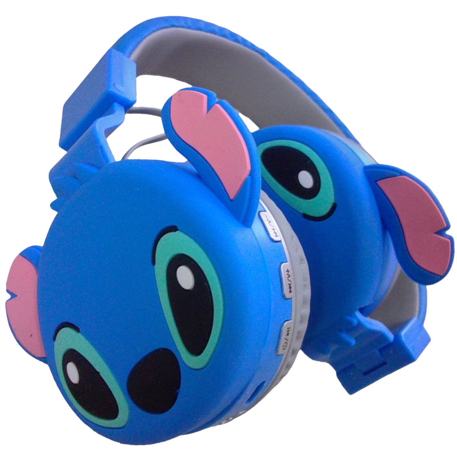 Audífonos de Stich color azúl, entrada de carga y recargable, entrada para memoria micro SD, botones de volumen, avanzar y retroceder, audífonos ajustables inalámbrico bluetooth.