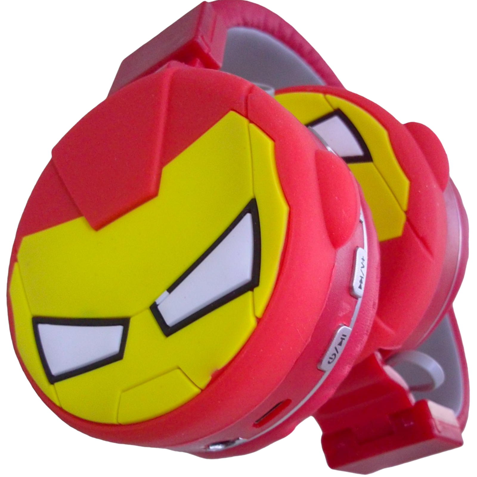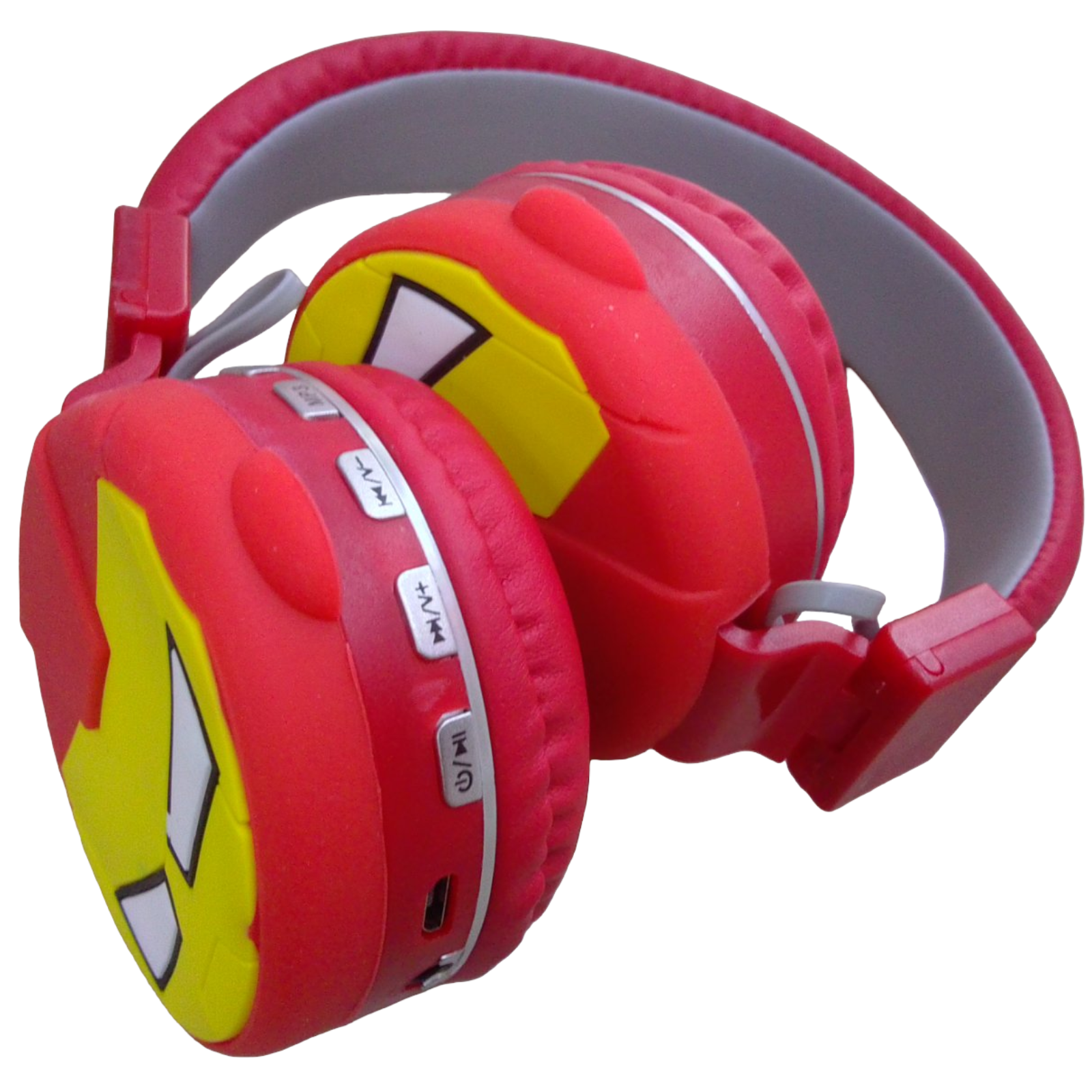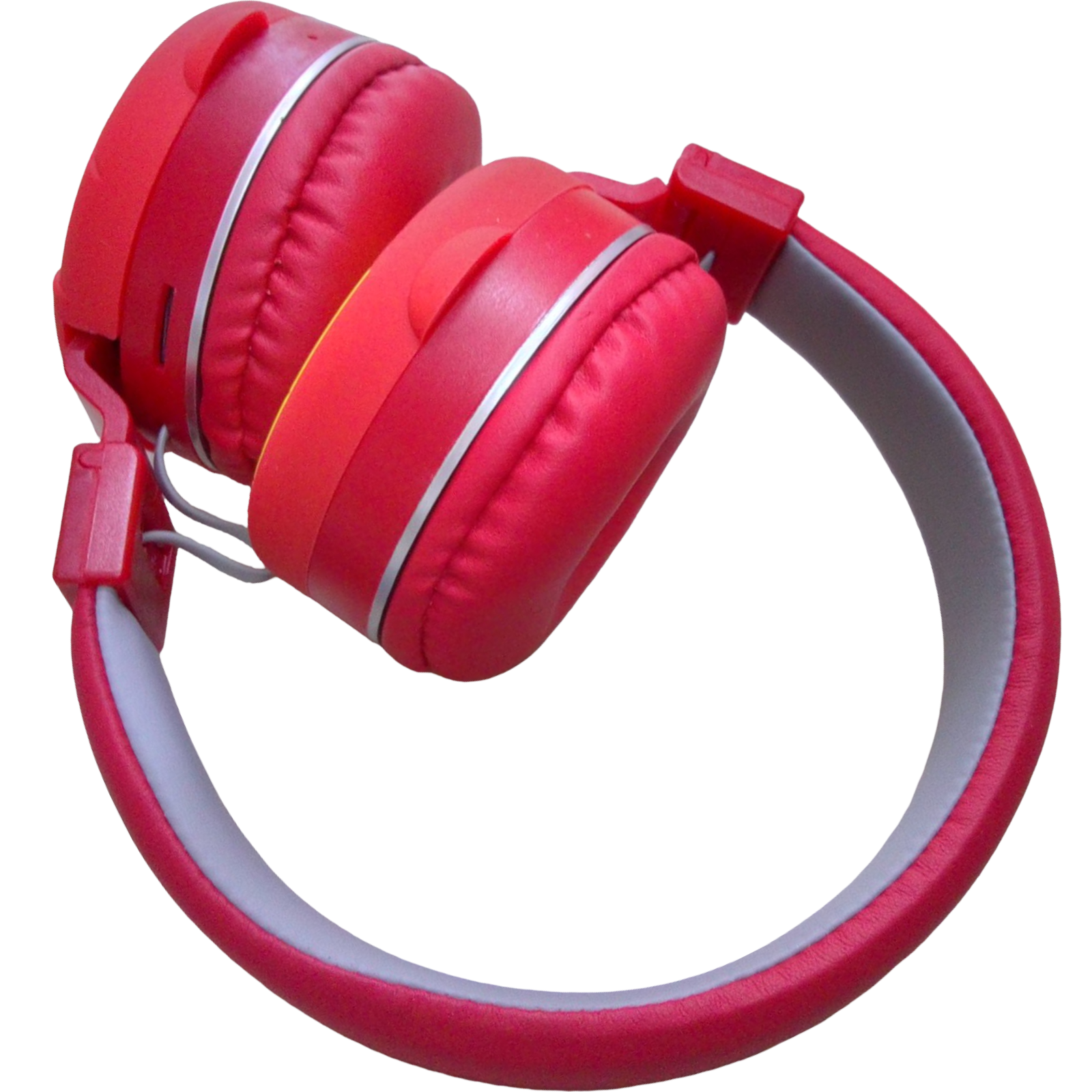 Auriculares inalámbricos recargable para celular, tiene entradas para cargar, micro SD, botones encendido, volumen y contestar llamadas, color rojo adelantar y buscar música.