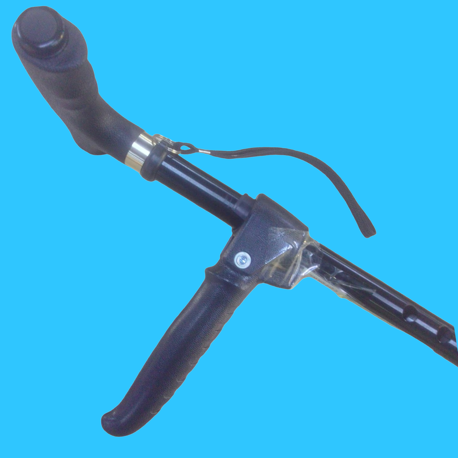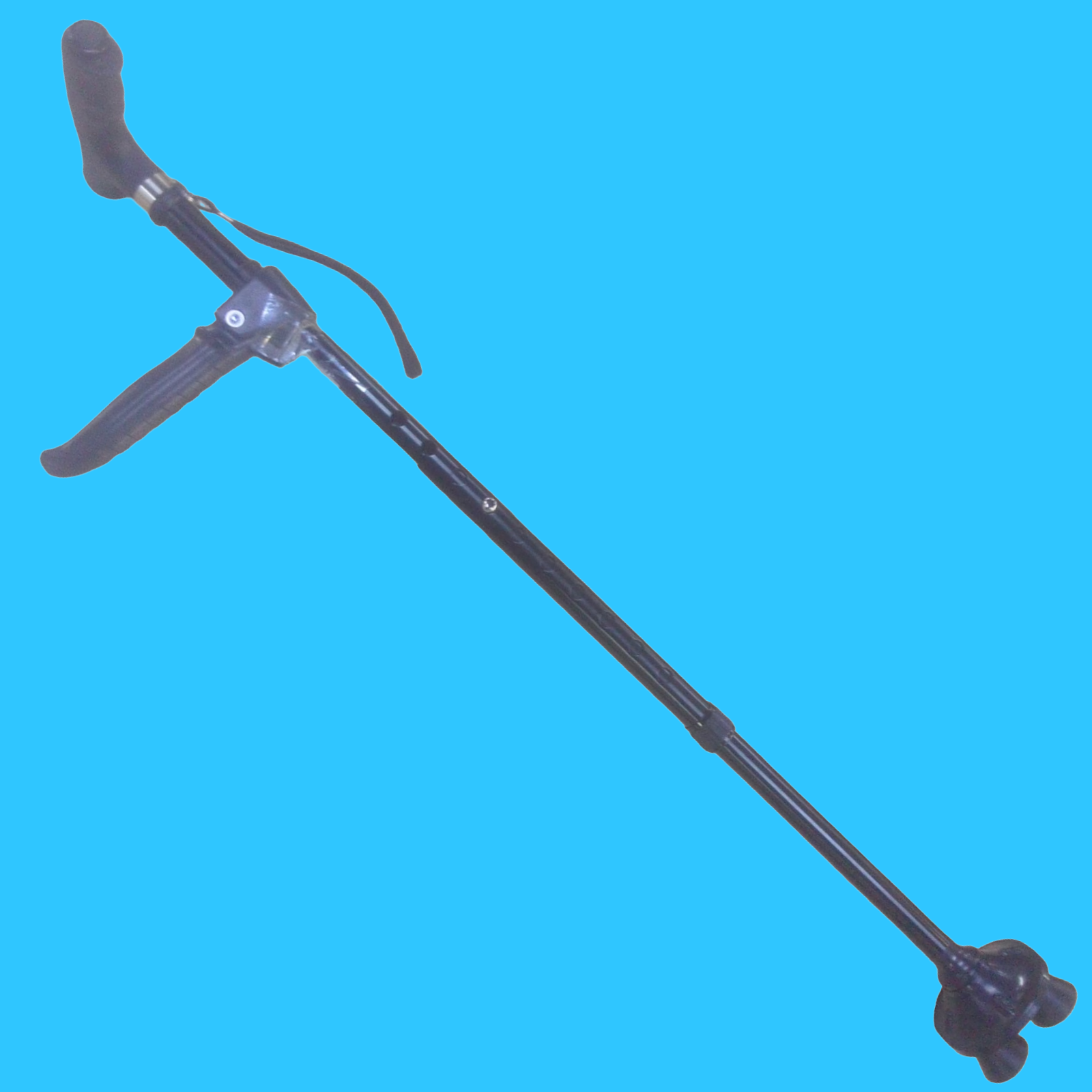 BASTÓN. COLOR NEGRO. CON BASE DE 4 TAPONES DE APOYO. CON AGARREDERA DOBLE PROPÓSITO. AJUSTABLE A CUALQUIER LARGO Y TIENE LUZ LED PARA APOYO EN LA NOCHE.
