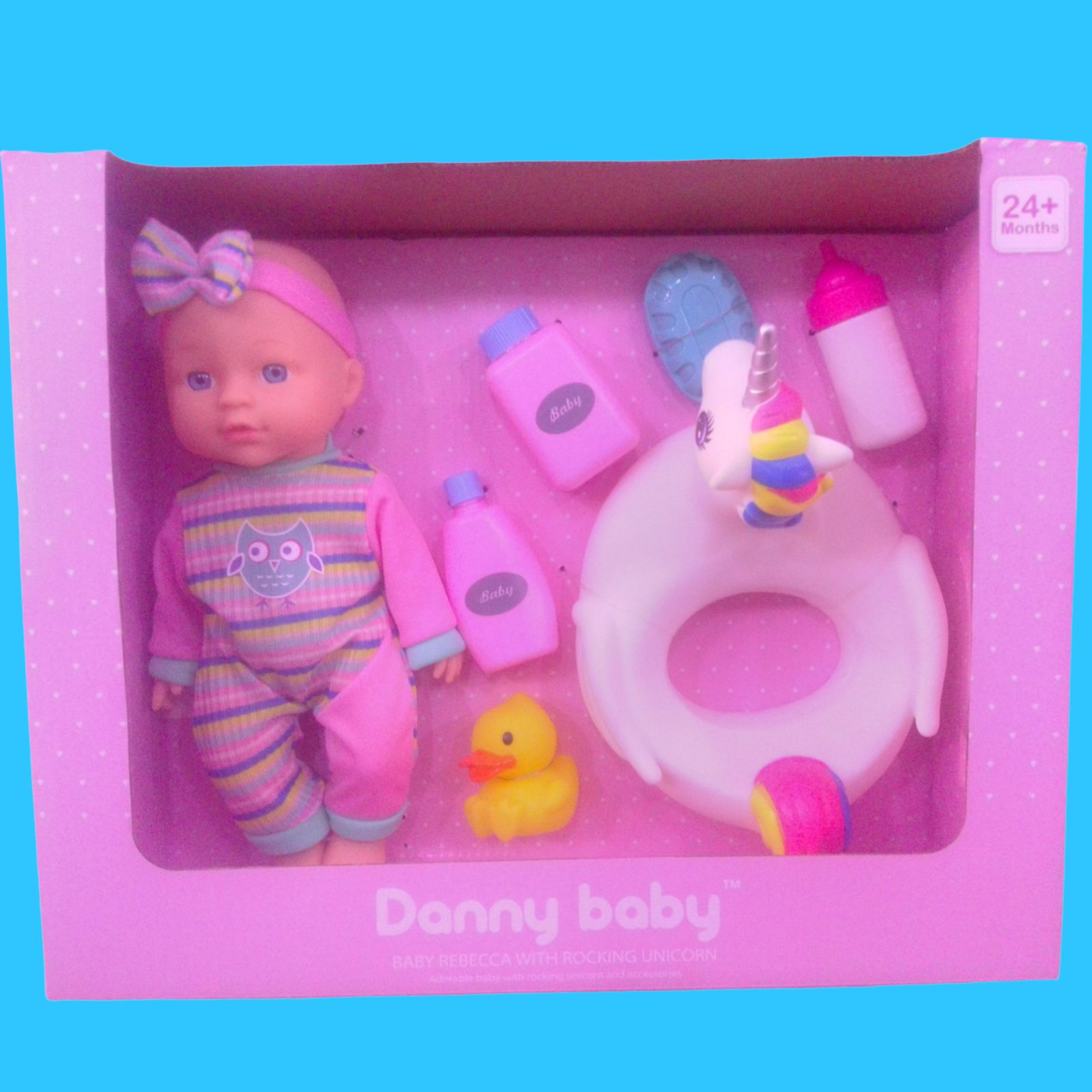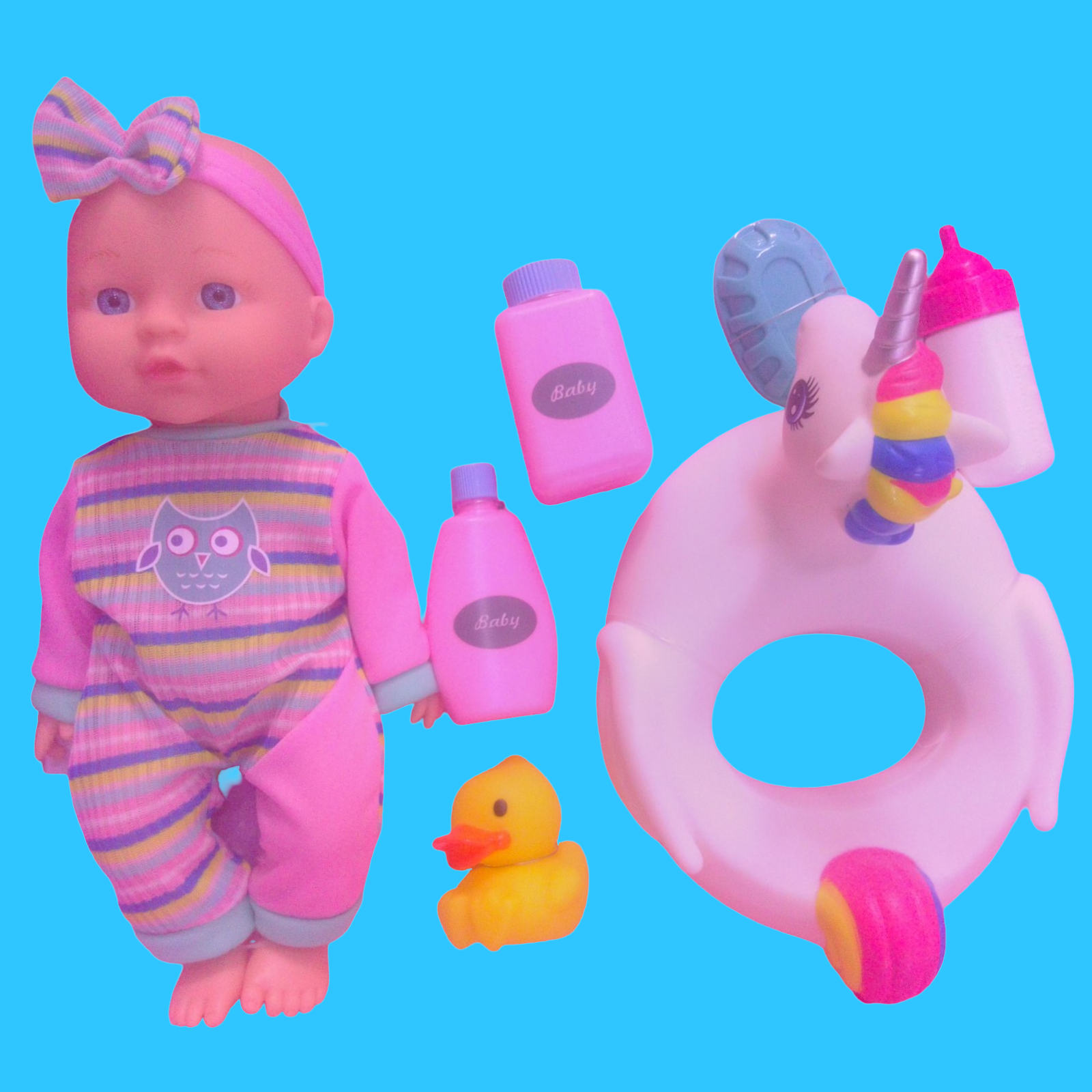 BEBITO CON ACCESORIOS PARA EL BAÑO, LISTO CON SU UNICORNIO FLOTADOR, PATITO, JABÓN, TALCO, LOCIÓN LISTO PARA EL BAÑO.