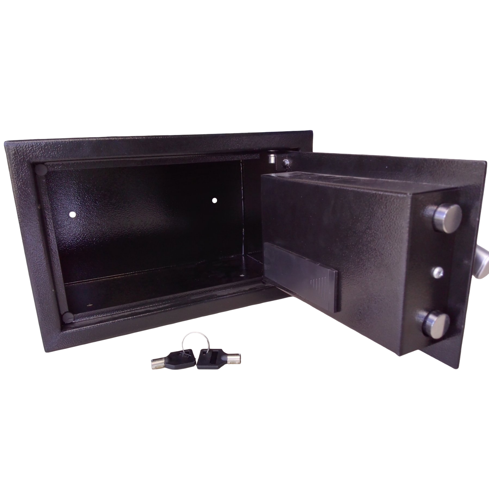 Caja fuerte de combinación, tamaño pequeño, color negro, y contrallave de seguridad.
