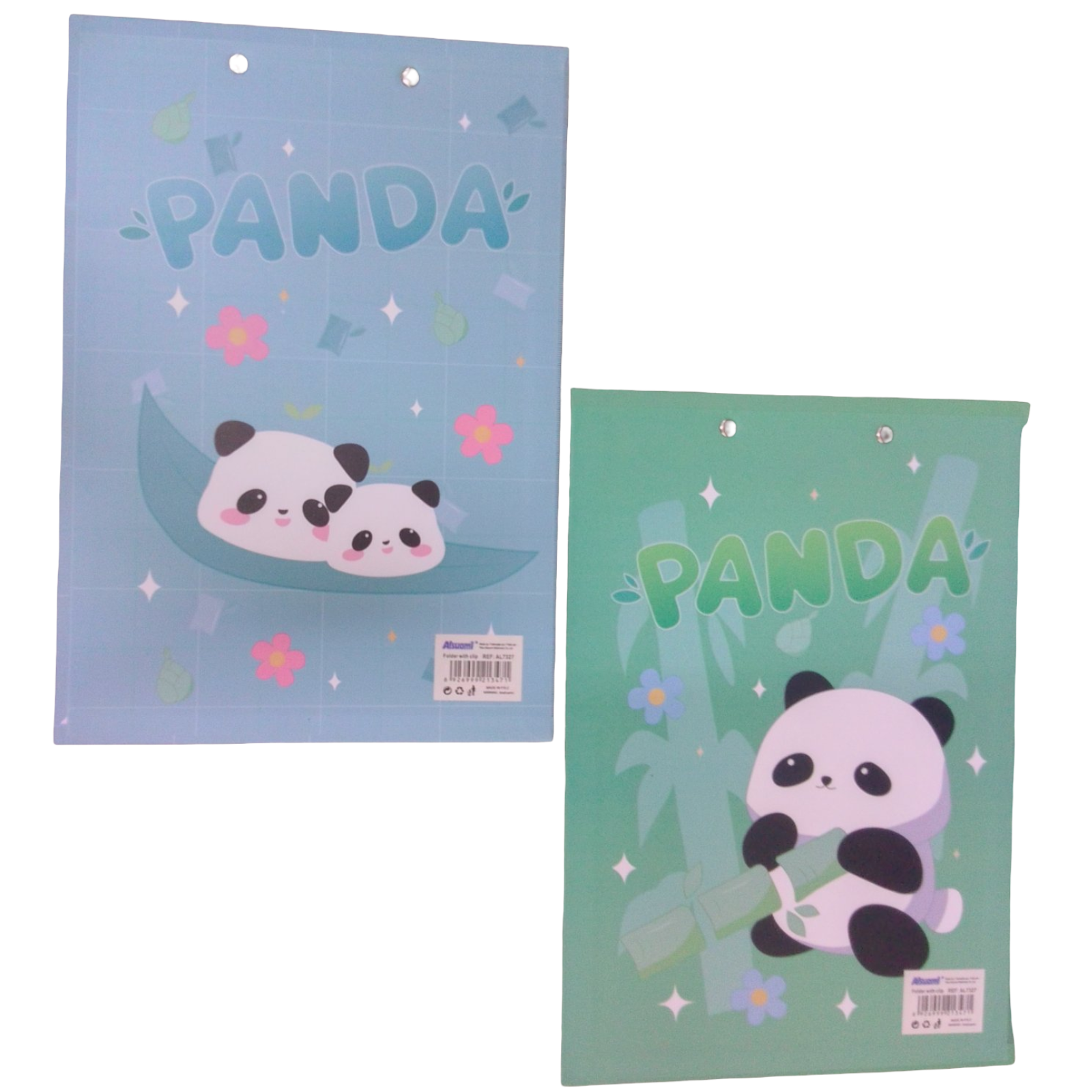 CARPETA PORTA PAPELES CON PRENSA DE METAL. CON DIBUJOS DE PANDA. MIDE 22 CM. X 31 CM.
