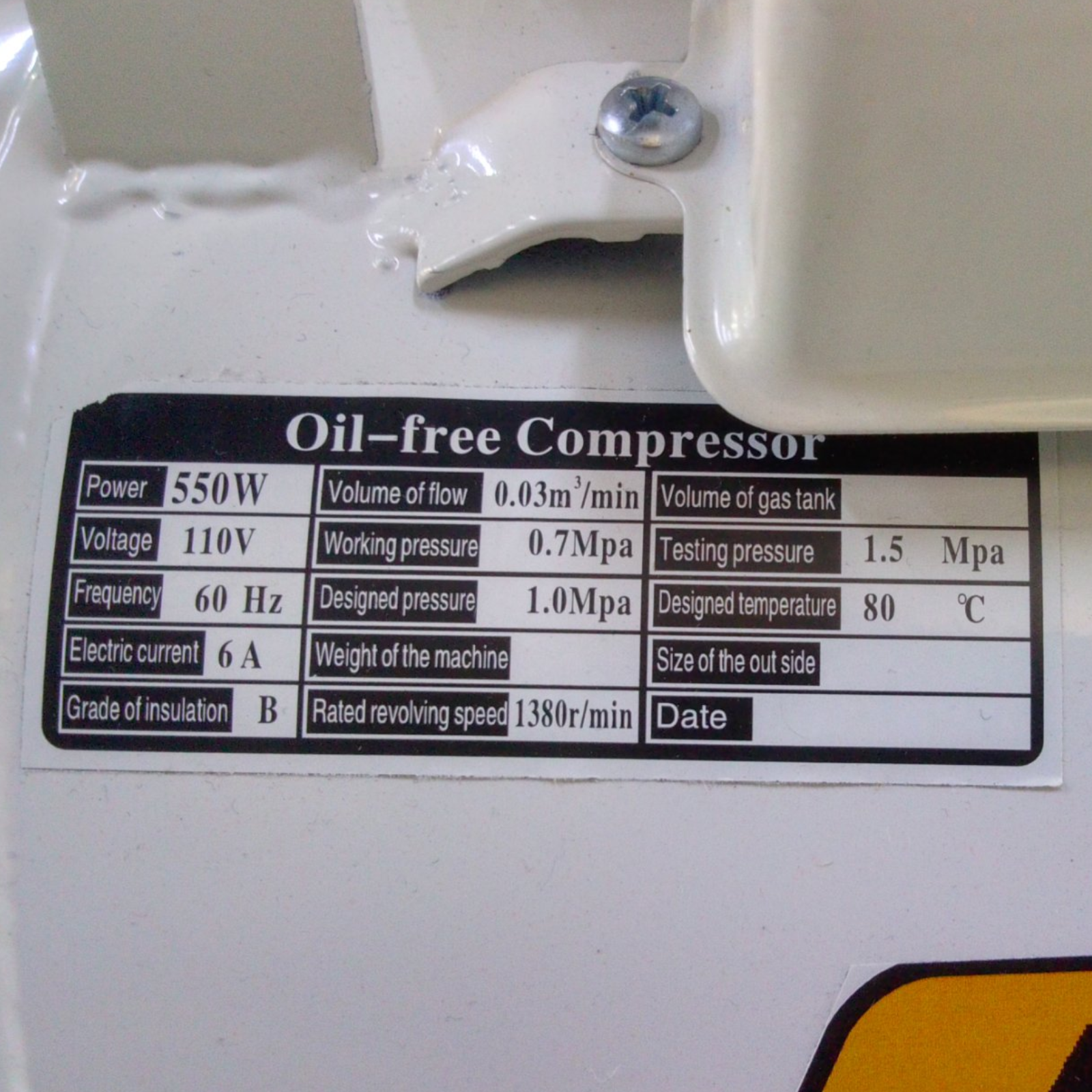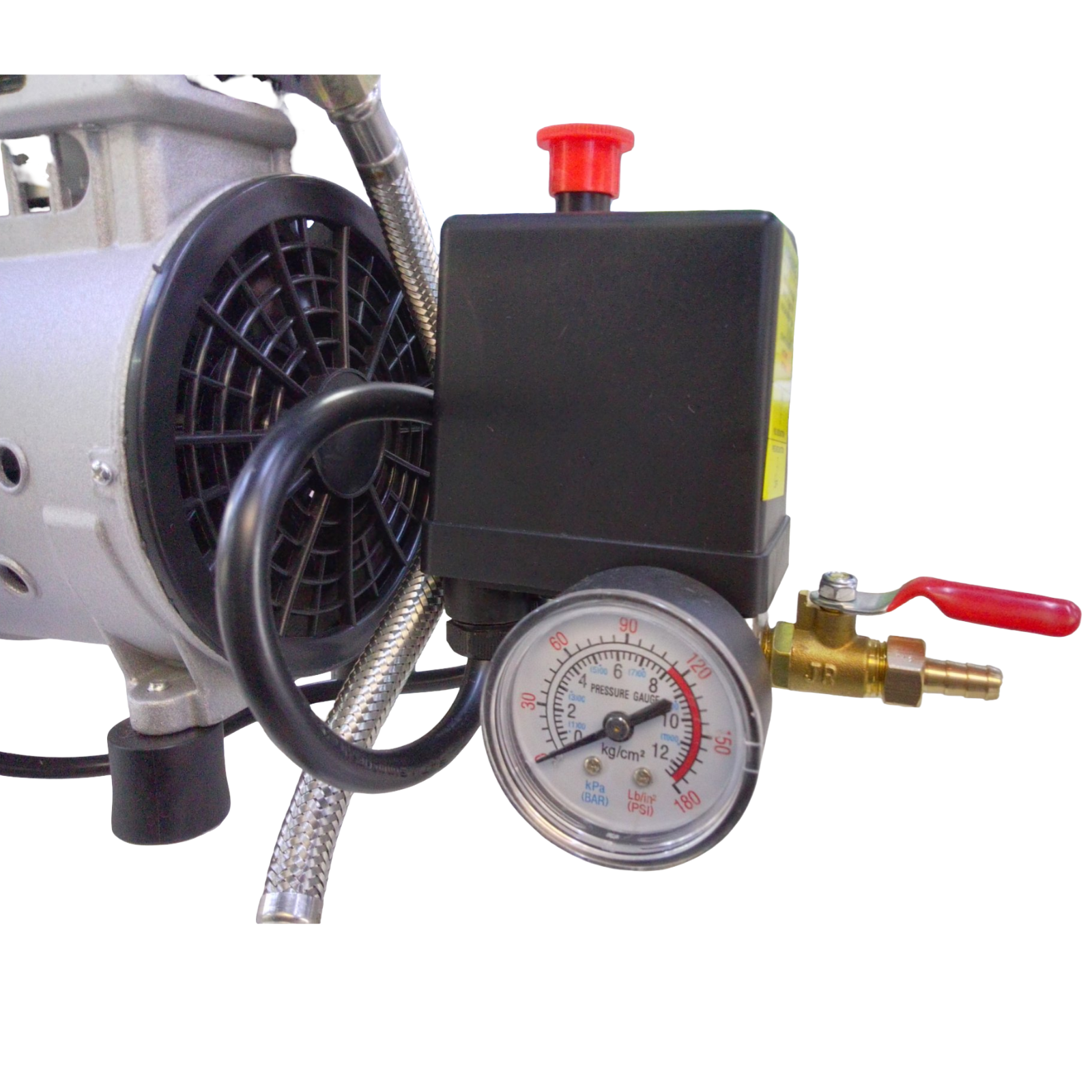 Compresor de aire, libre de aceite, poder del motor 550 w, reloj marcador de presión de aire, llave de cierre y paso, botón de encendido y apagado,tornillo para evacuar el agua en el tanque, ruedas y filtro adjunto.