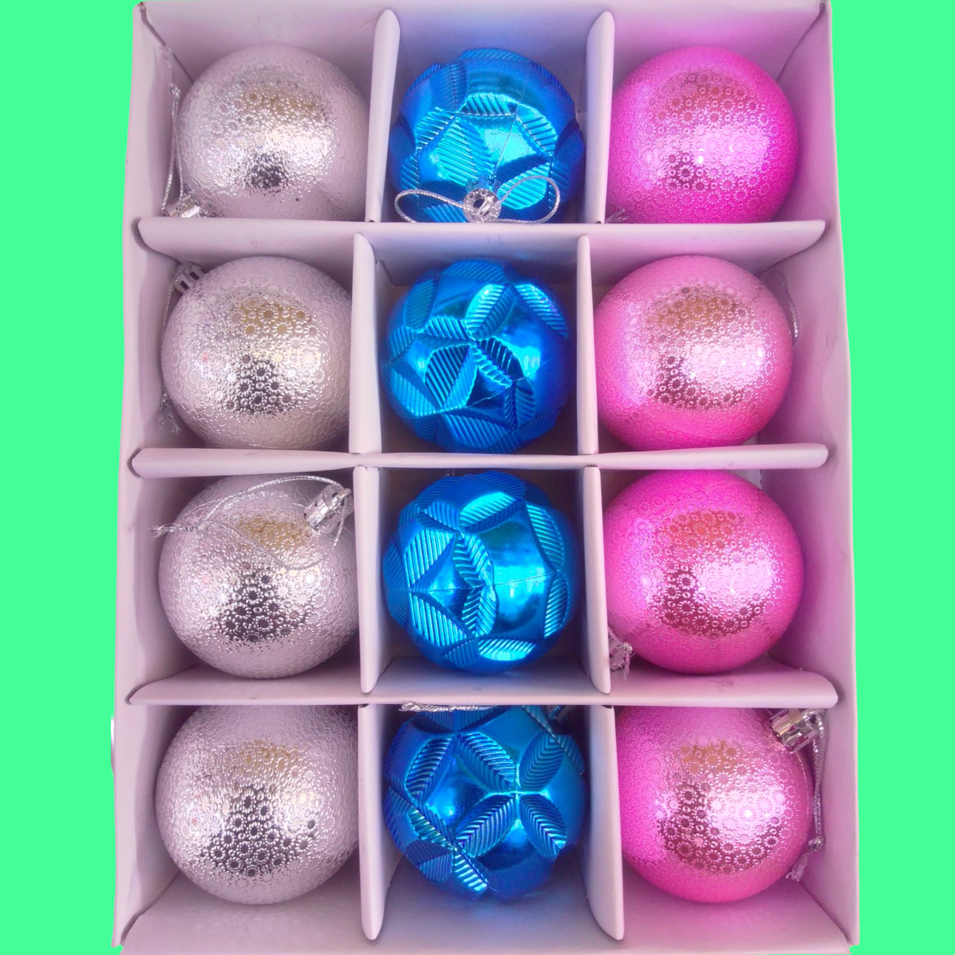 SET 12 PCS. ESFERAS NAVIDEÑAS SURTIDAS. VARIOS COLORES, ROSADO, PLATEADO Y AZUL.