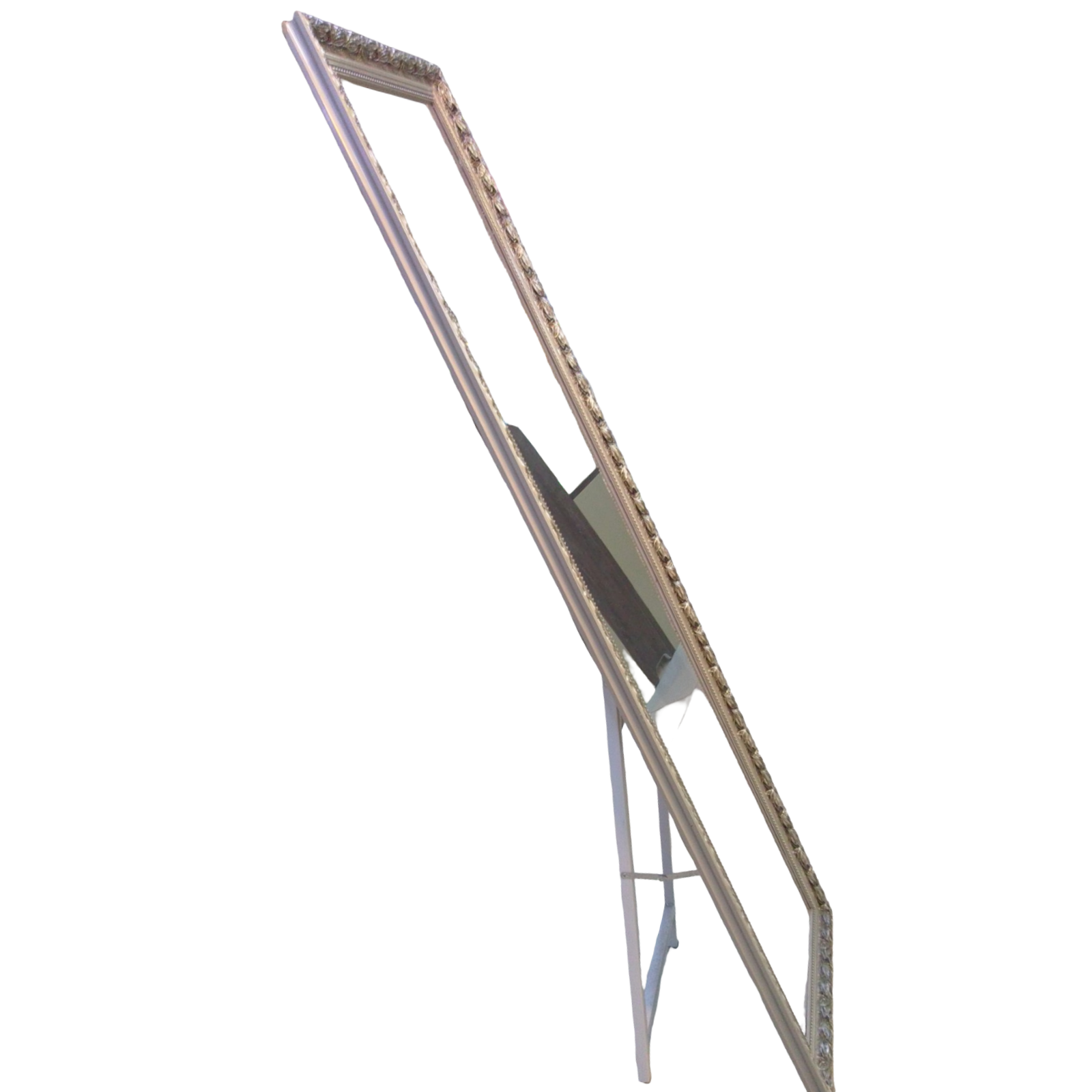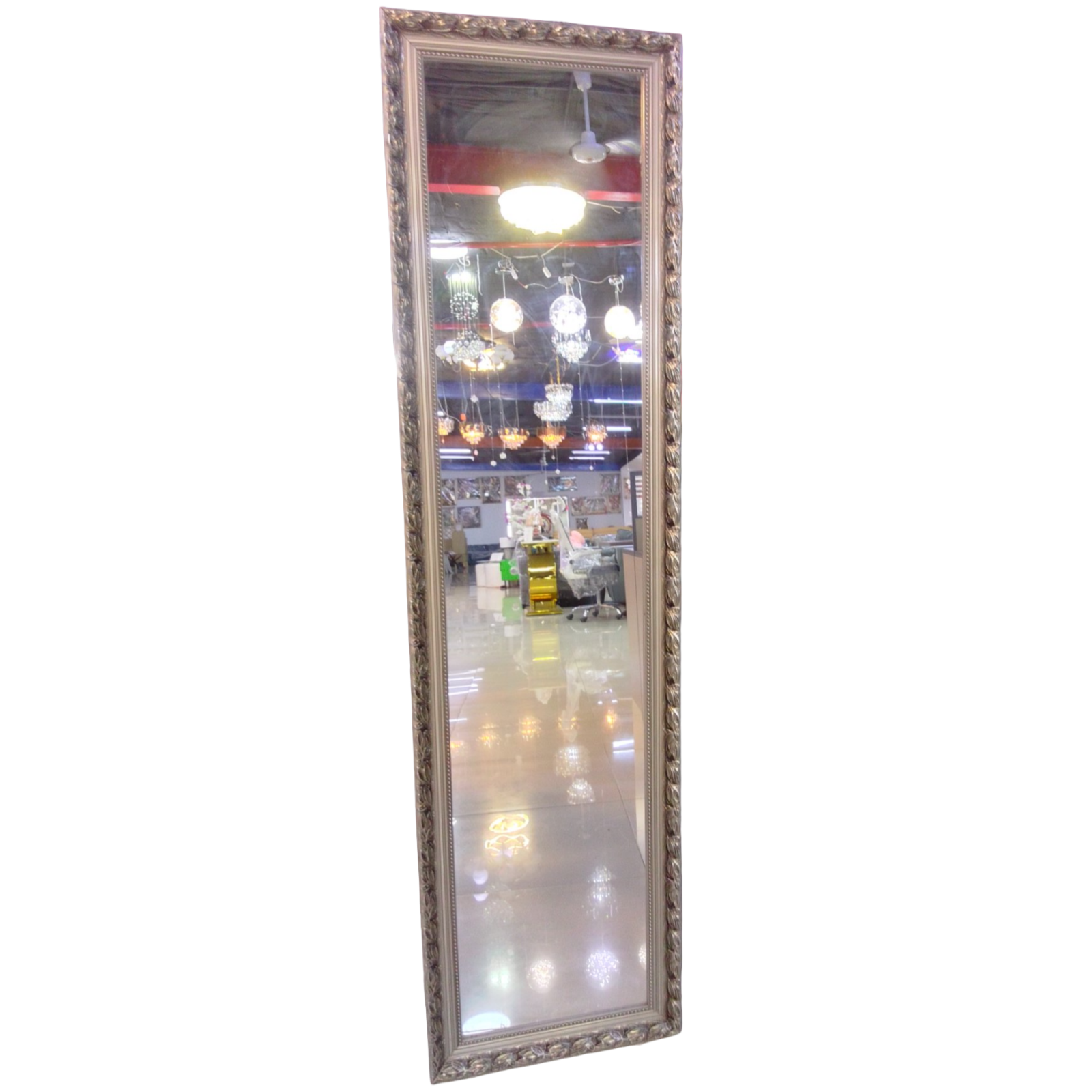 Espejo rectángular marco decorado, medidas 153 x 40, con base inclinado, color aluminio.