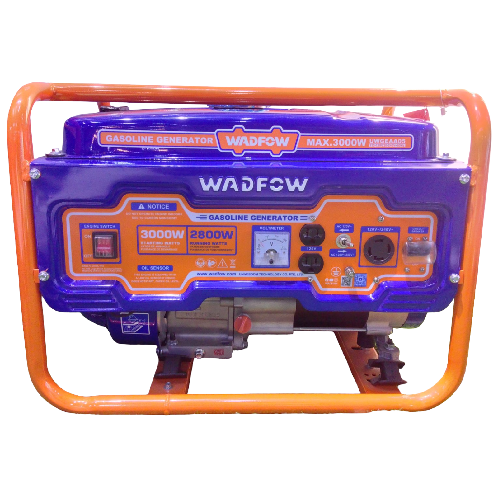 Generador eléctrico de gasolina, tiene voltímetro, switch encendido y apagado, entradas de tomas corrientes de 120 y 240 voltios, encendido por arranque por cuerda,