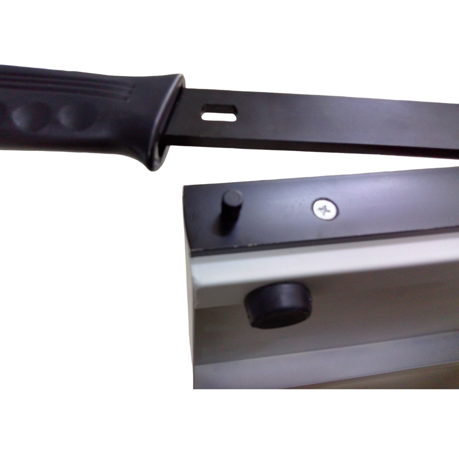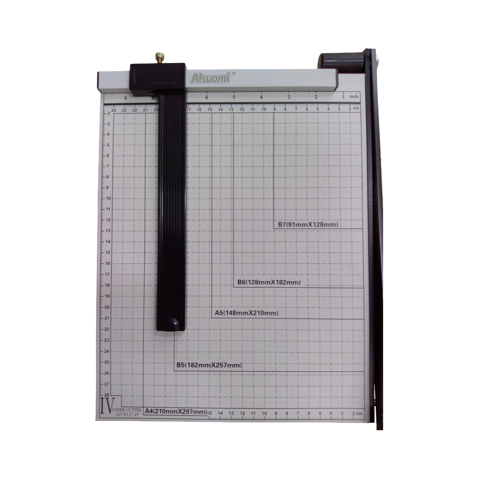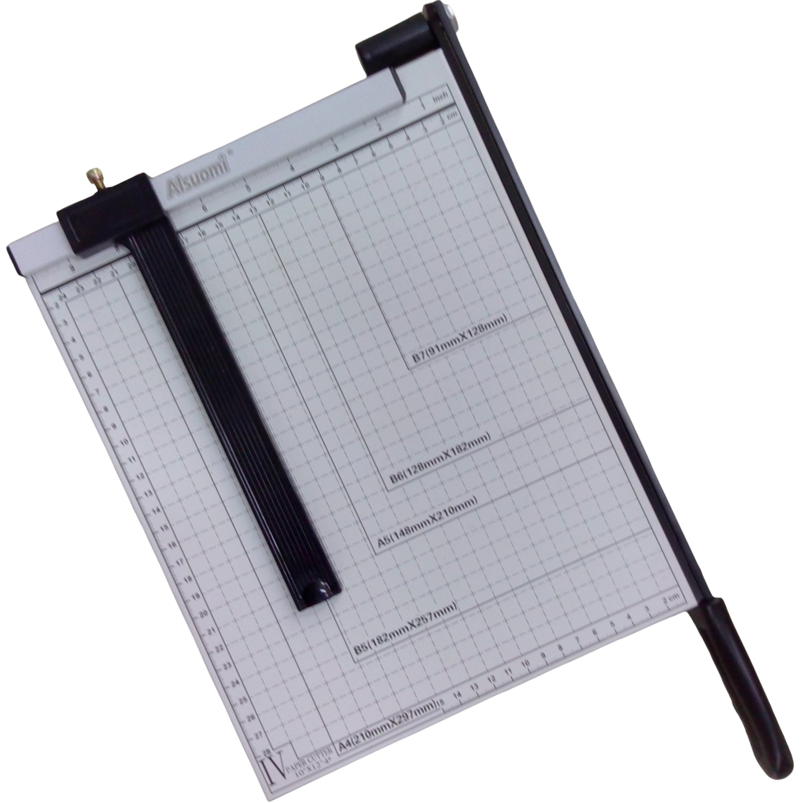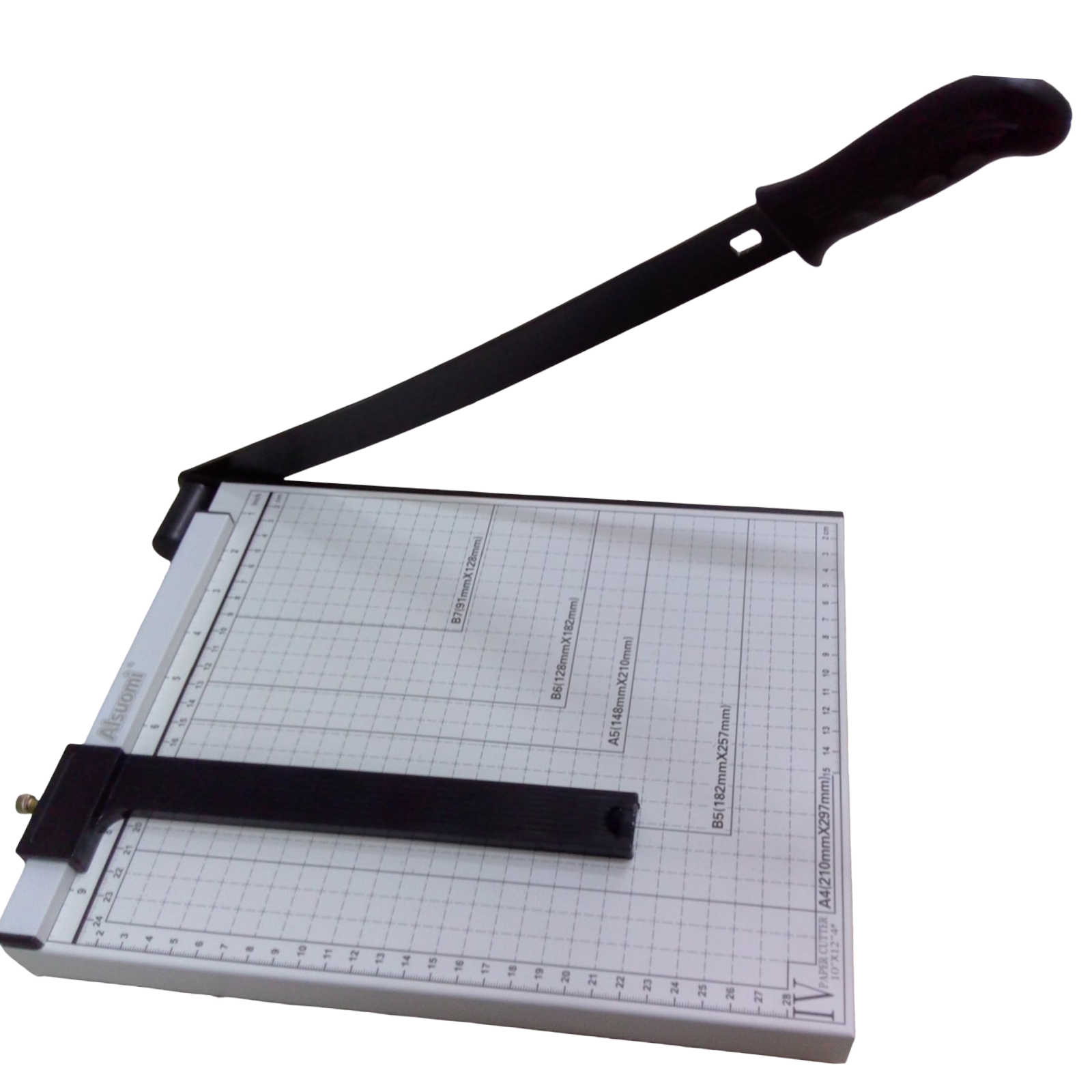 GUILLOTINA CORTADORA DE PAPEL. TIENE MEDIDAS EN CENTÍMETROS Y PULGADAS. PARA CORTAR PAPELERÍA. TIENE UNA GUÍA PARA HACER CORTES Y UN PIN DE SEGURIDAD PARA LA CUCHILLA DE CORTE. MIDE: 32 X 26 X 4 CM.