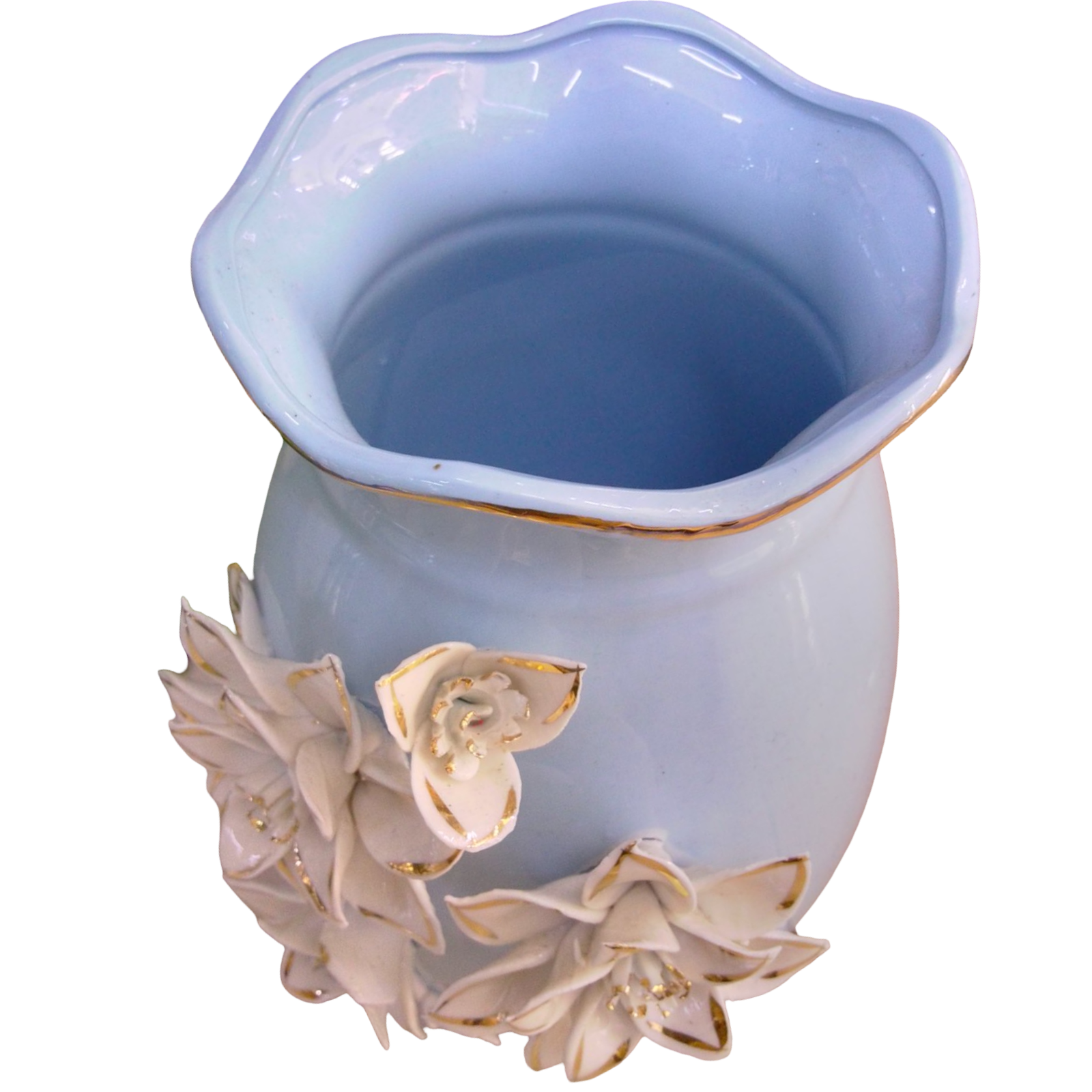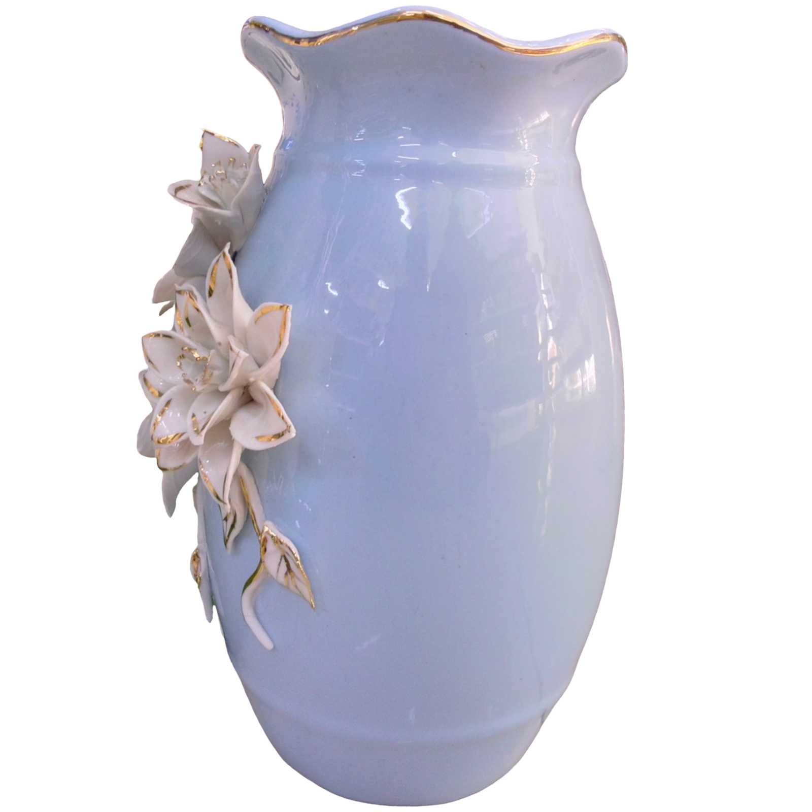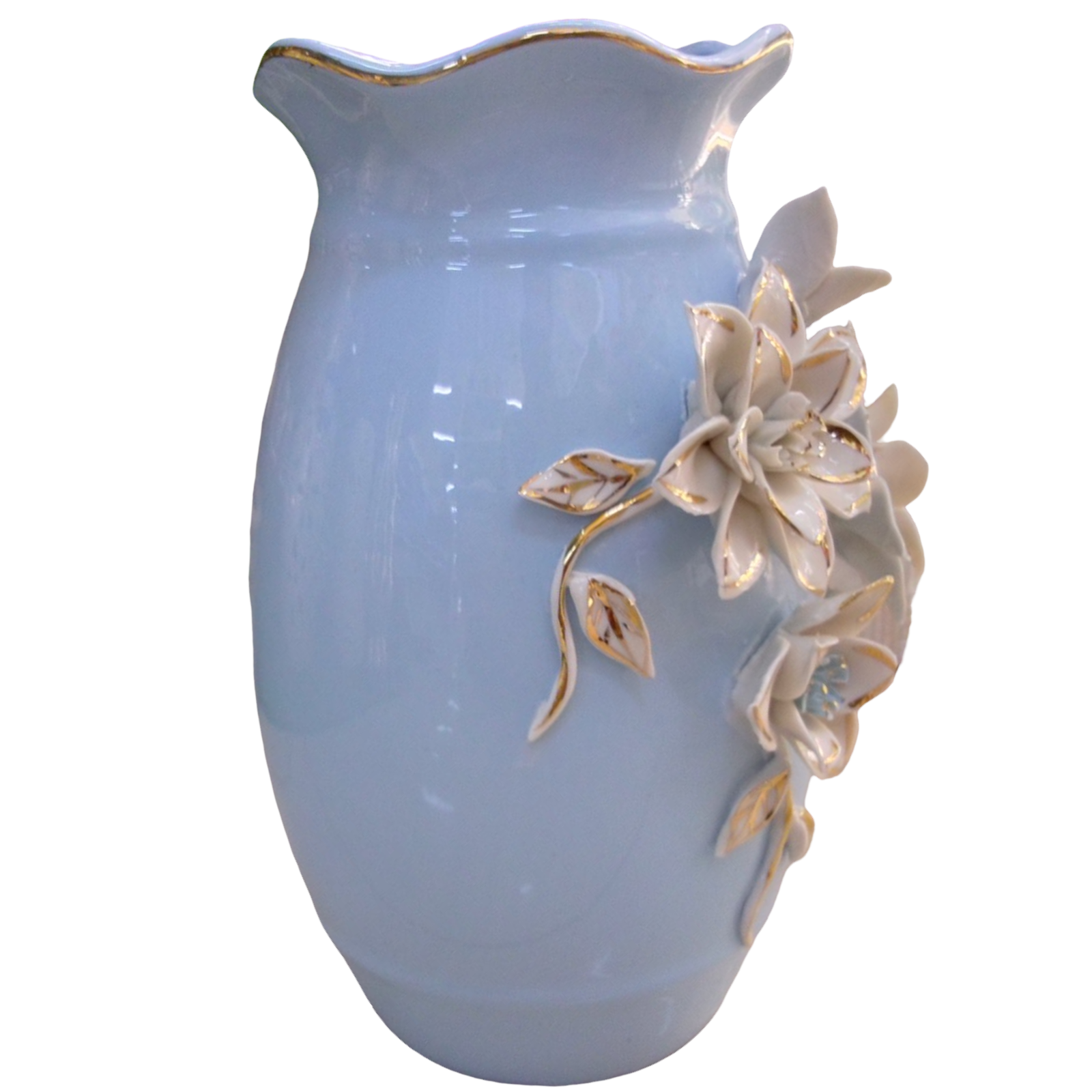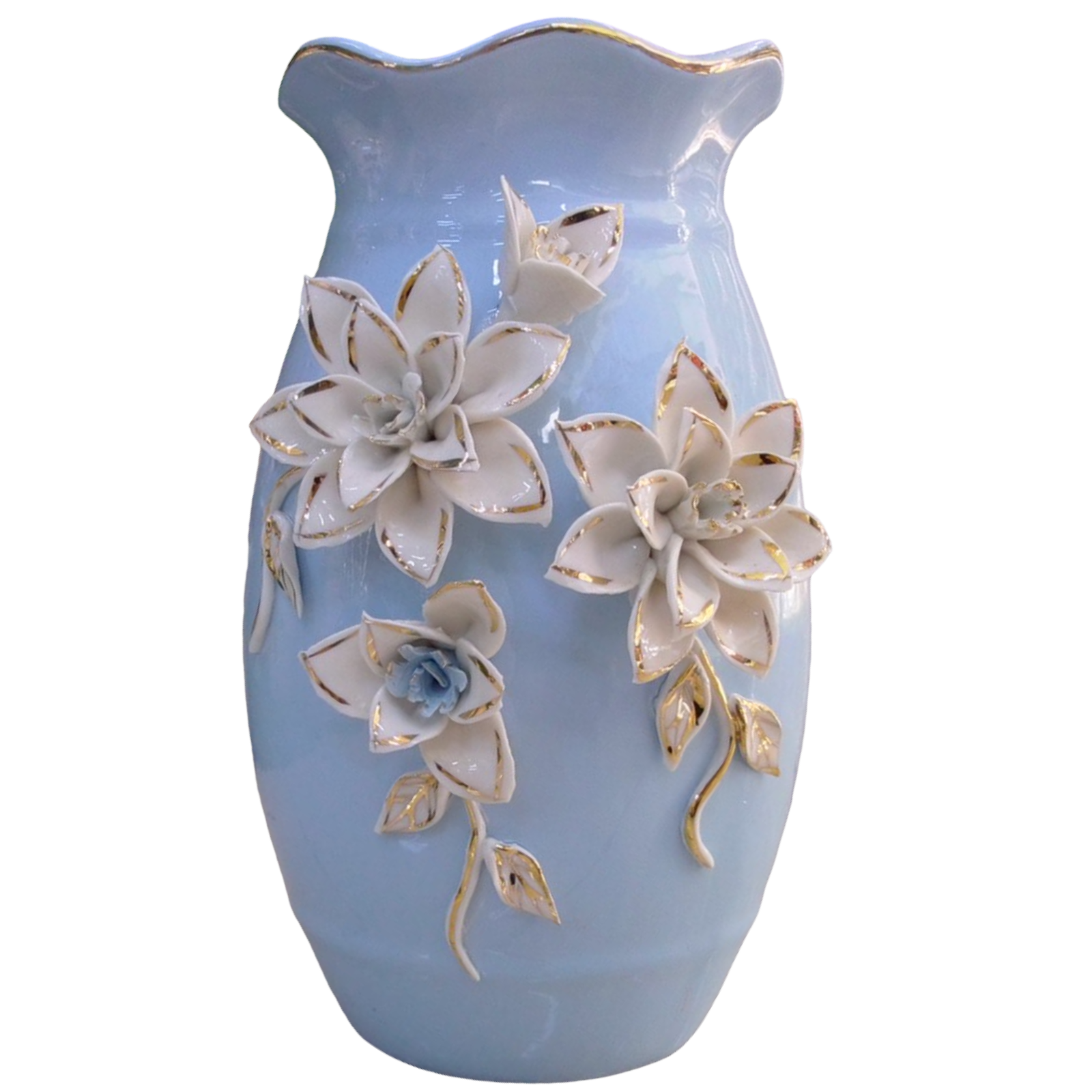 Jarrón de porcelana decorado, color celeste con flores blancas y dorado,