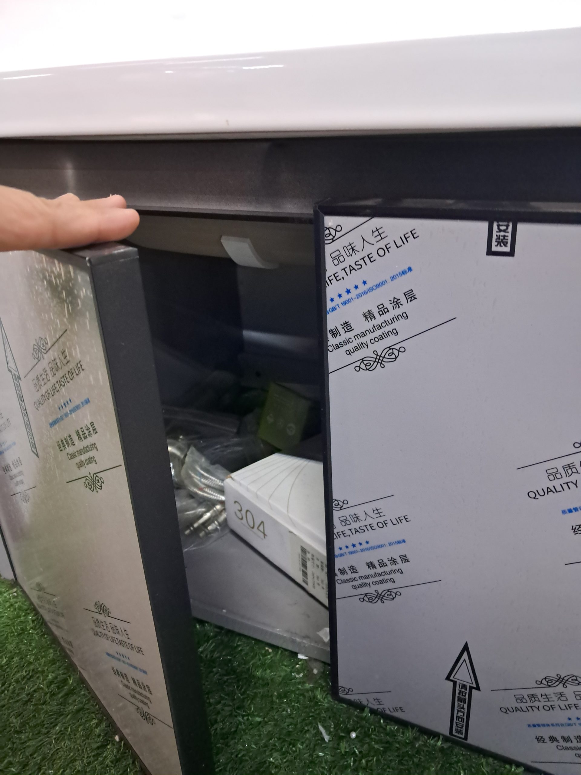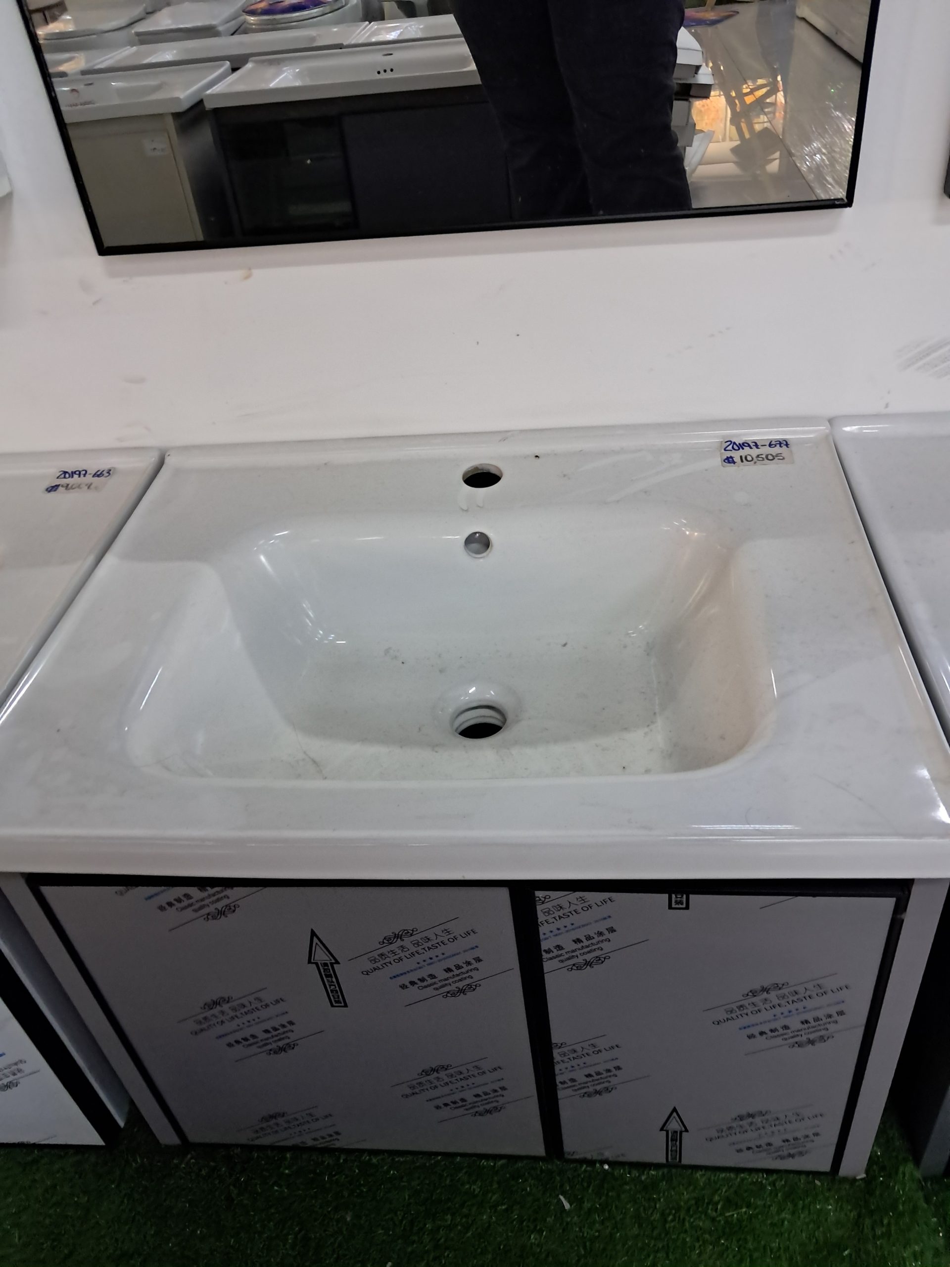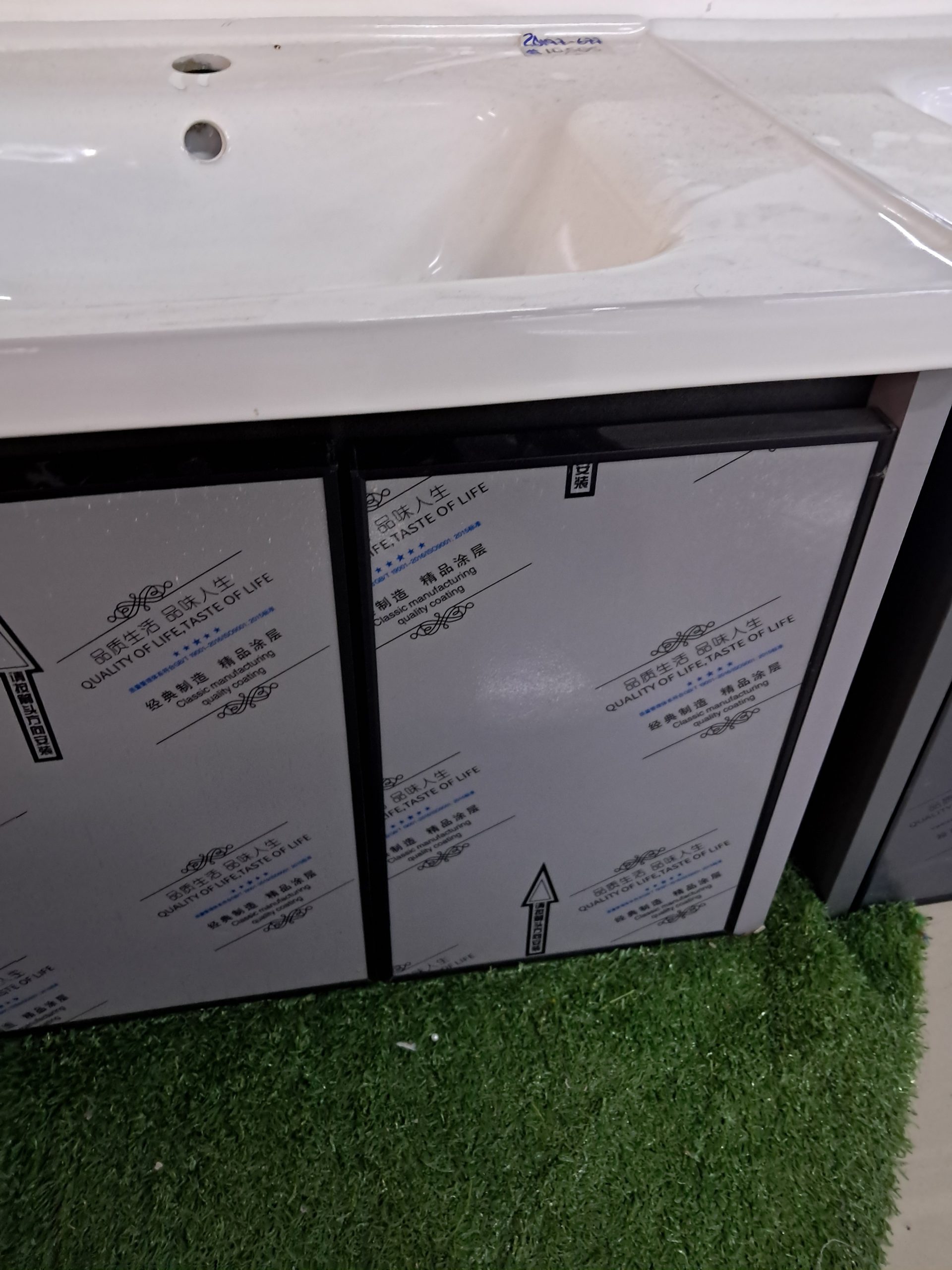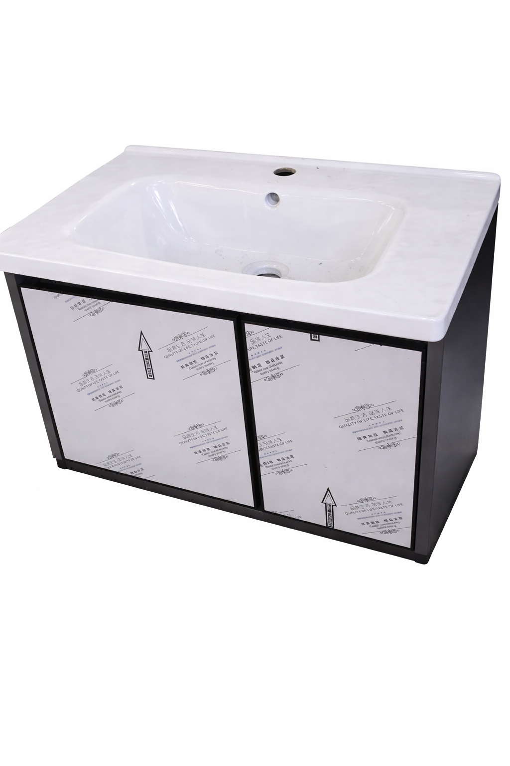 Lavamanos de cerámica blanca con gabinete inferior de almacenamiento. Su diseño moderno combina un lavamanos amplio y resistente con un mueble práctico para organizar artículos de baño