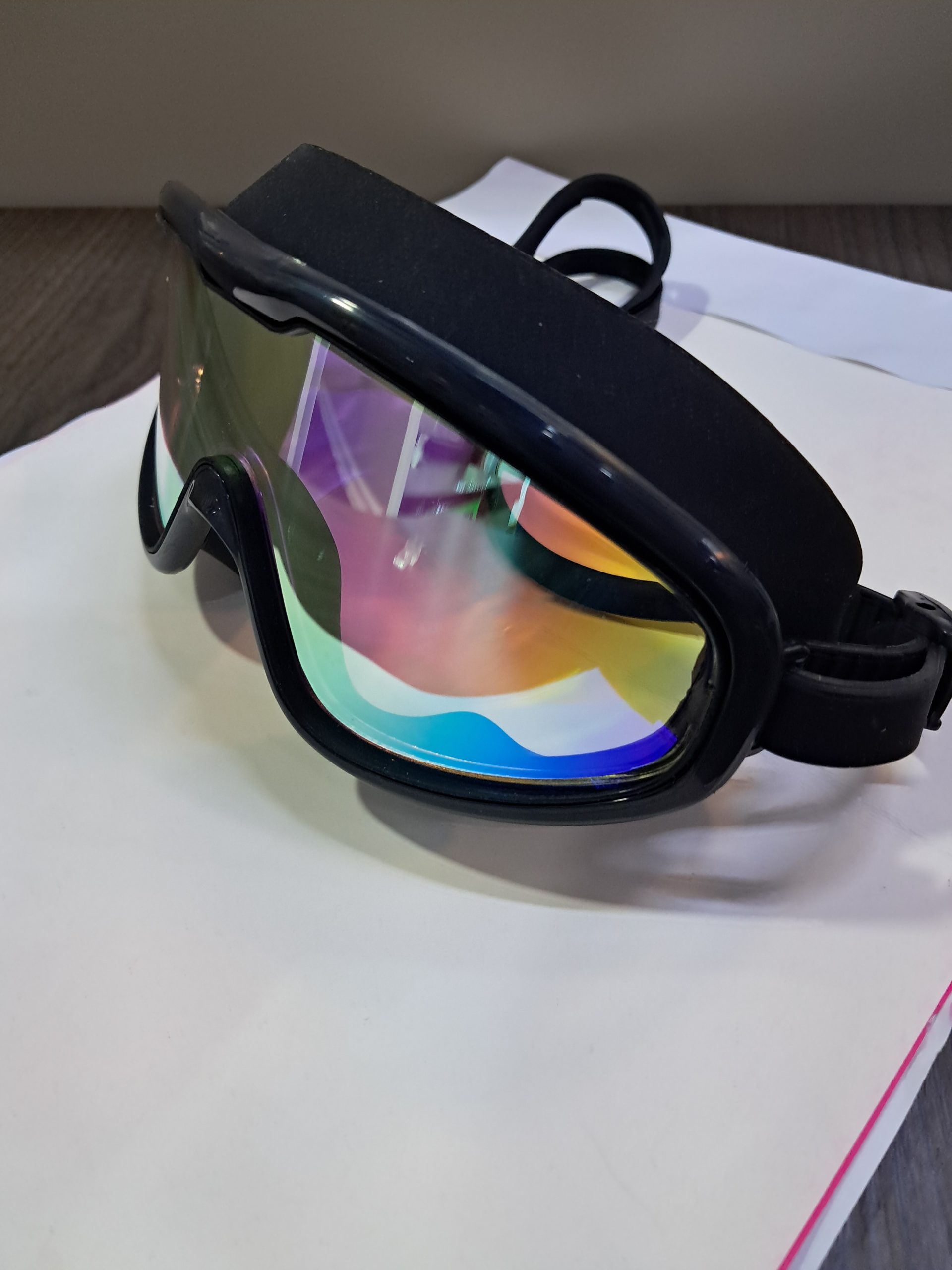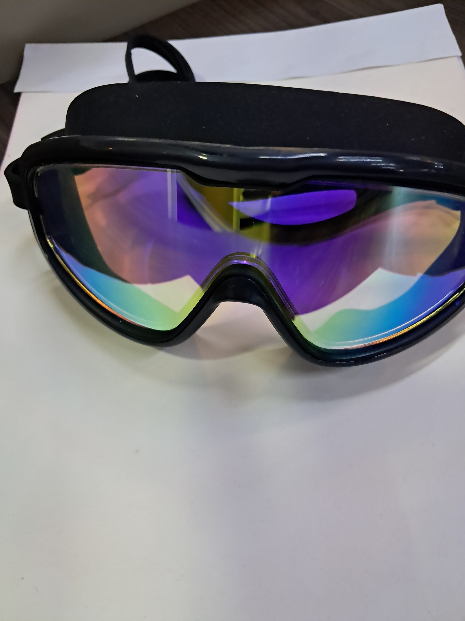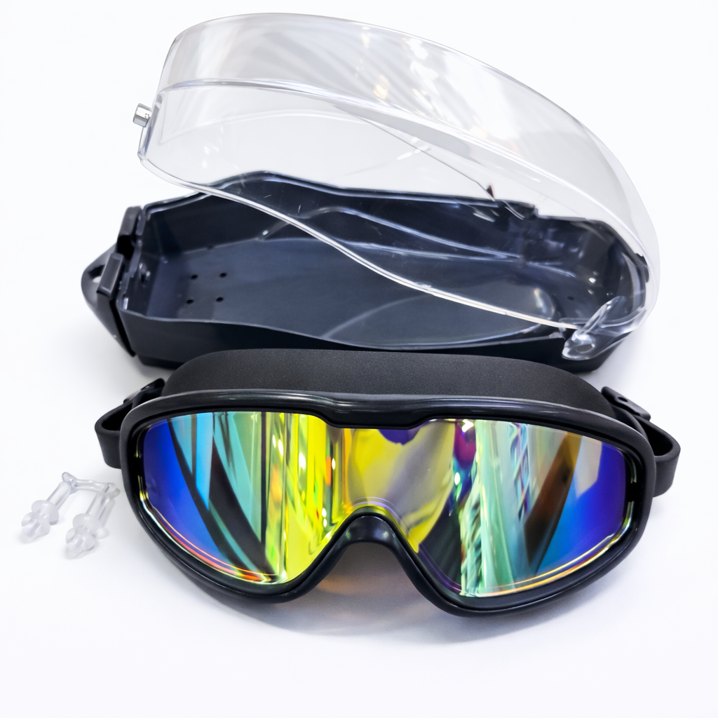 Máscara de natación con lente amplio tipo espejo multicolor, diseñada para ofrecer mayor campo de visión y protección contra la luz durante la natación. Incluye tapones para los oídos y estuche rígido protector para guardarla de forma segura. Su sellado cómodo y correa ajustable brindan un ajuste firme, ideal para piscina y actividades acuáticas.