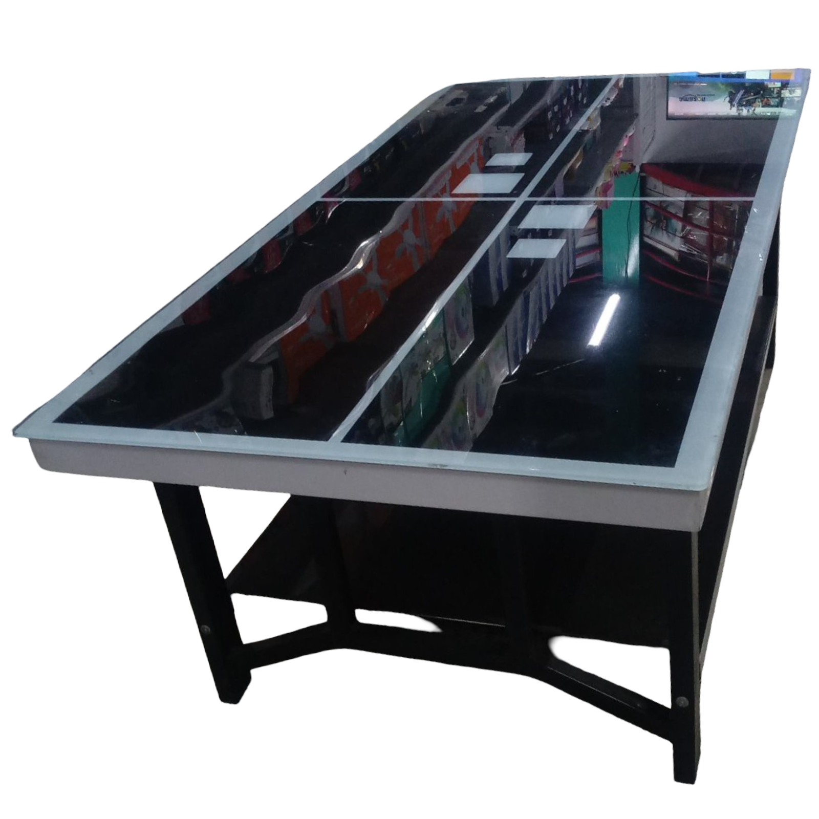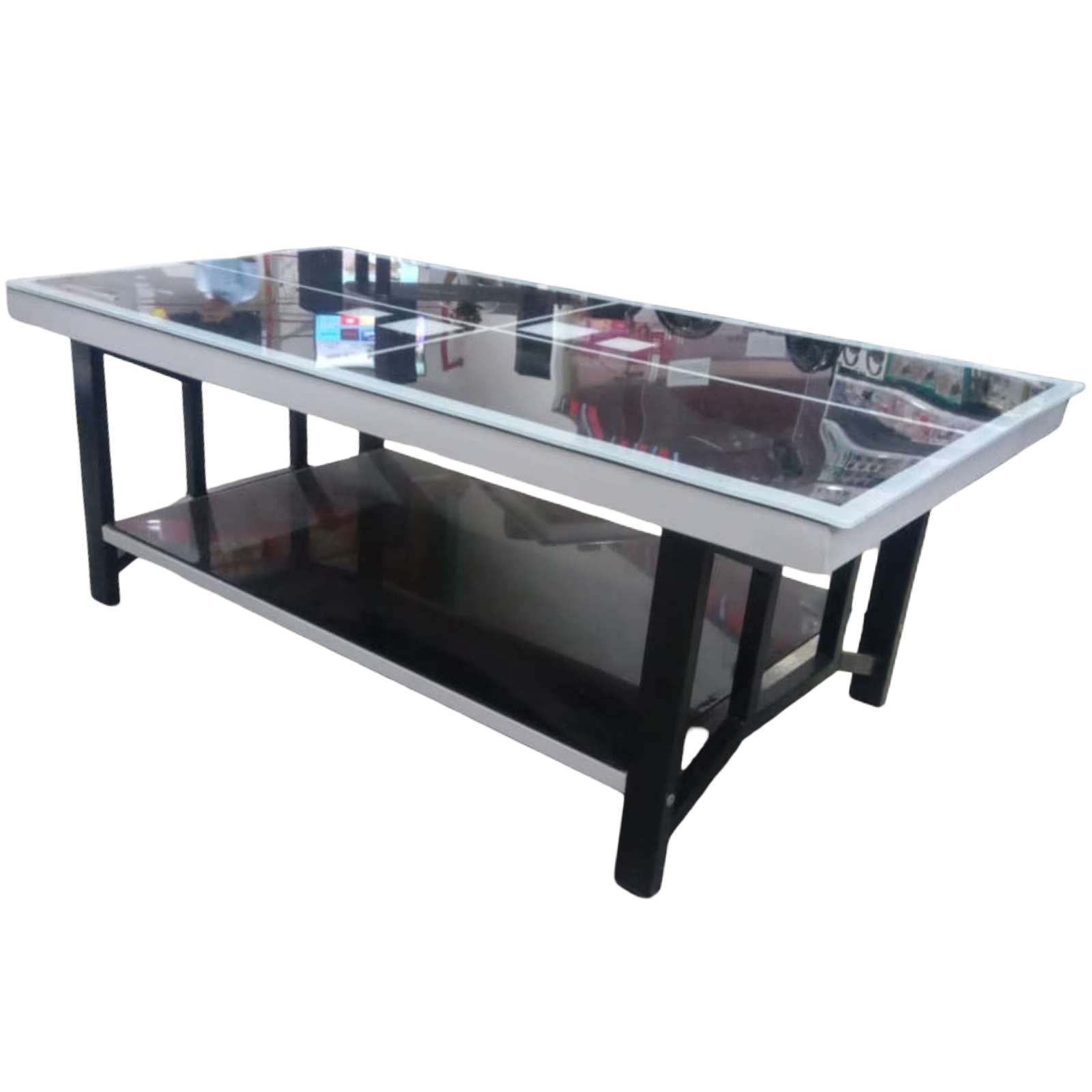 Mesa de vidrio centro de sala, de color negro con decoración en blanco Artículo en promoción. Medidas 110 x 55 x 40 cm.
