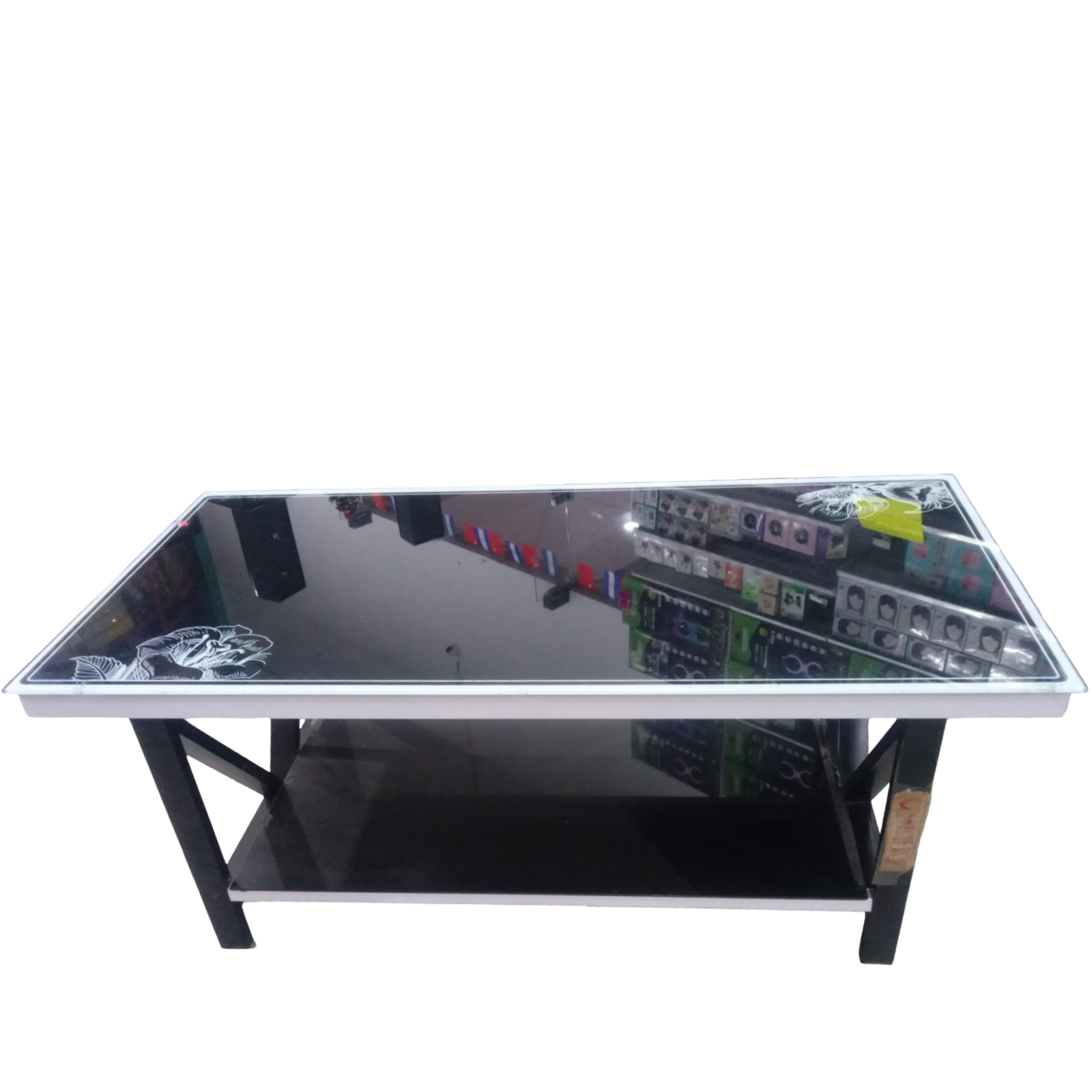 Mesita centro de sala, vidrio temperado color negro con blanco, su medidas 110 x 55 x 44 cm, artículo en promoción