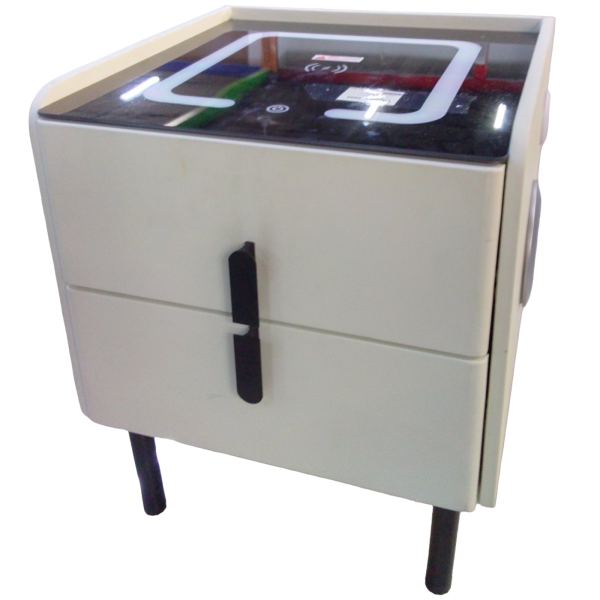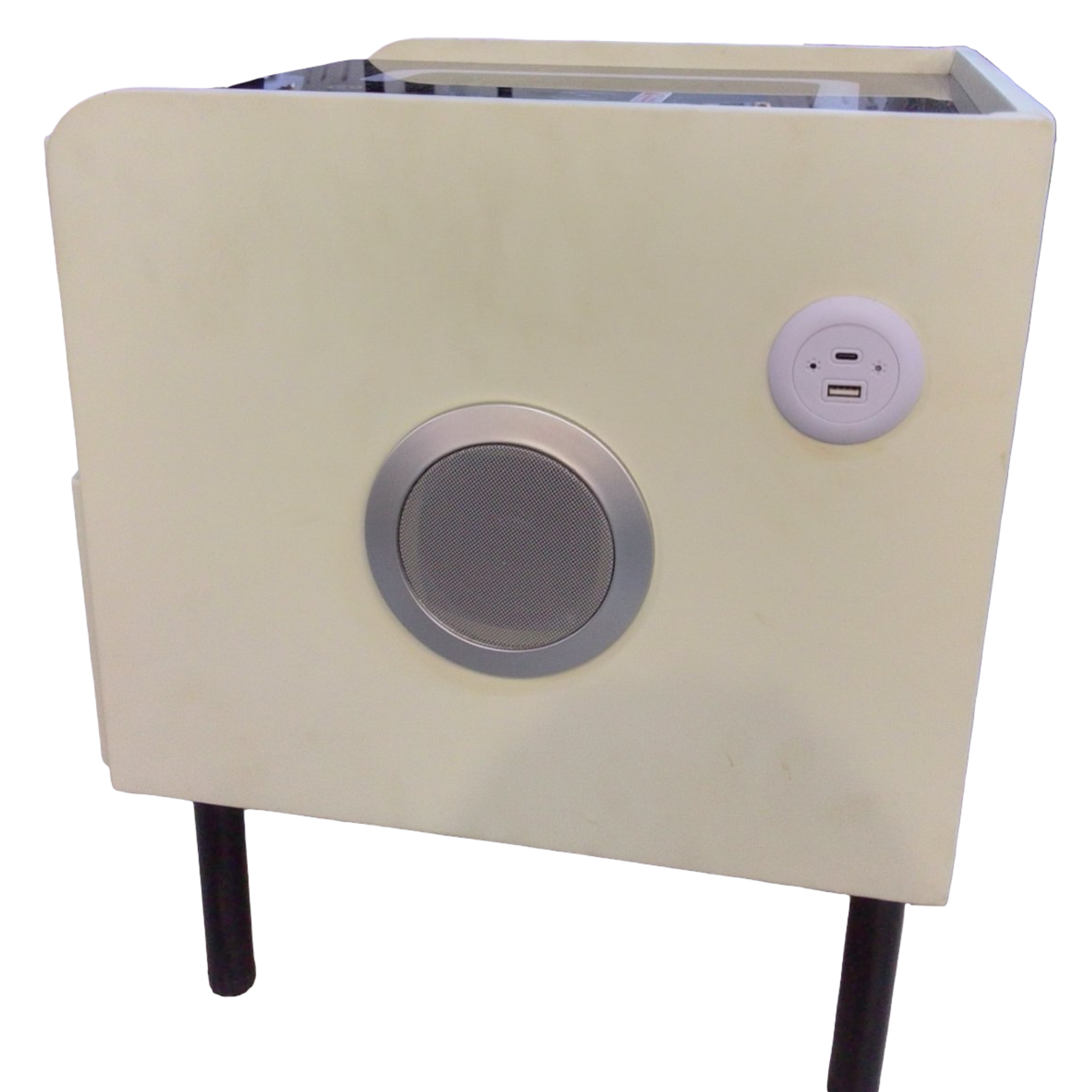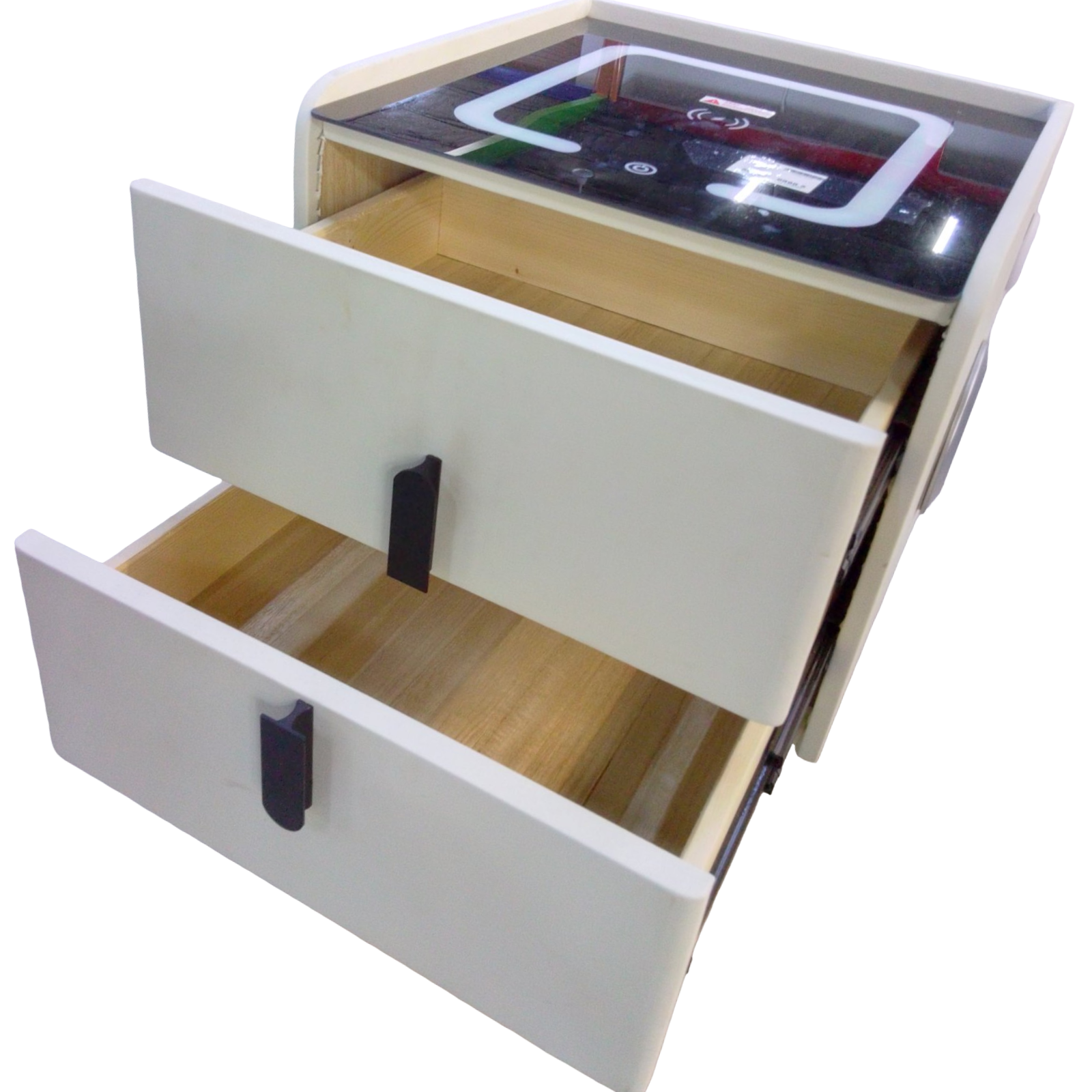 Mesita de noche inteligente, recarga celular, vía Bluetooth con parlante incorporado para escuchar música. Color beige, tiene 2 gaveteros, medidas 40 x 40 x 47 cm,