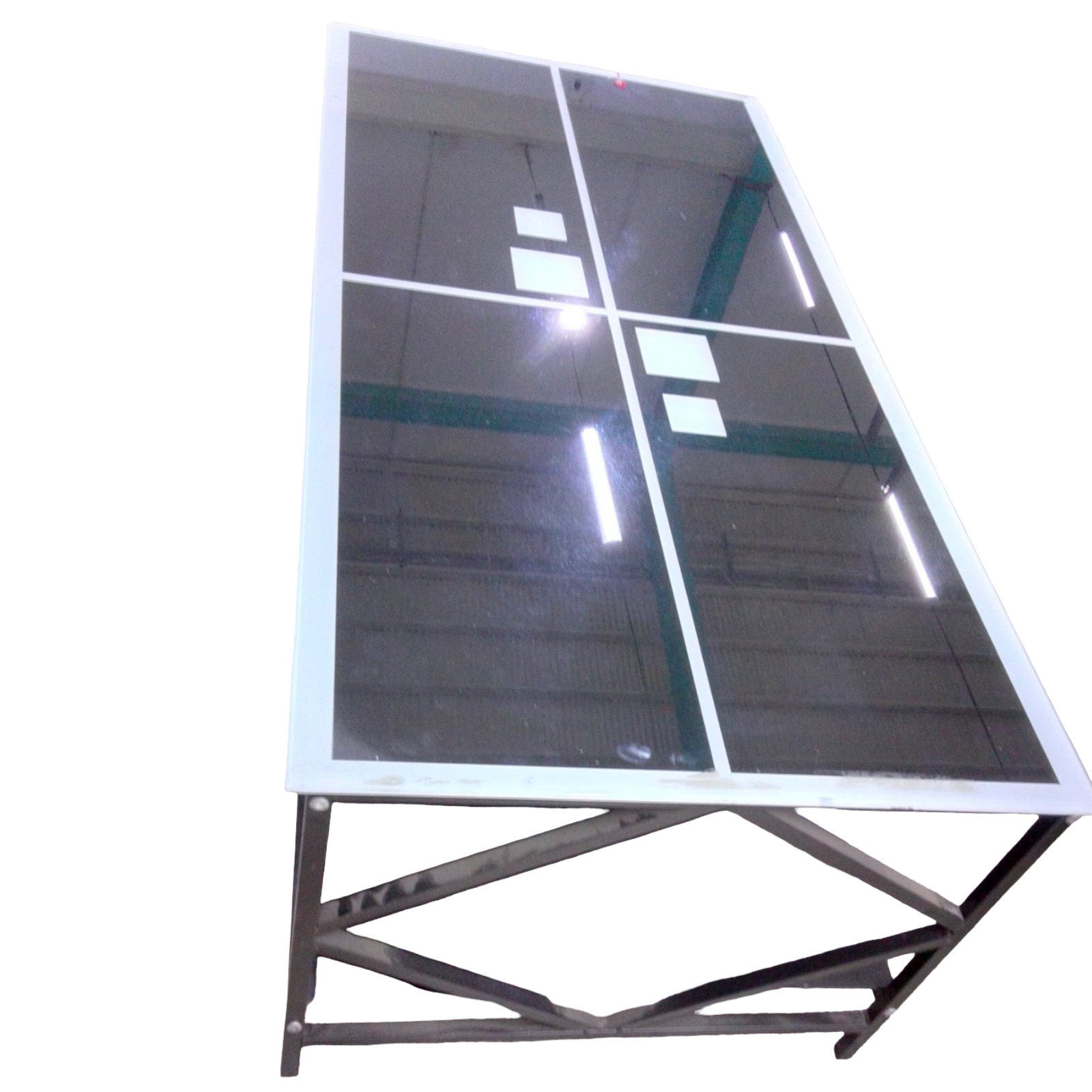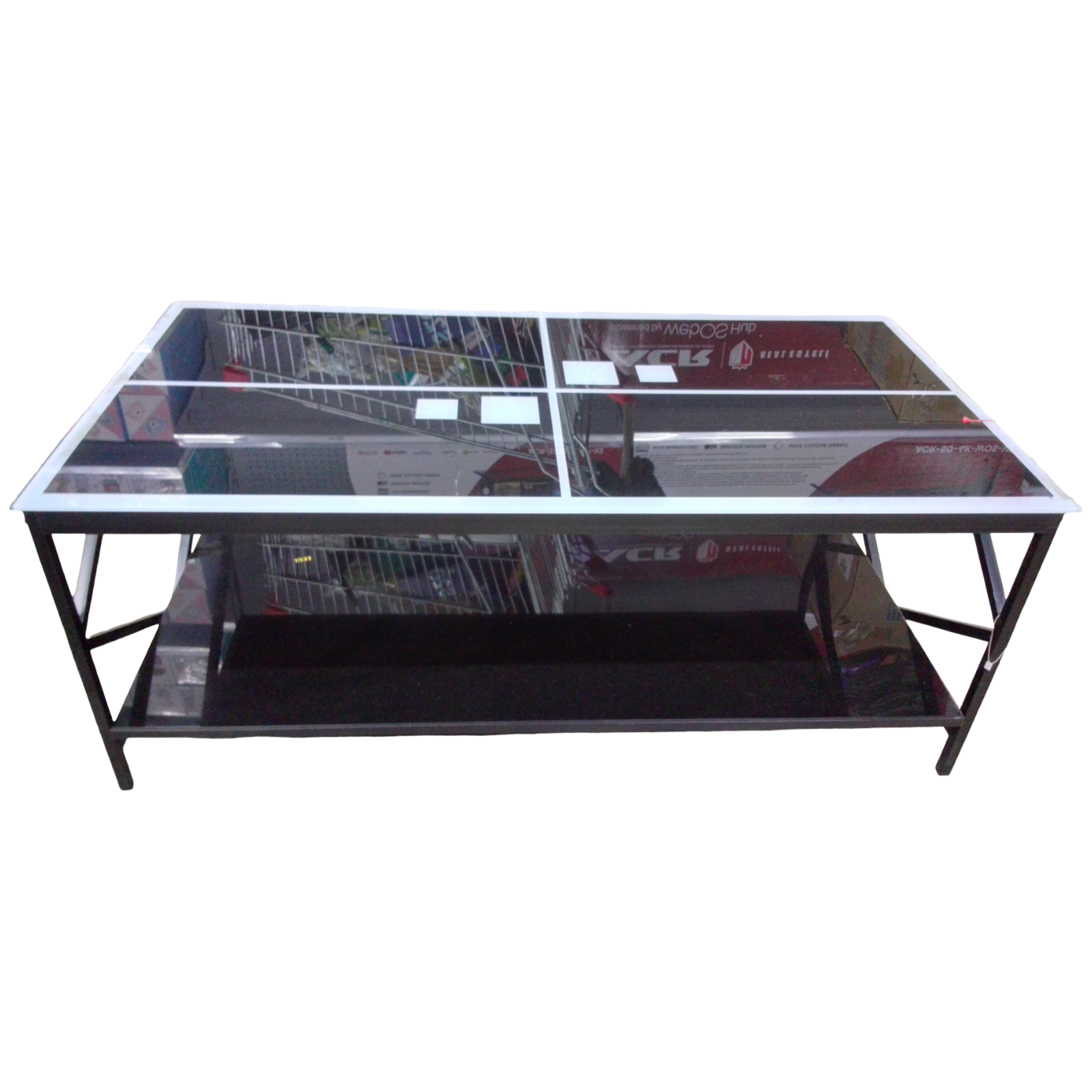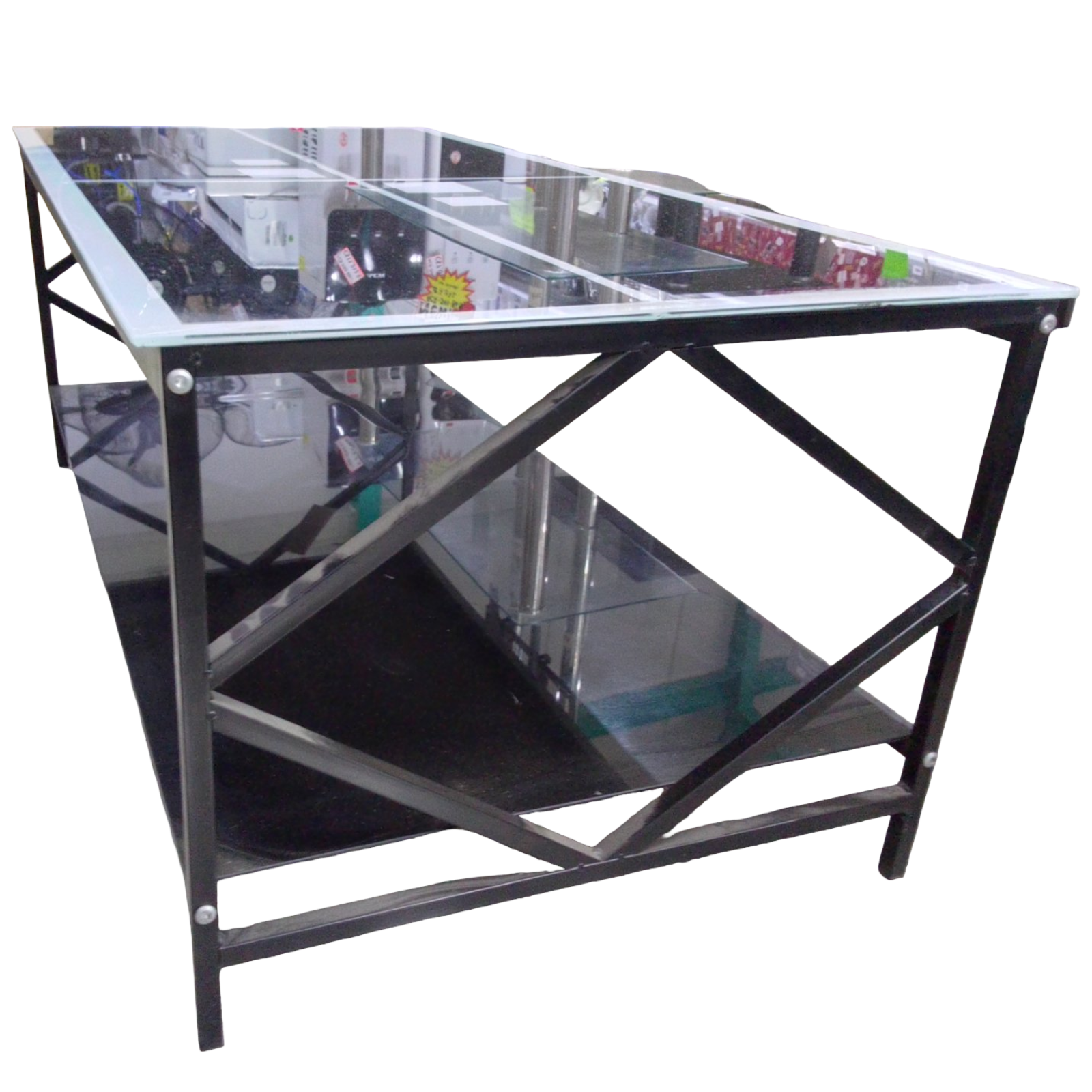 Mesita de vidrio temperado de color negro con blanco, medidas 110 x 55 x 44 cm, con repisa abajo base de metal. Artículo en promoción.
