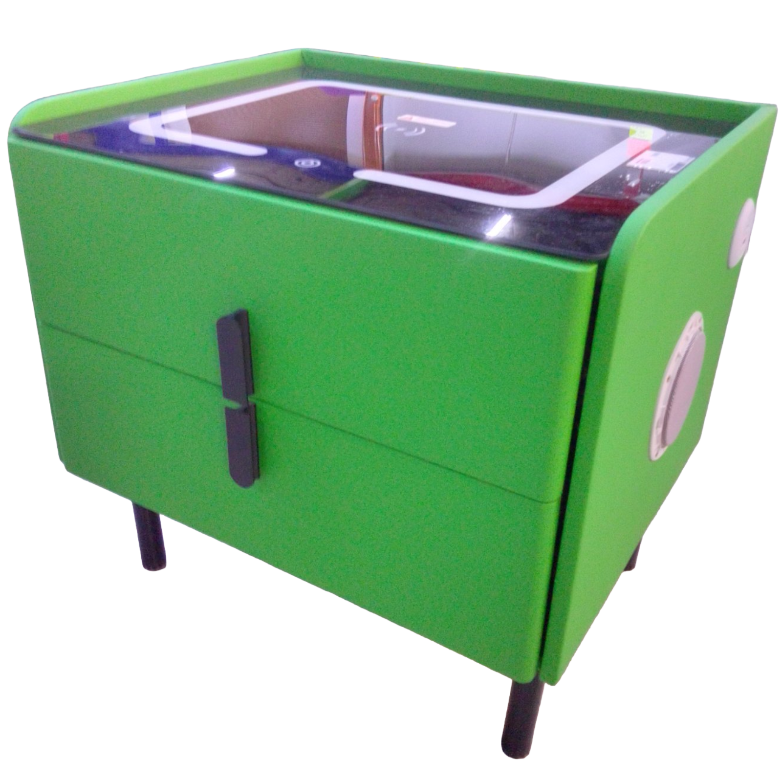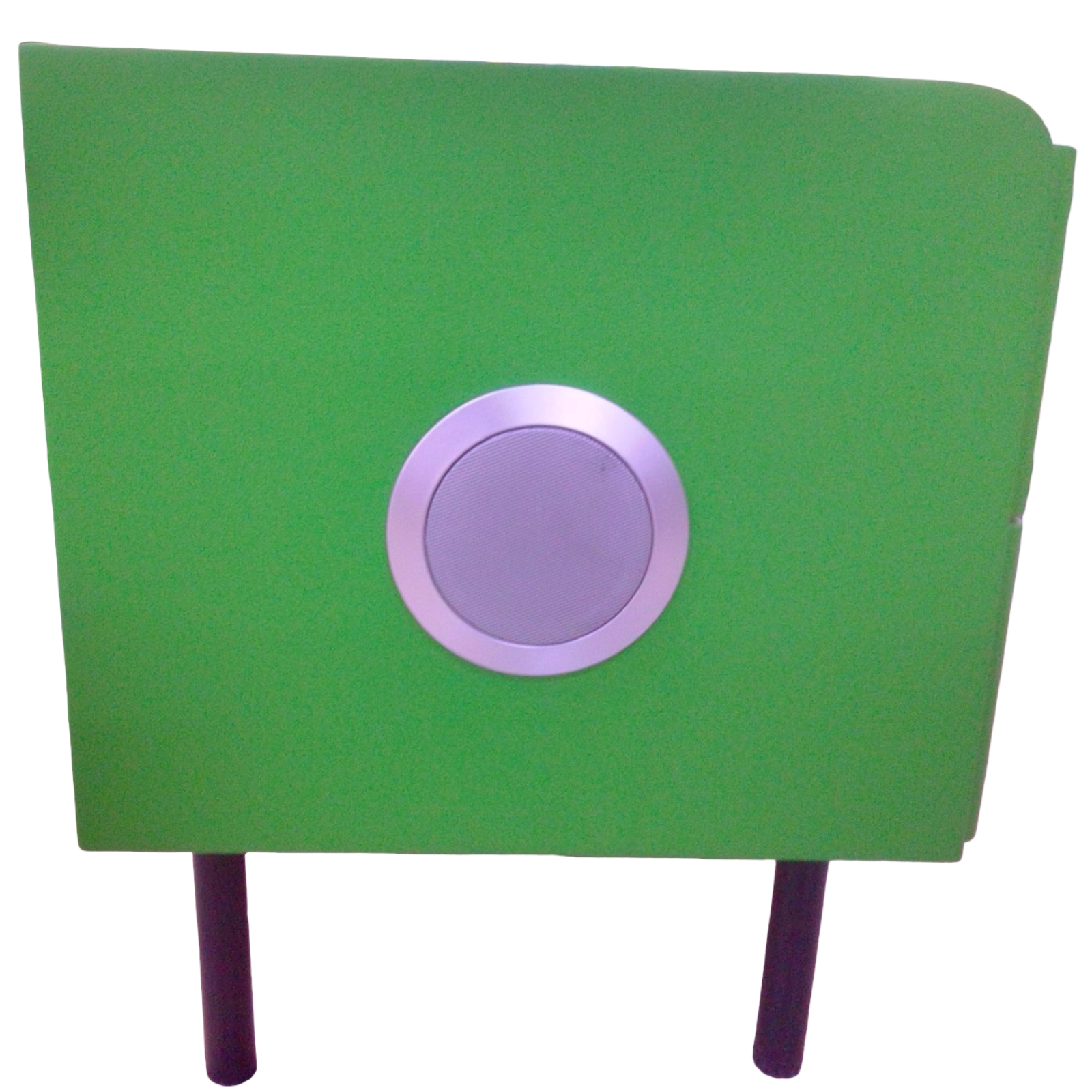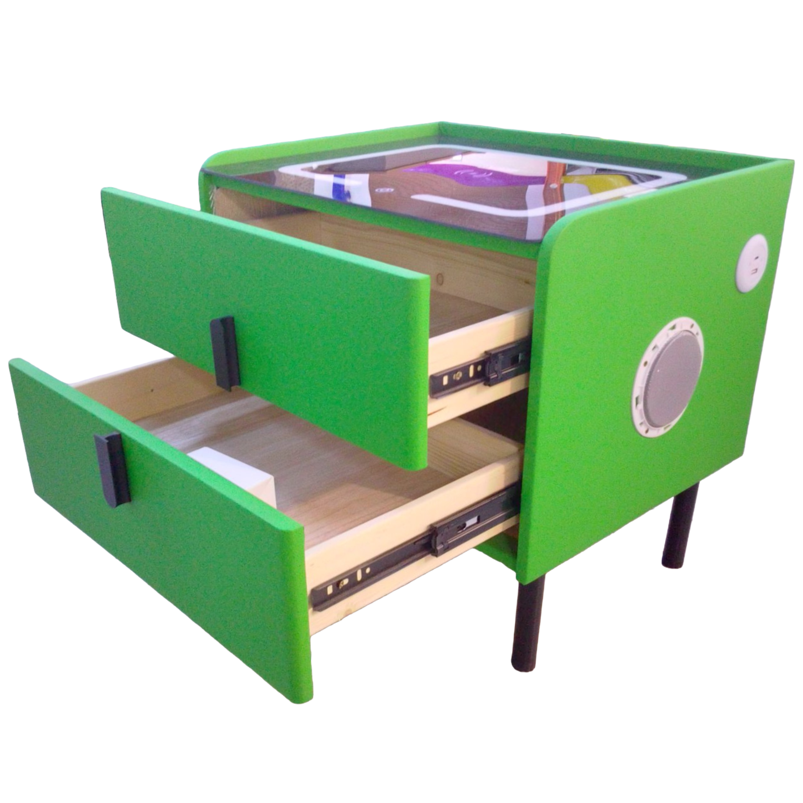 Mesita de noche inteligente, color verde con 2 gaveteros, parlantes conector bluetooth escuchar música y recargar celular, medidas 50 x 40 x 47 cm, base superior de la mesita de vidrio lumínica.
