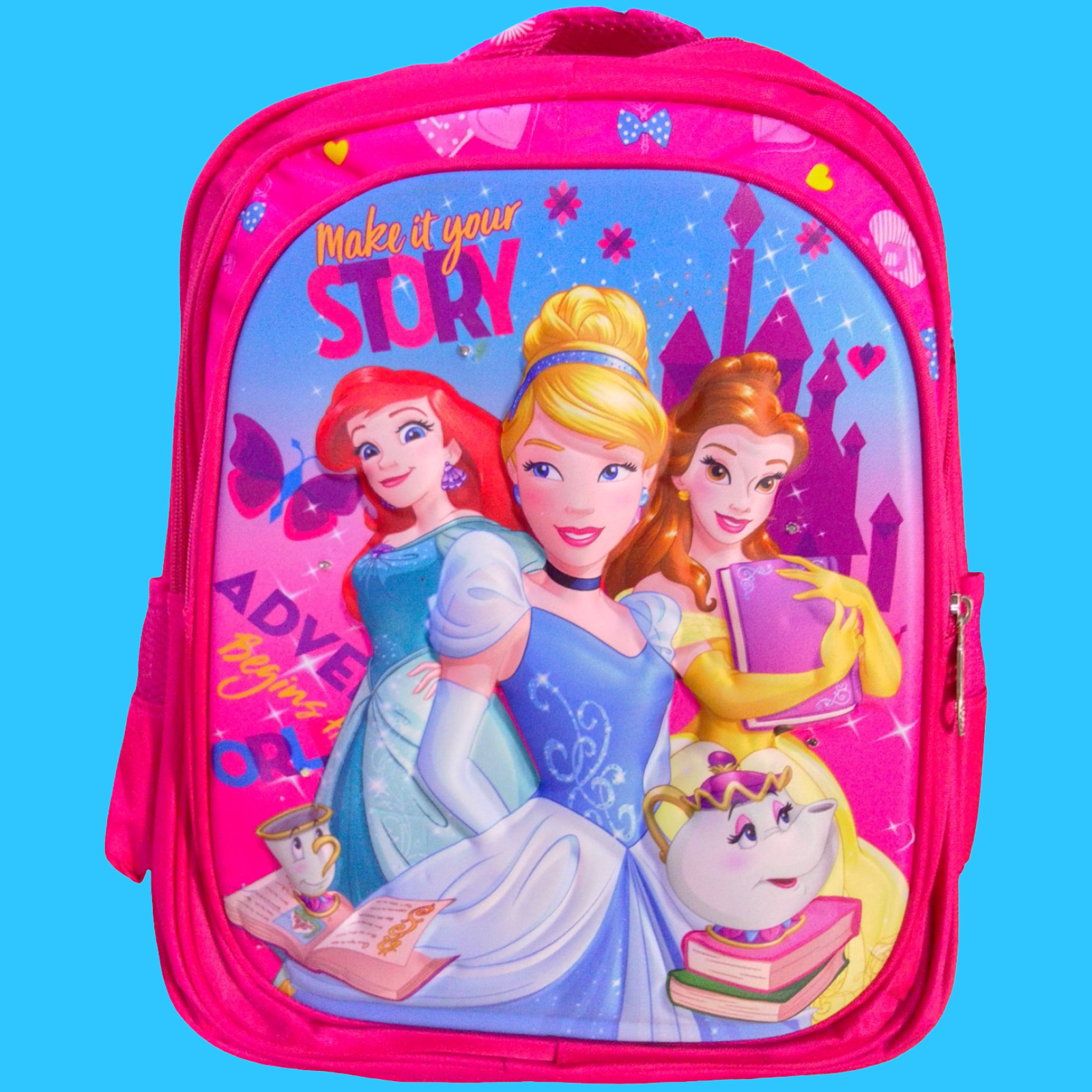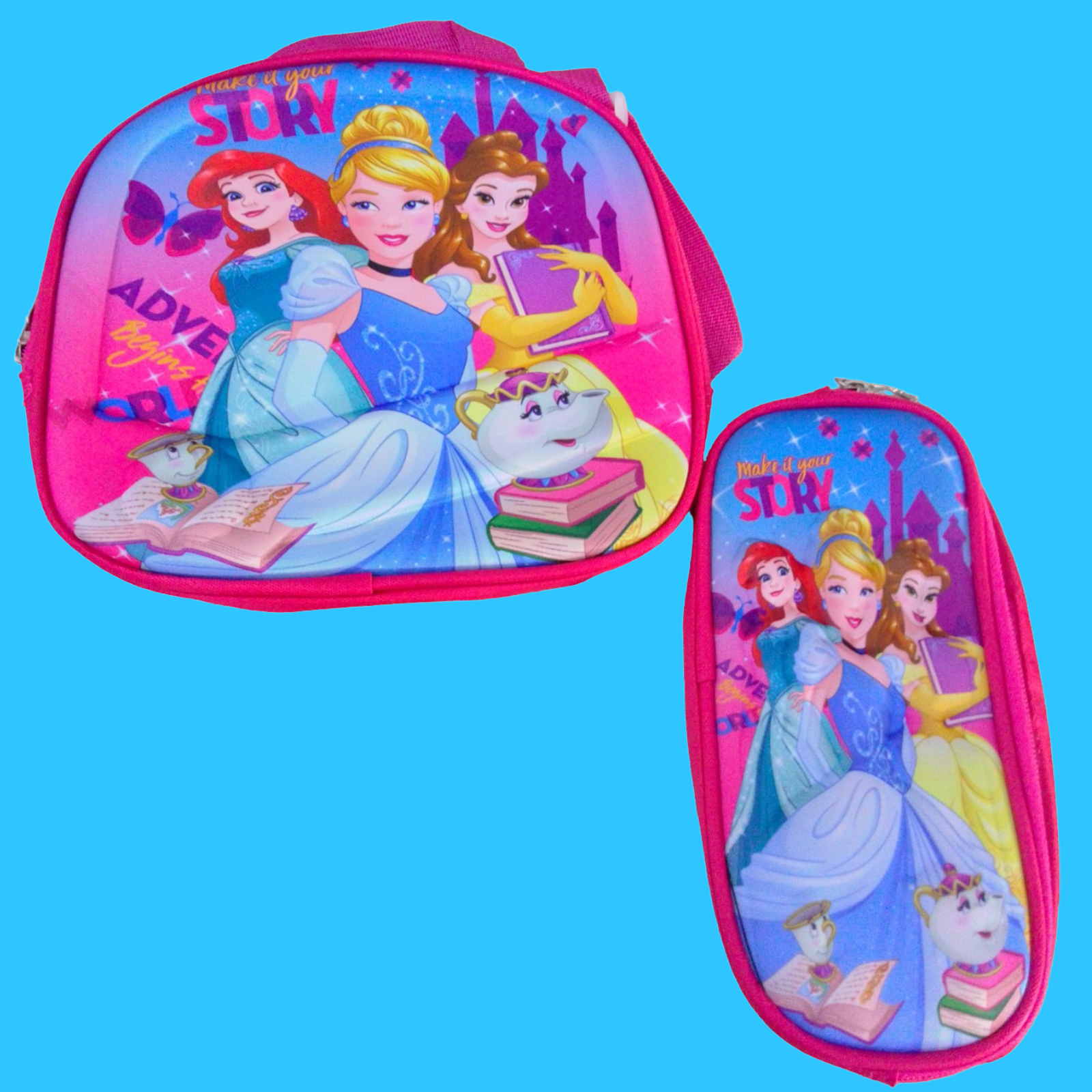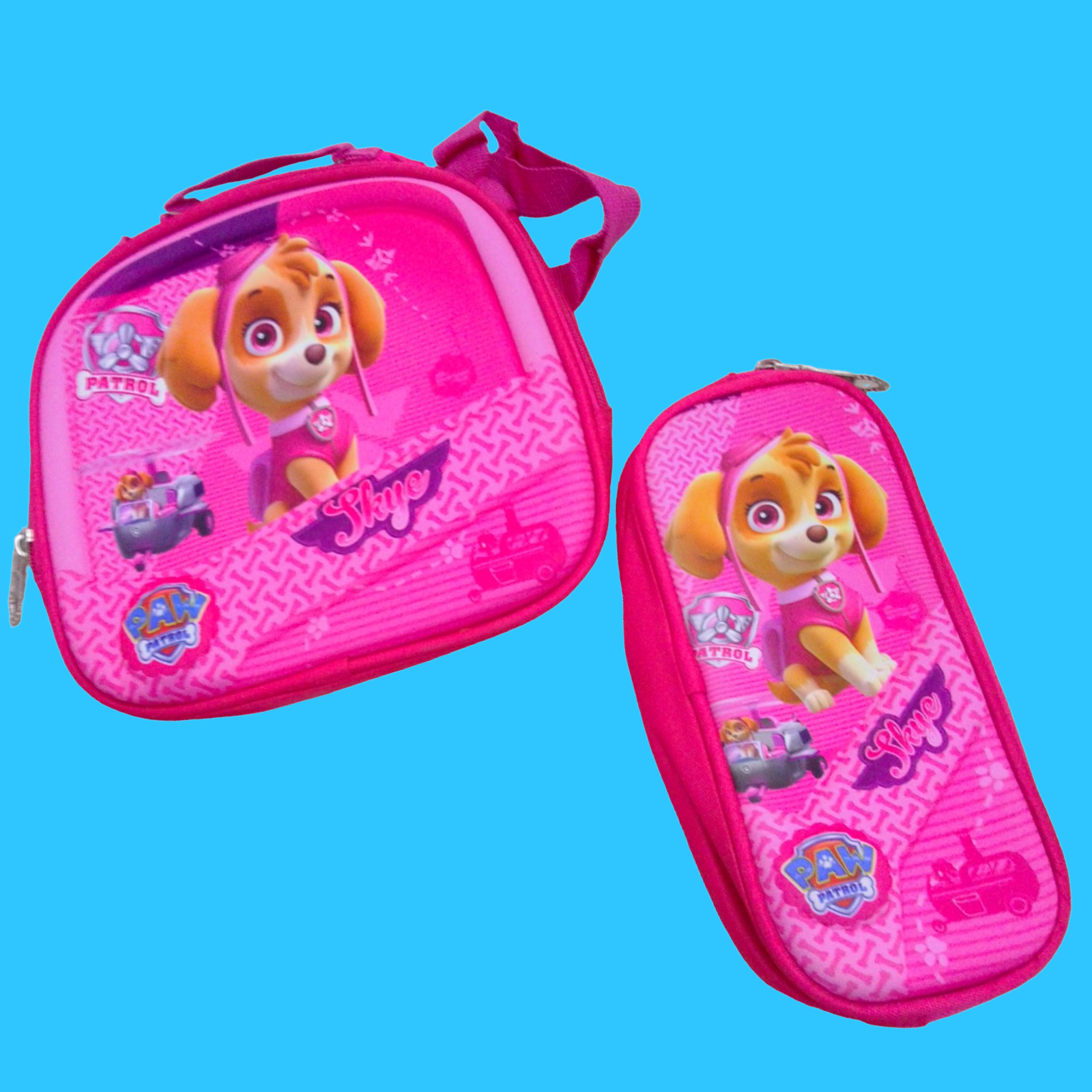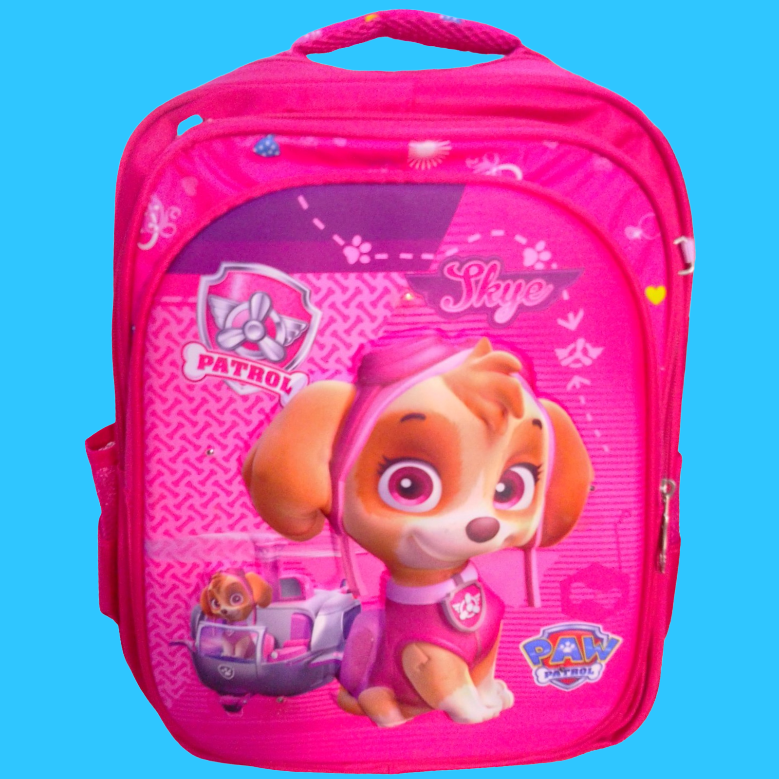 MOCHILAS ESCOLARES, CON FIGURAS DE PRINCESAS Y SKY DE PAW PATROL. CADA UNA DE ELLAS TIENE SU LO CHERAS DE ALIMENTOS Y CARTUCHERAS Y TIENEN LUCES AL FRENTE.