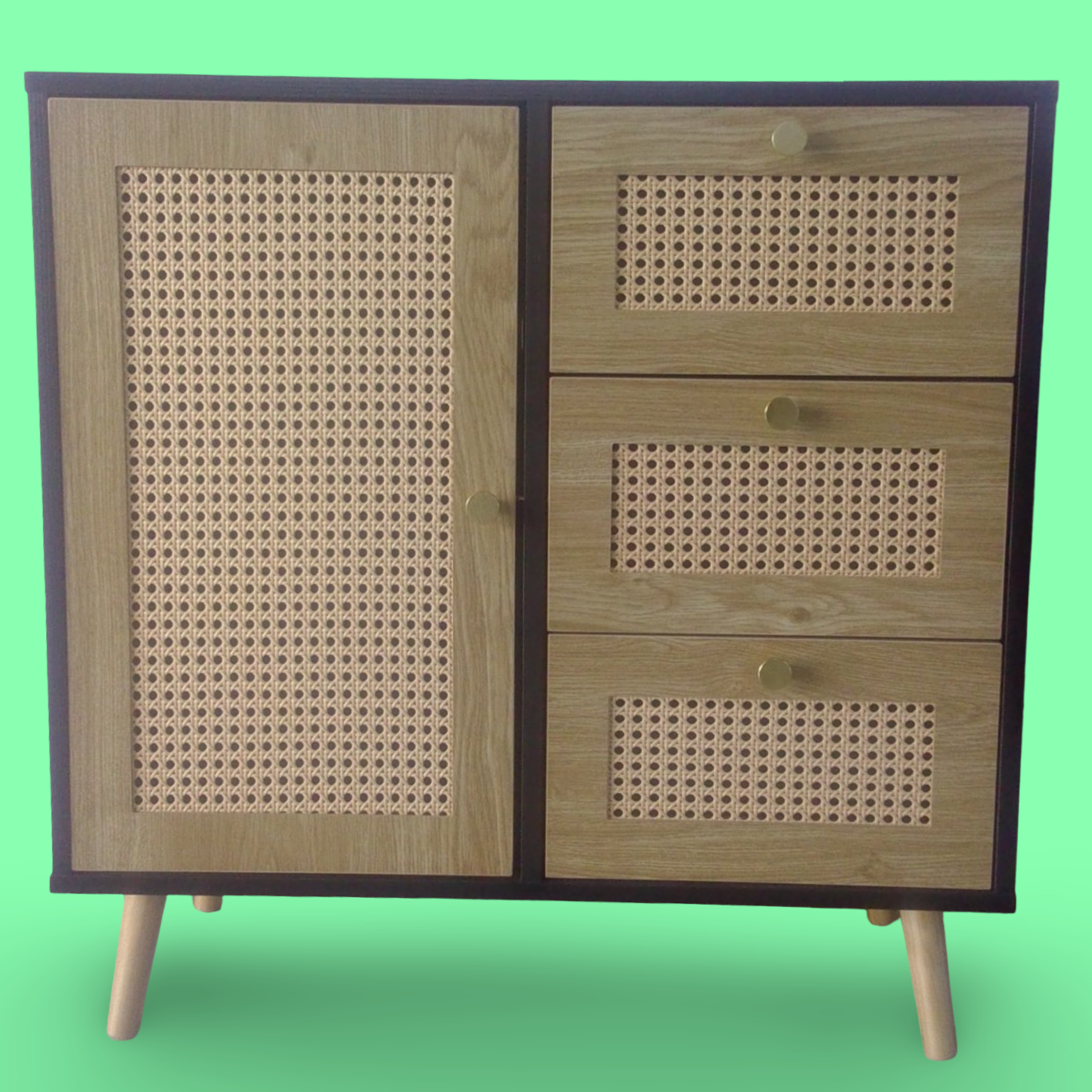 Color negro, tiene 1 puerta, 3 gavetas, sus medidas son, 35x75x76 cm.