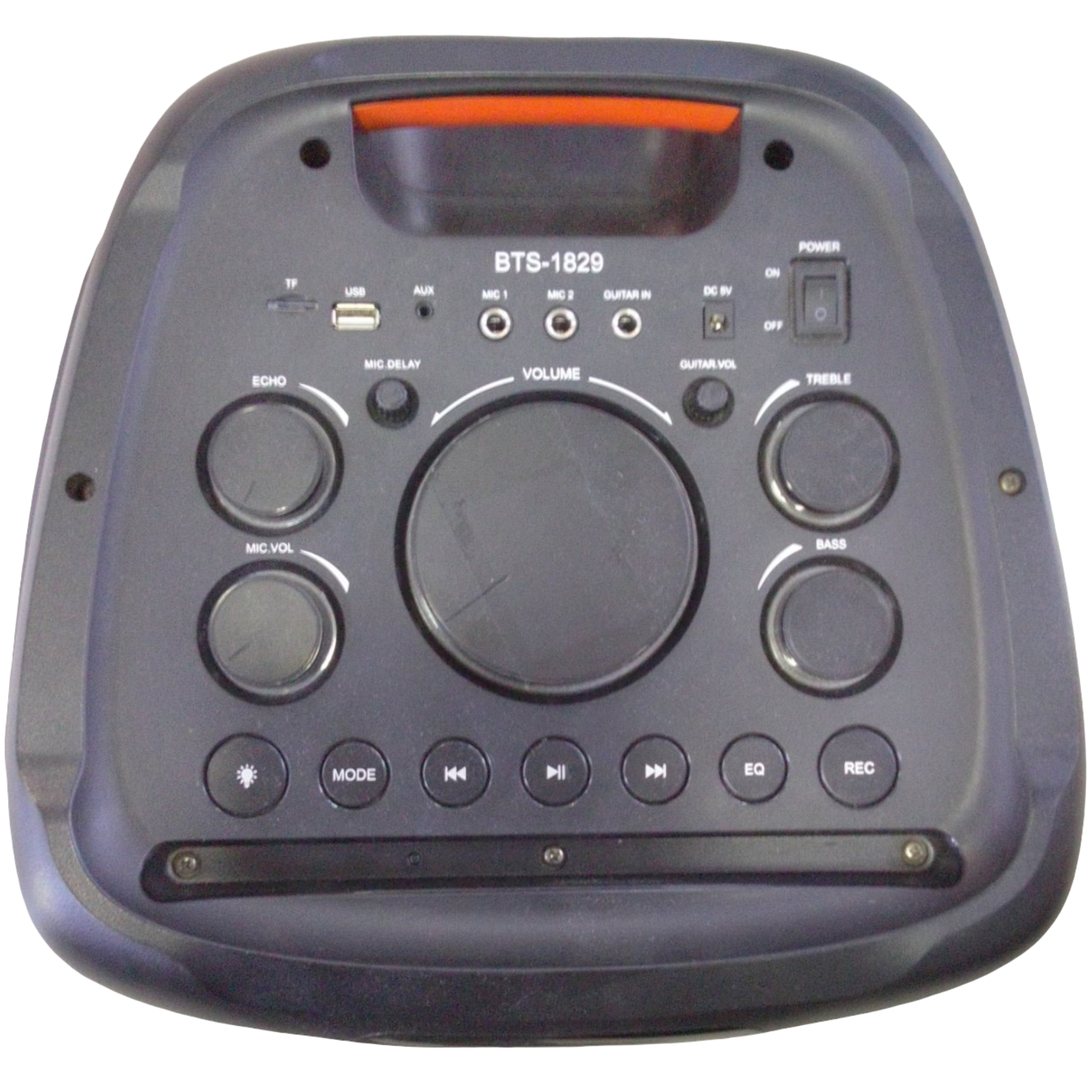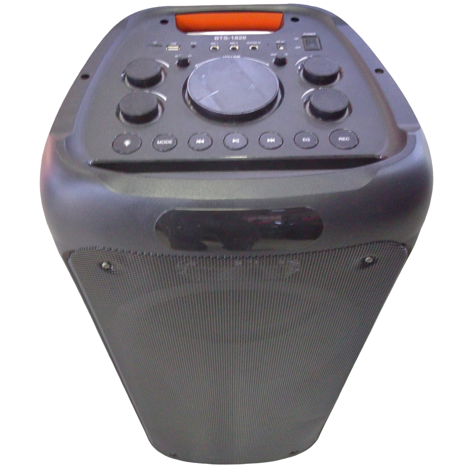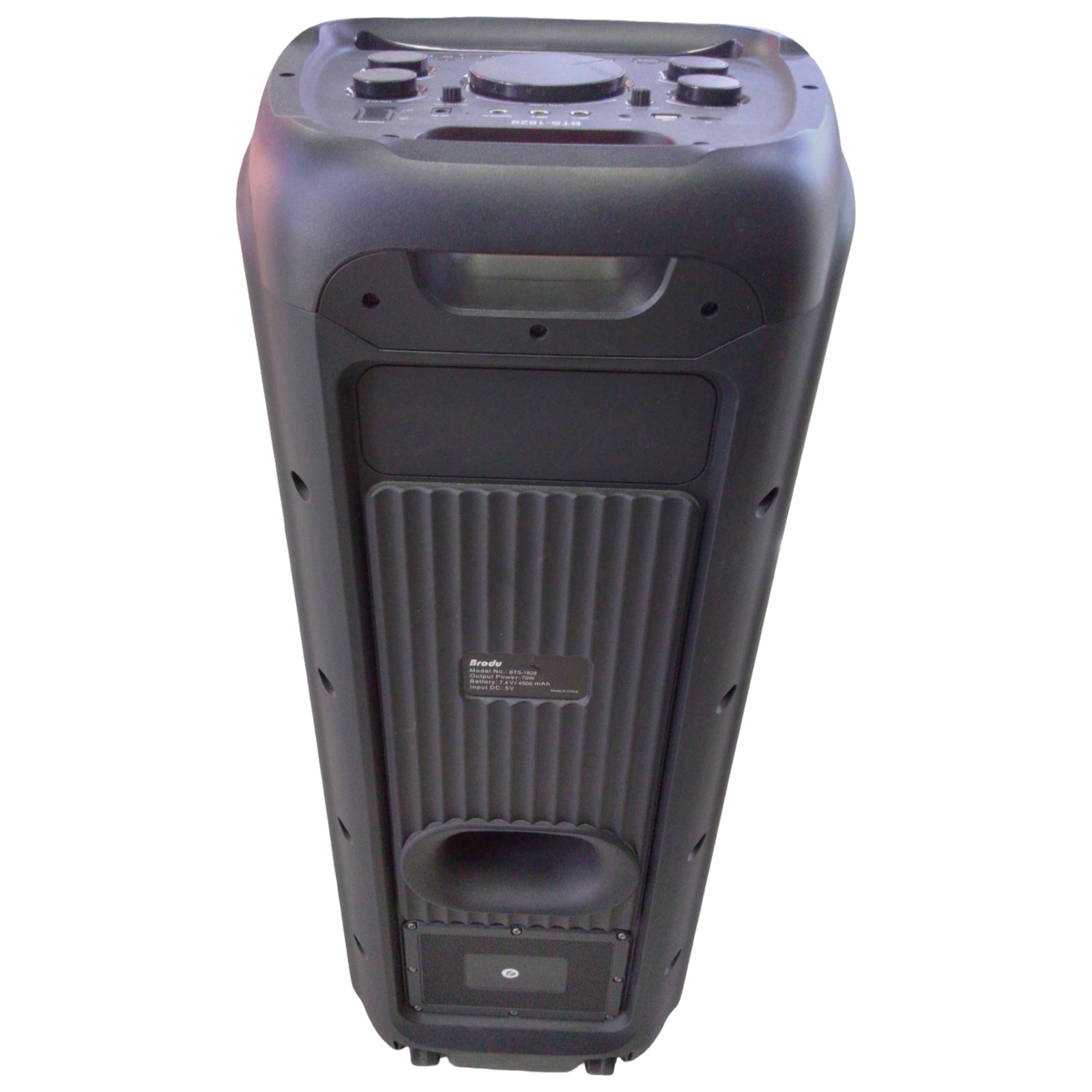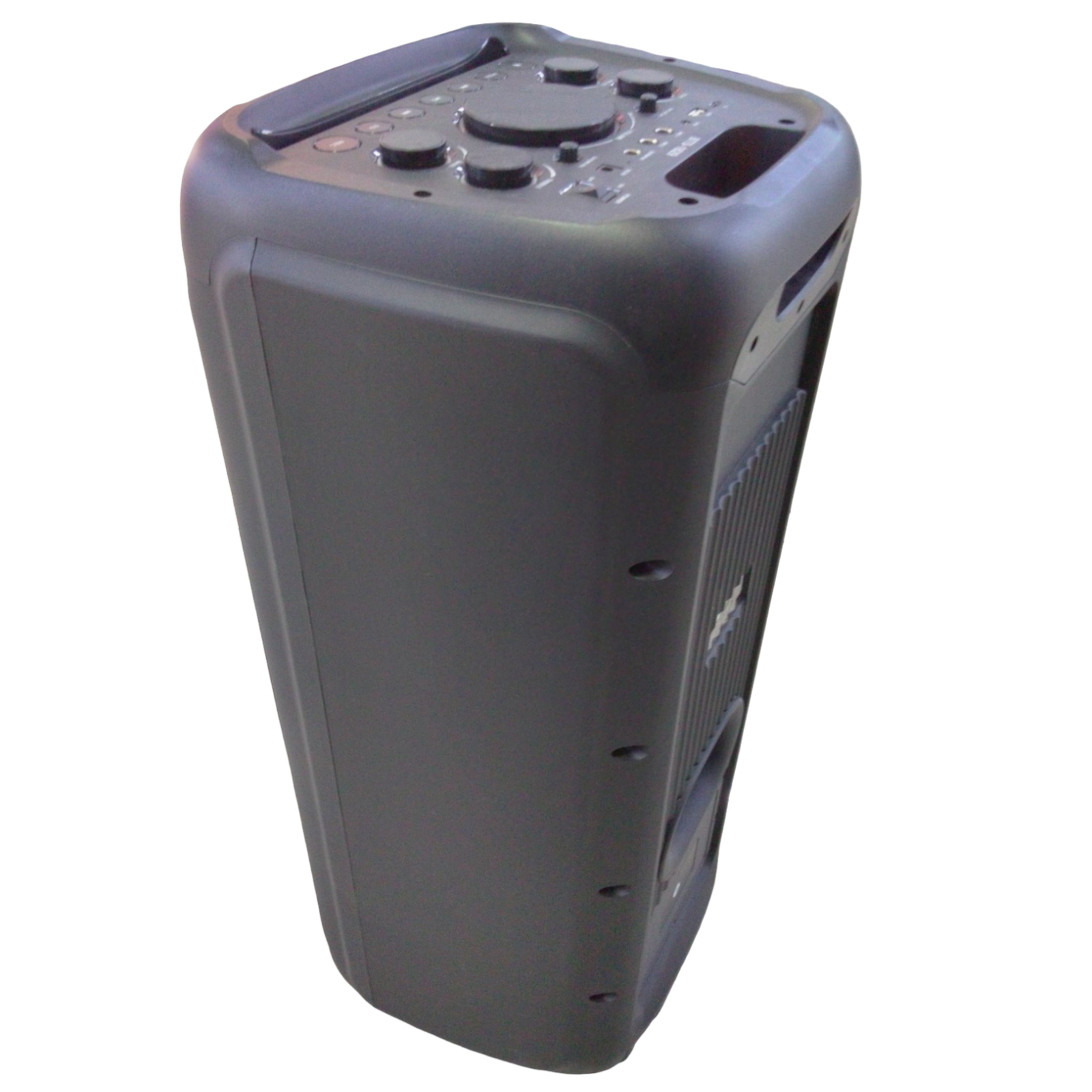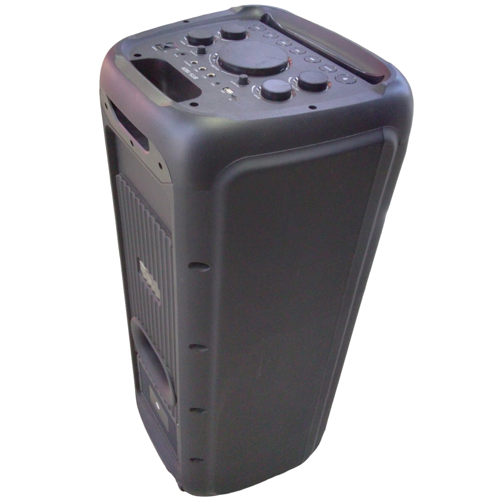 Parlante recargable portátil, panel de control de sonidos, entrada USB y micro SD, switch de encendido, luces led inteligente, medidas 85 x 33 x 35 cm, color negro, salida de 70 w.