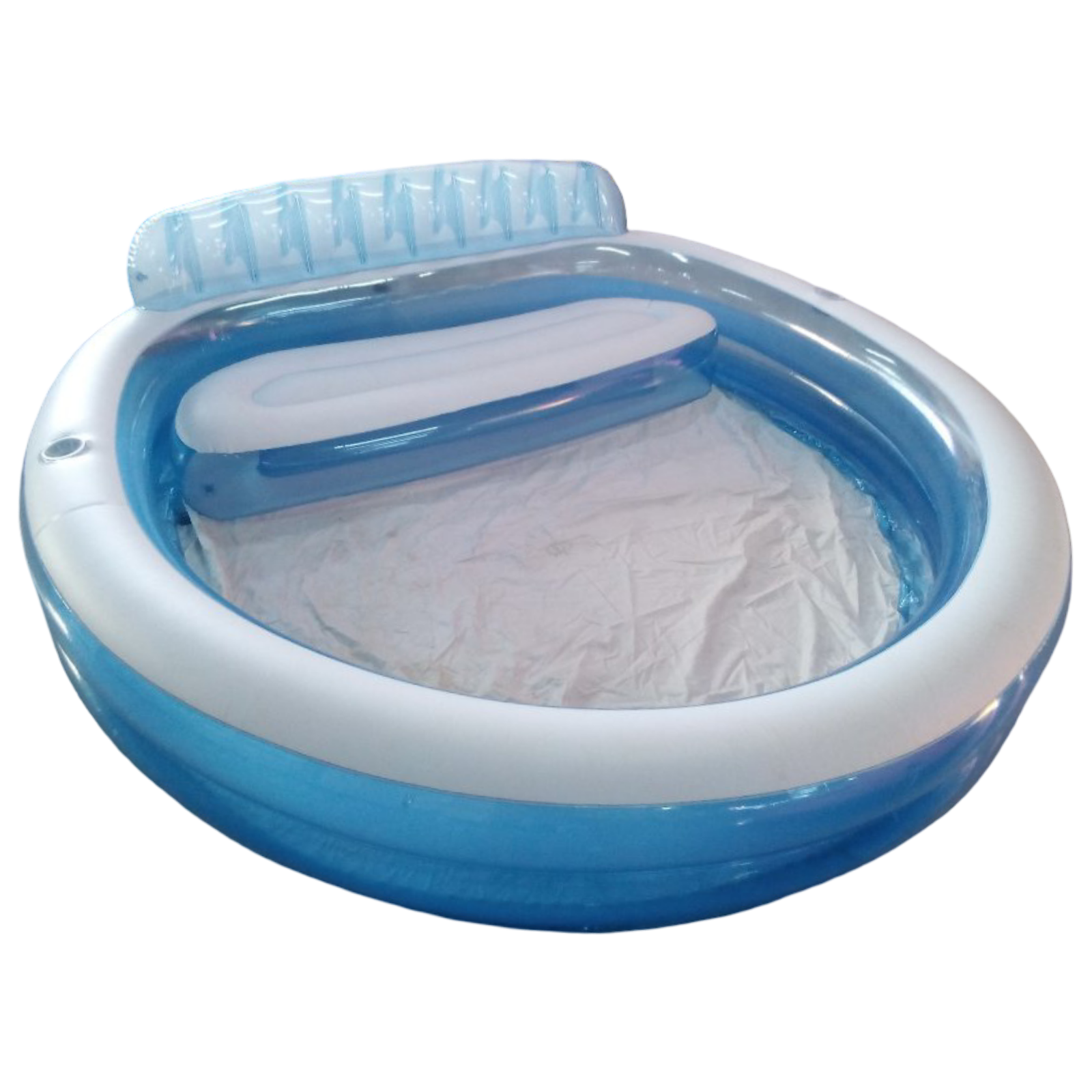 Piscina redonda inflable, medidas 90 x 86 x 31 cm, con respaldar y donde sentarse dentro de ella, válvulas para inflar depósito para colocar vasos para bebidas.