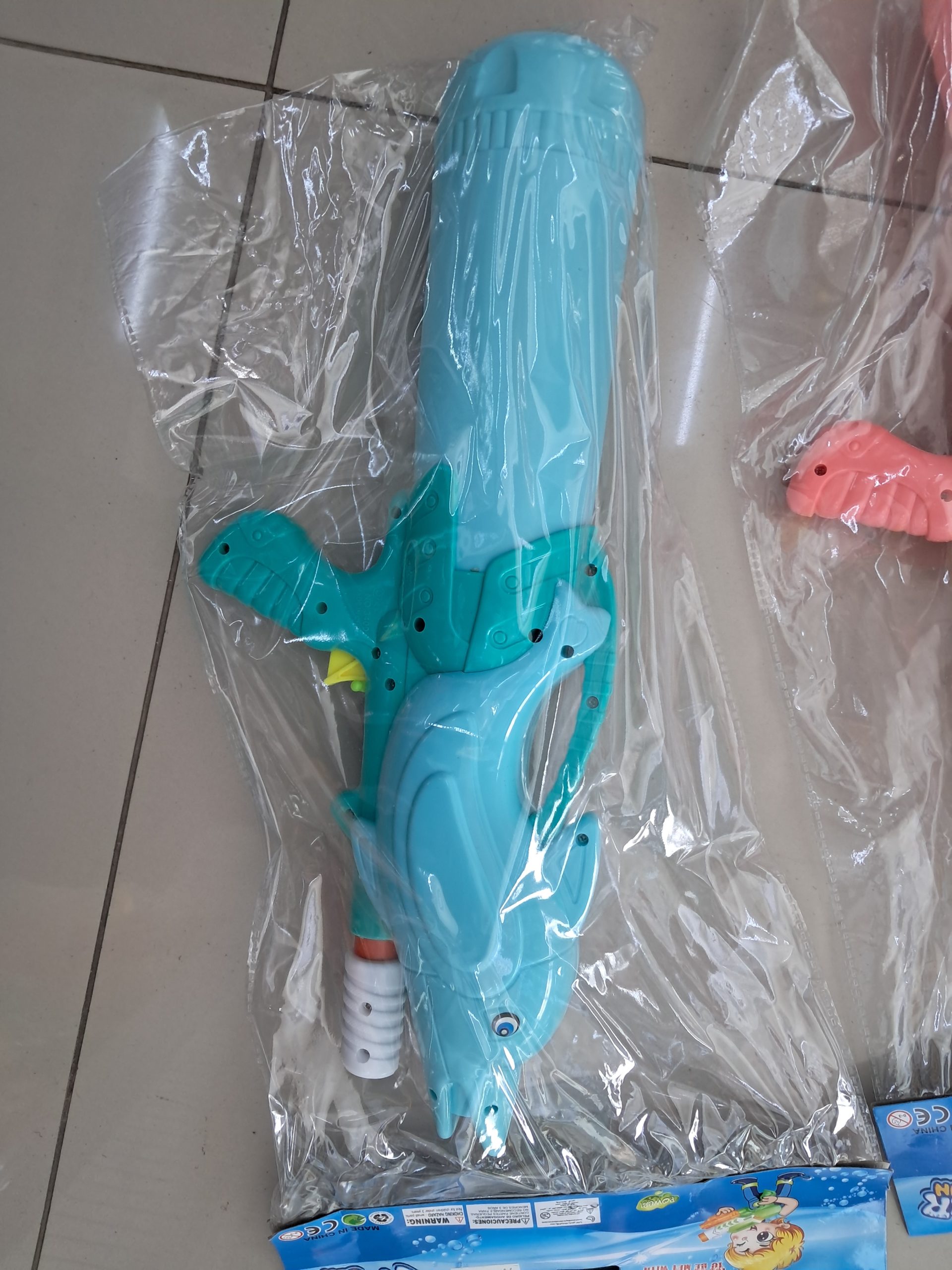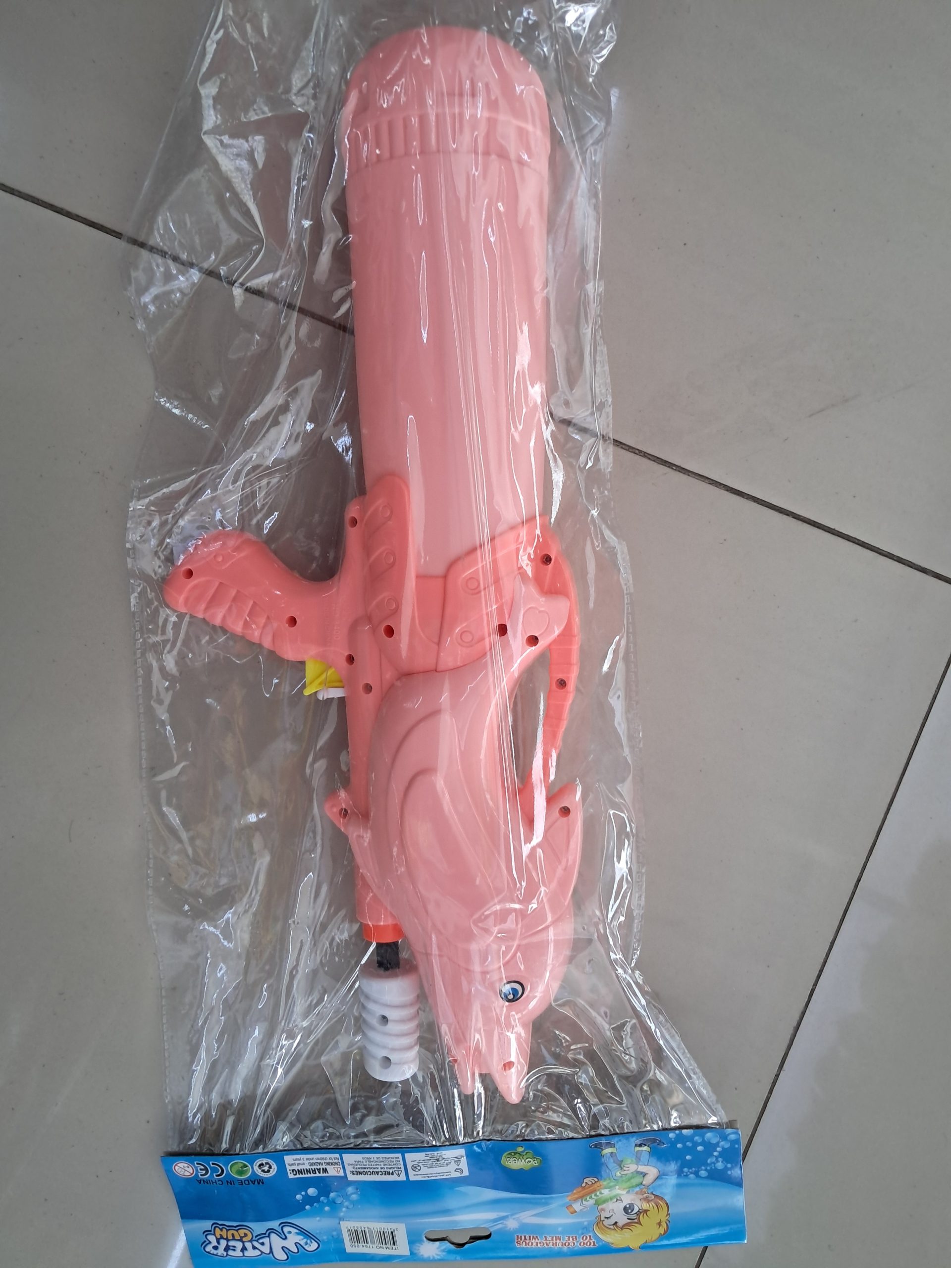 Pistola de agua infantil con diseño de delfín, fabricada en plástico resistente, ideal para juegos de verano. Medidas aproximadas: 45 cm de largo, 18 cm de alto y 6 cm de ancho.