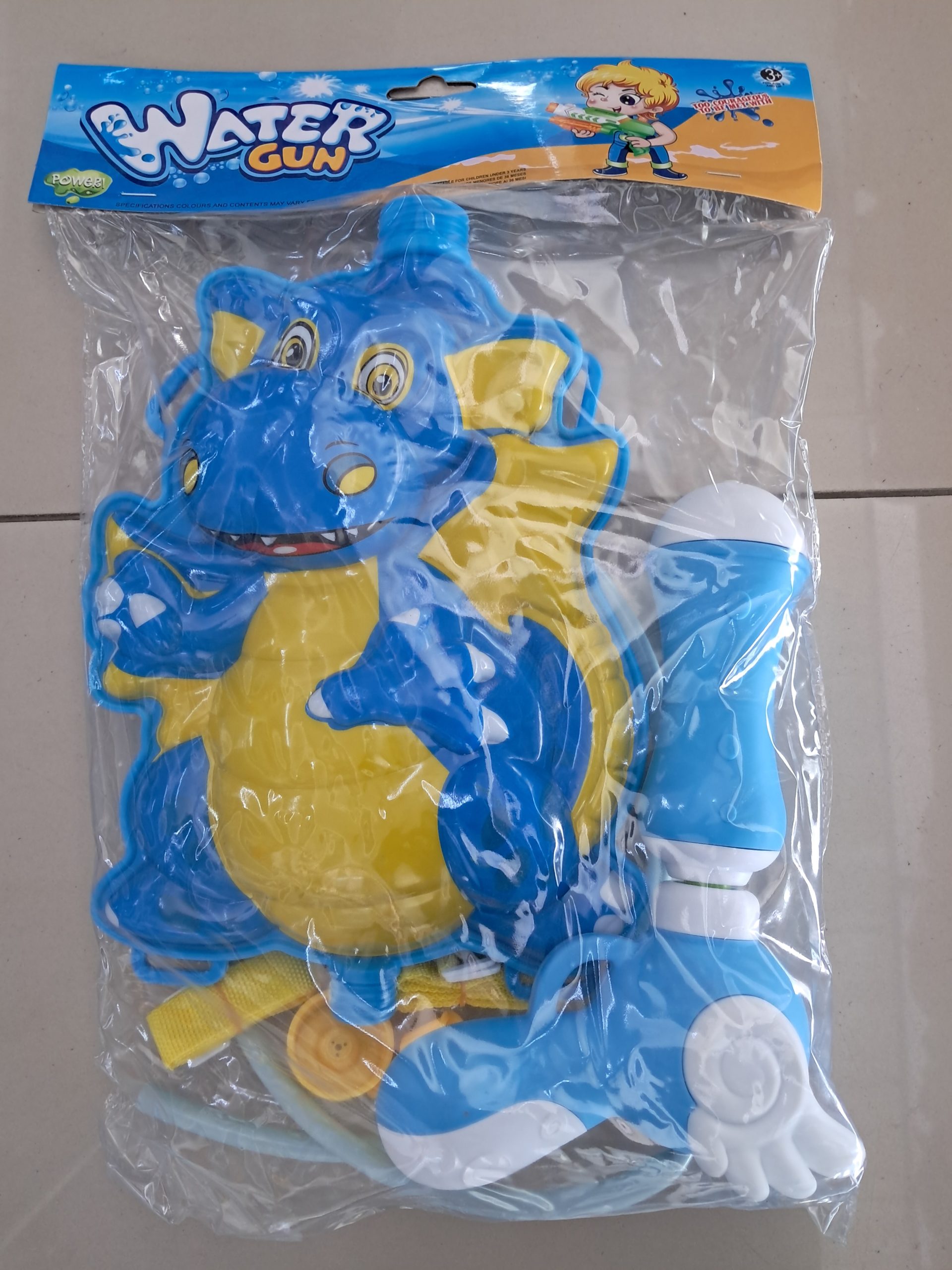 Pistola de agua con tanque tipo mochila. Ideal para juegos de verano, piscina y playa. Ligera y fácil de usar.
