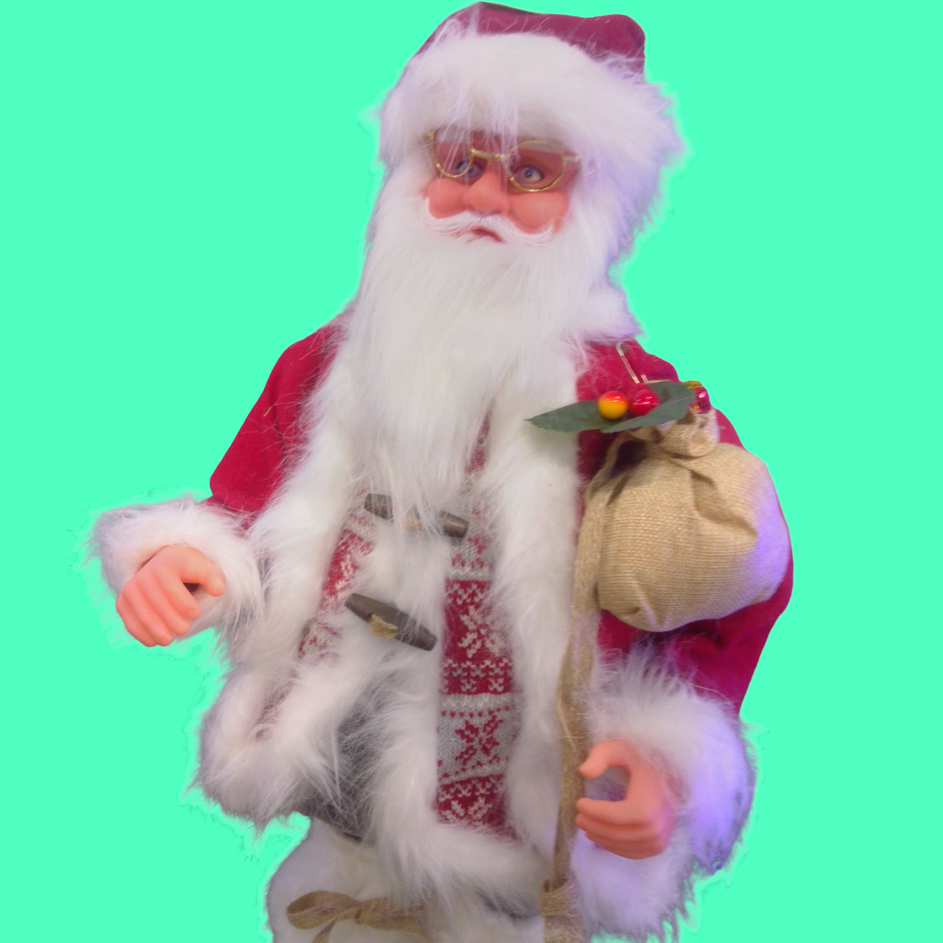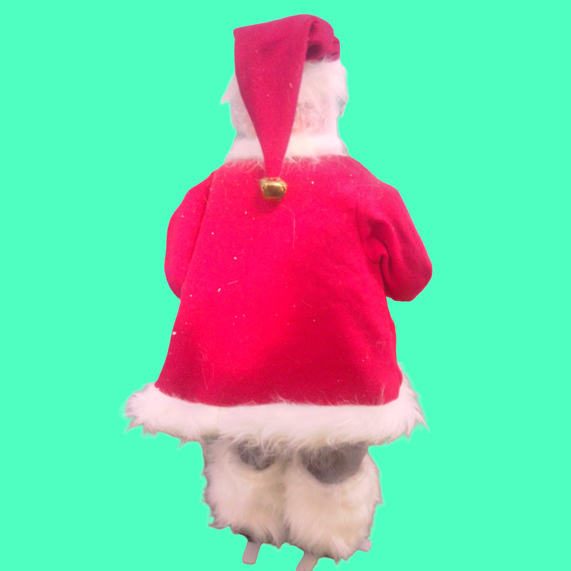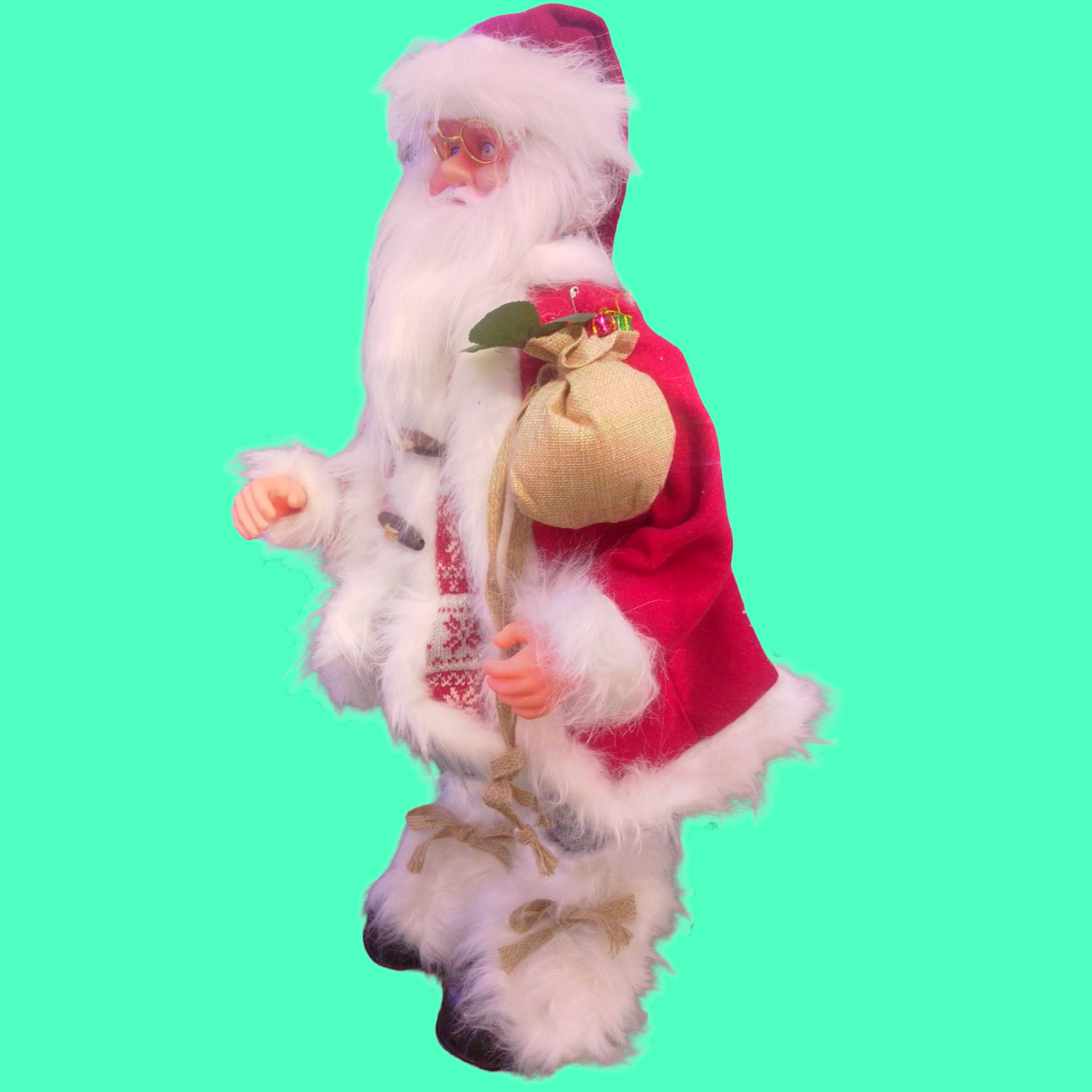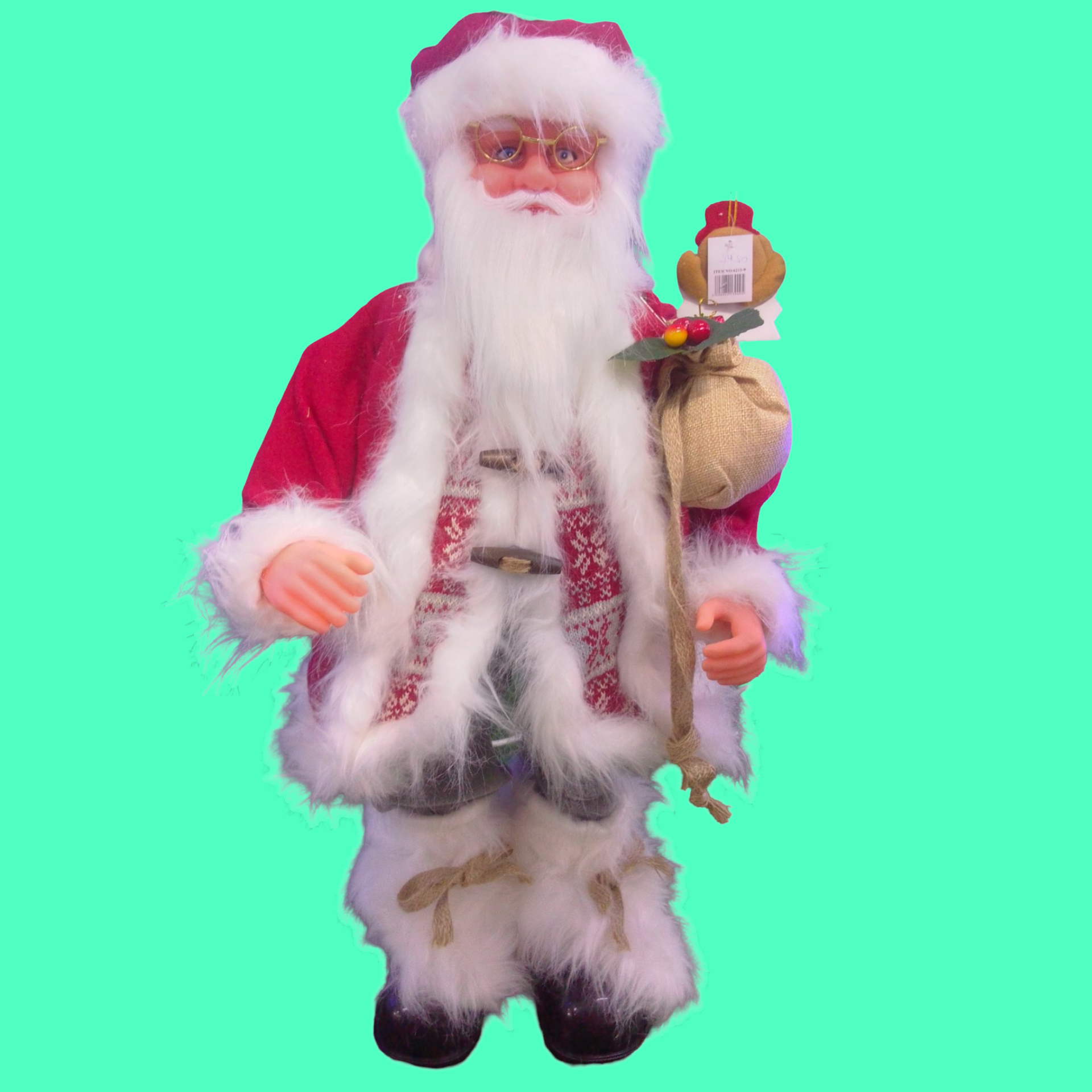 Color rojo con blanco blanco, tiene un costalito de regalos. Mide 71 cm, tiene botas blancas de peluche.