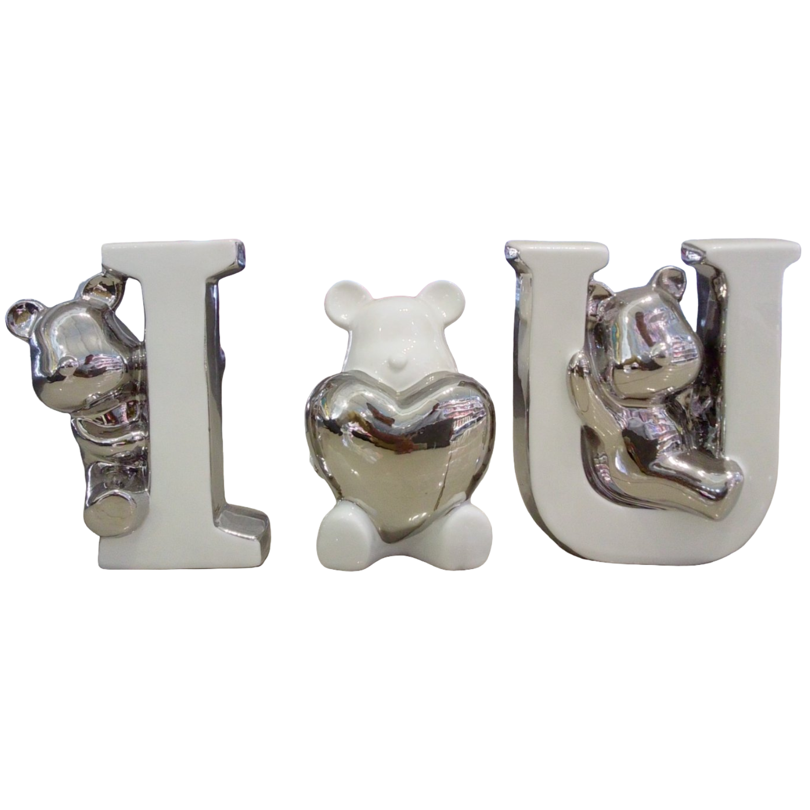 Set o juego de porcelana te amo , I🤍U con ositos en cada letra, en color blanco y plateado, regalo para obsequiar a esa persona especial en tu vida, para este día del amor y la amistad.