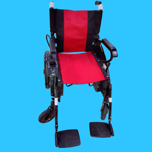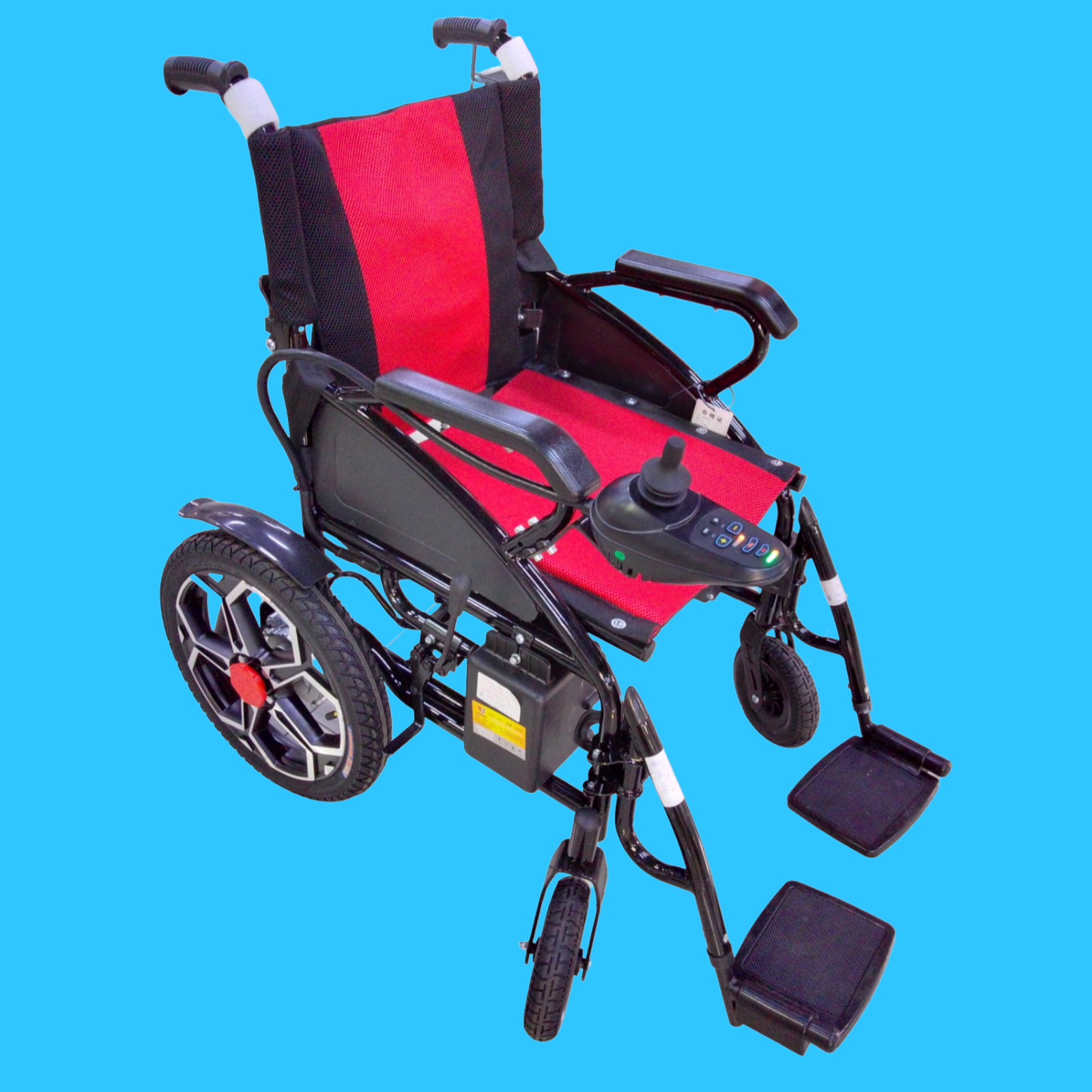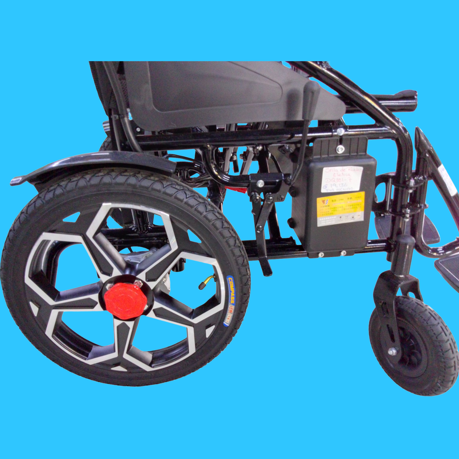 SILLA DE RUEDA. COLOR NEGRA CON ROJO. CON CONTROL DE MANDO MANO DERECHA. CUATRO DIRECCIONES. PITO. 5 VELOCIDADES. NIVEL DE CARGA BATERÍA. S.O.S. Y PARLANTE. CON CARGADOR DE BATERIAS, LLANTAS NÚMERO 16 TRACERAS.