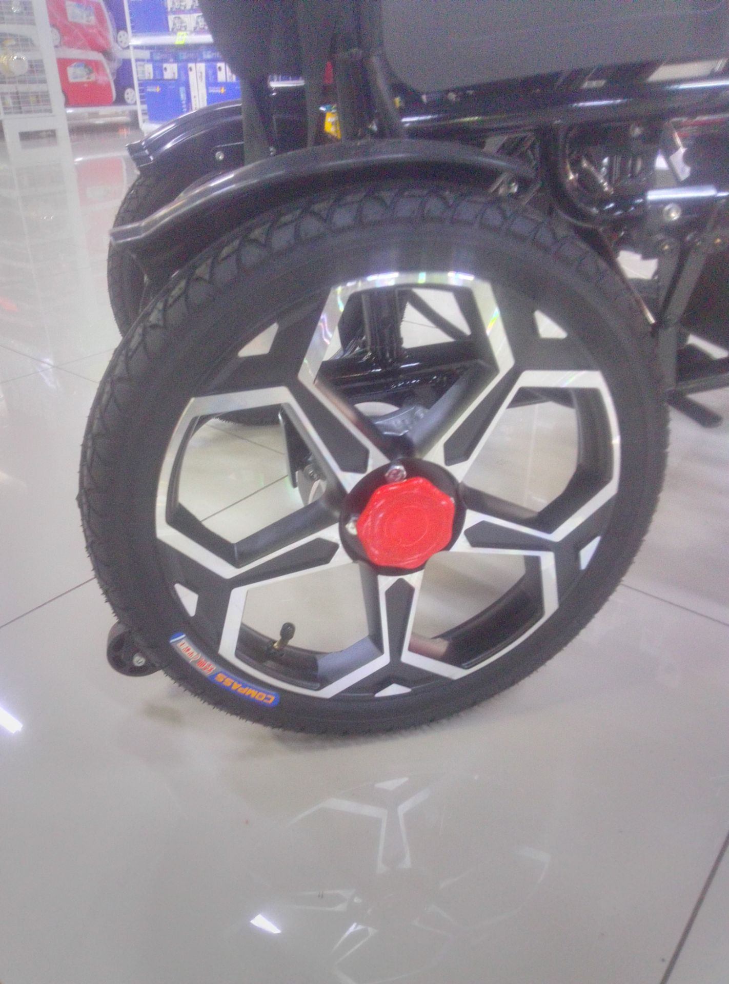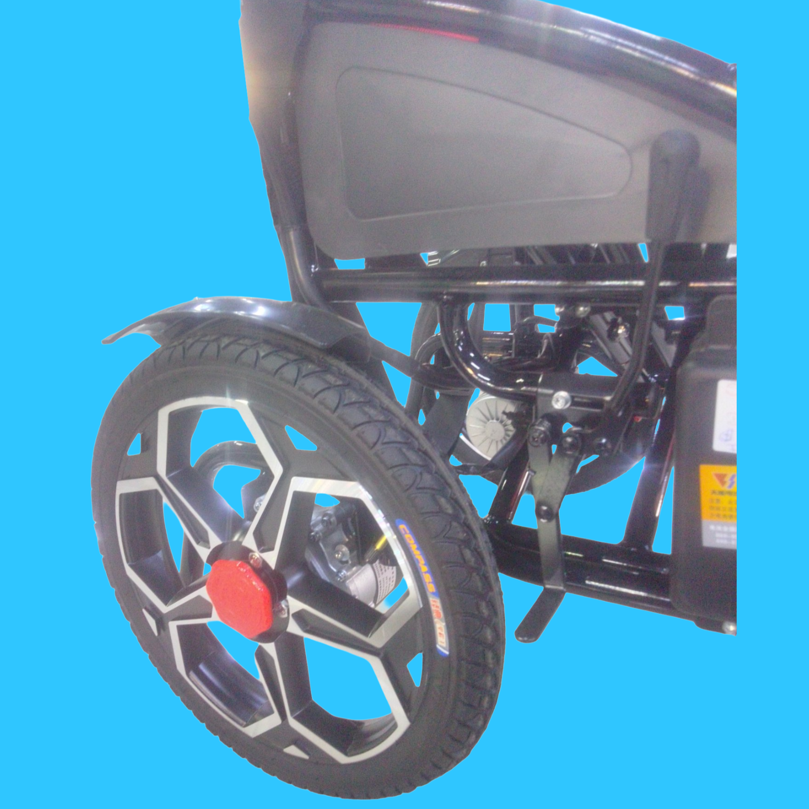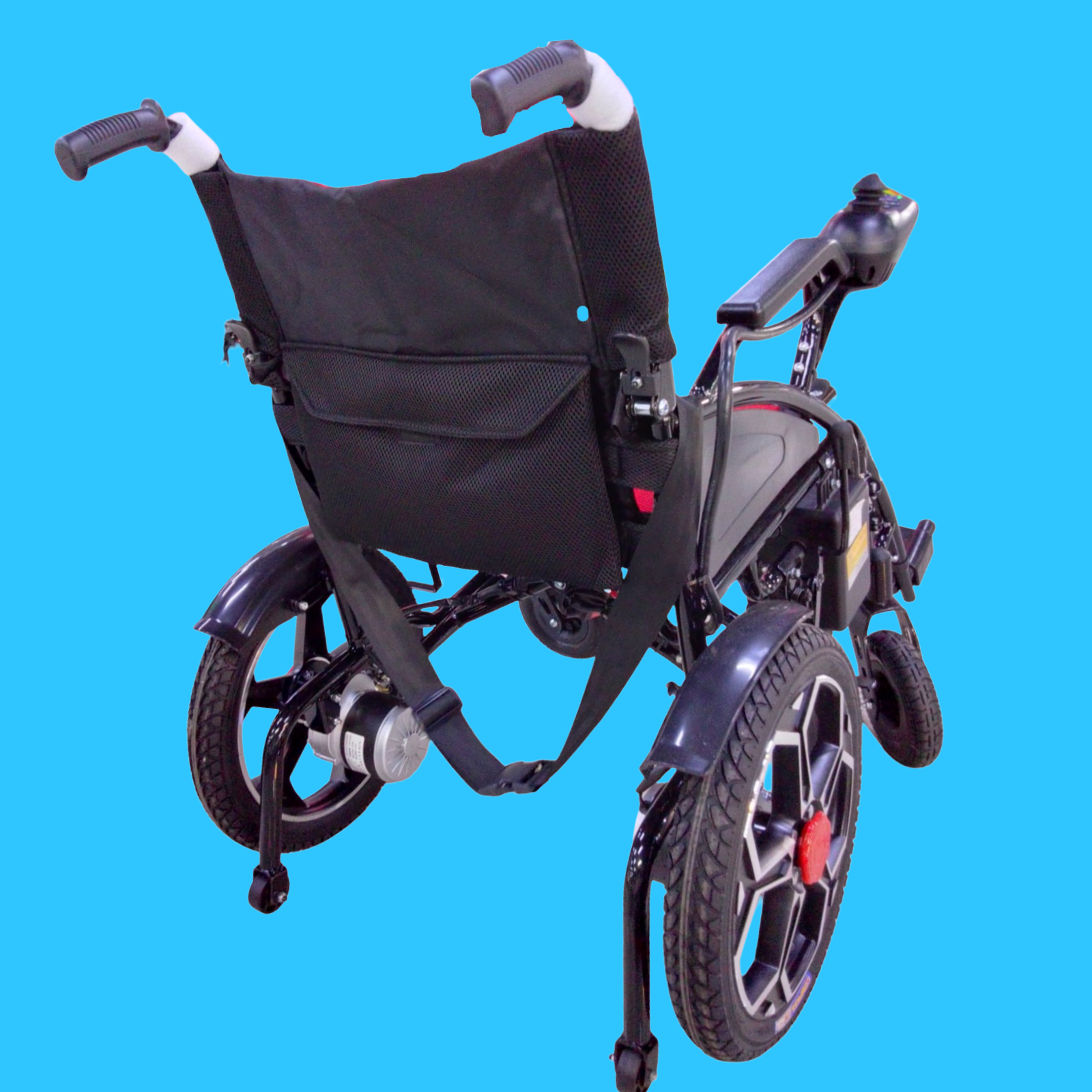 SILLA DE RUEDA. COLOR NEGRA CON ROJO. CON CONTROL DE MANDO MANO DERECHA. CUATRO DIRECCIONES. PITO. 5 VELOCIDADES. NIVEL DE CARGA BATERÍA. S.O.S. Y PARLANTE. CON CARGADOR DE BATERIAS, LLANTAS NÚMERO 16 TRACERAS.