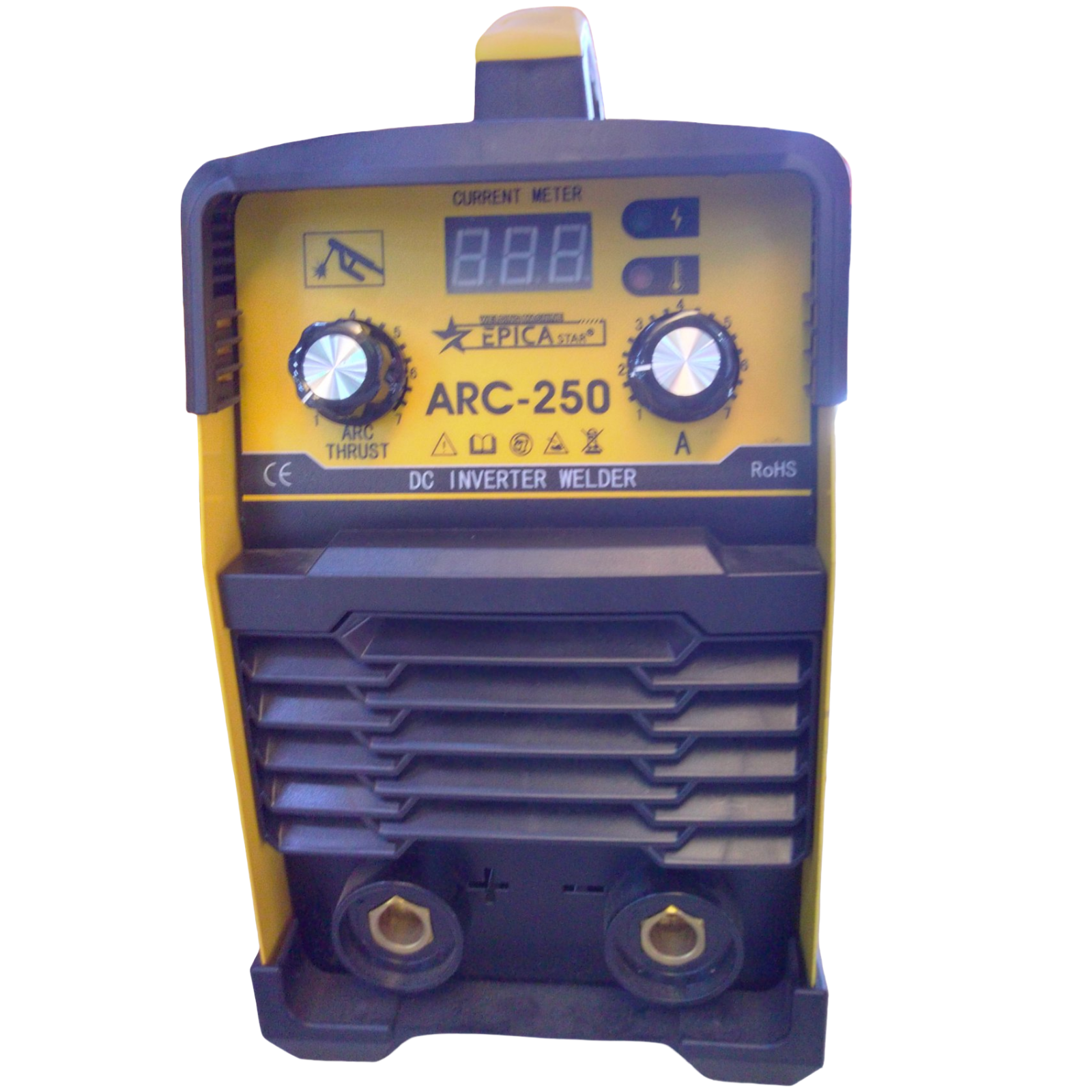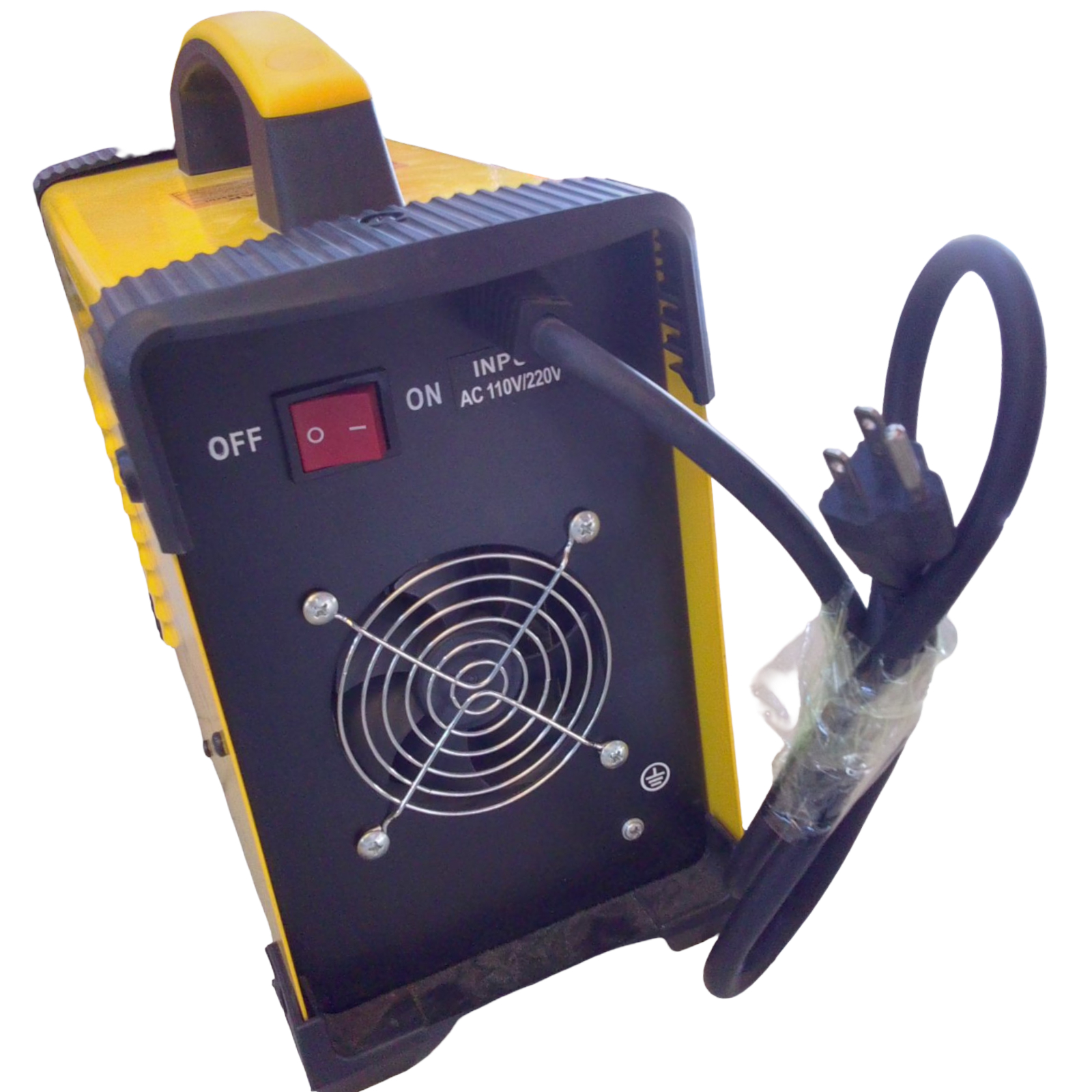 soldador de electrodos electrónico, voltímetro para corriente, entradas de conectores positivo y negativo, switch de encendido y apagado con su ventilador.
