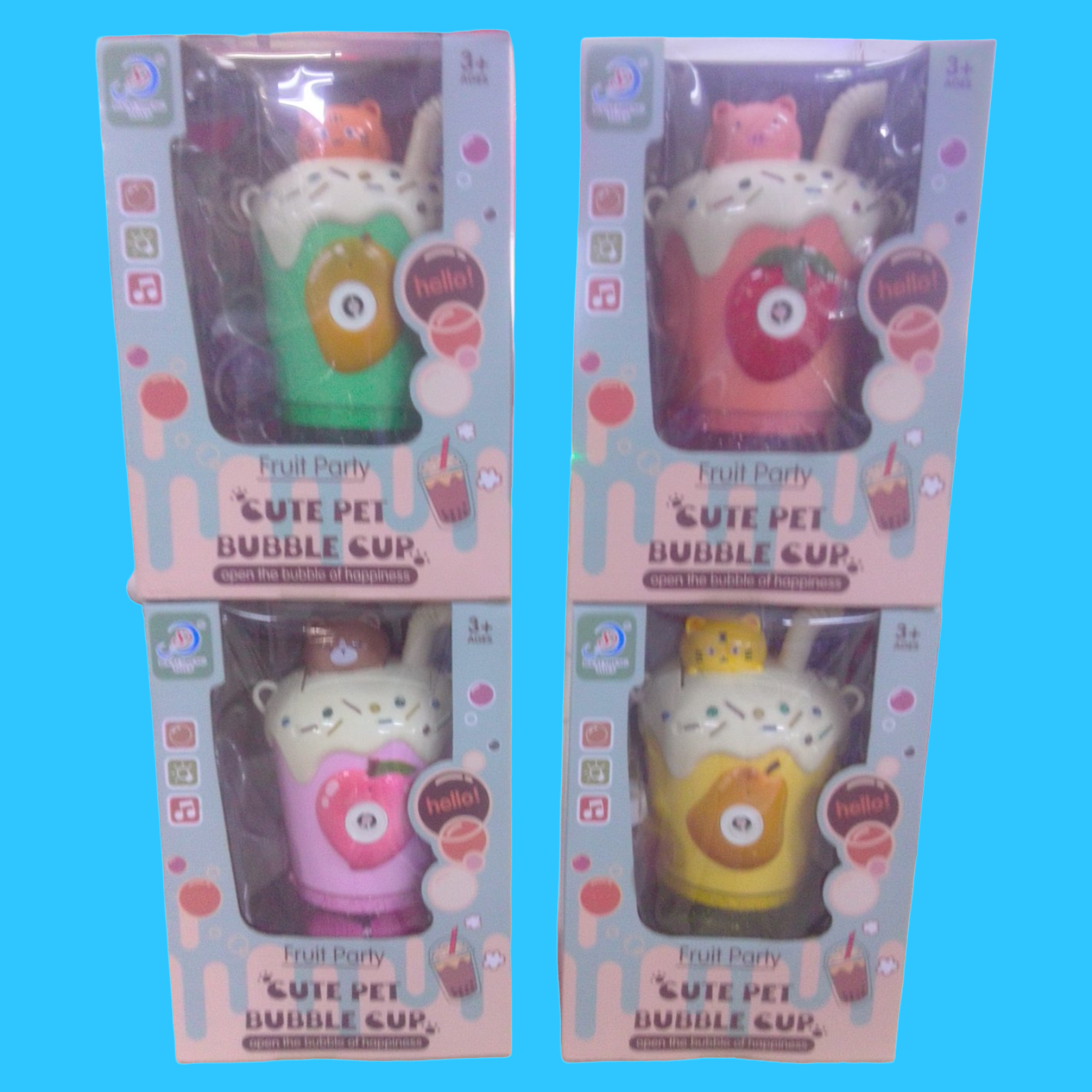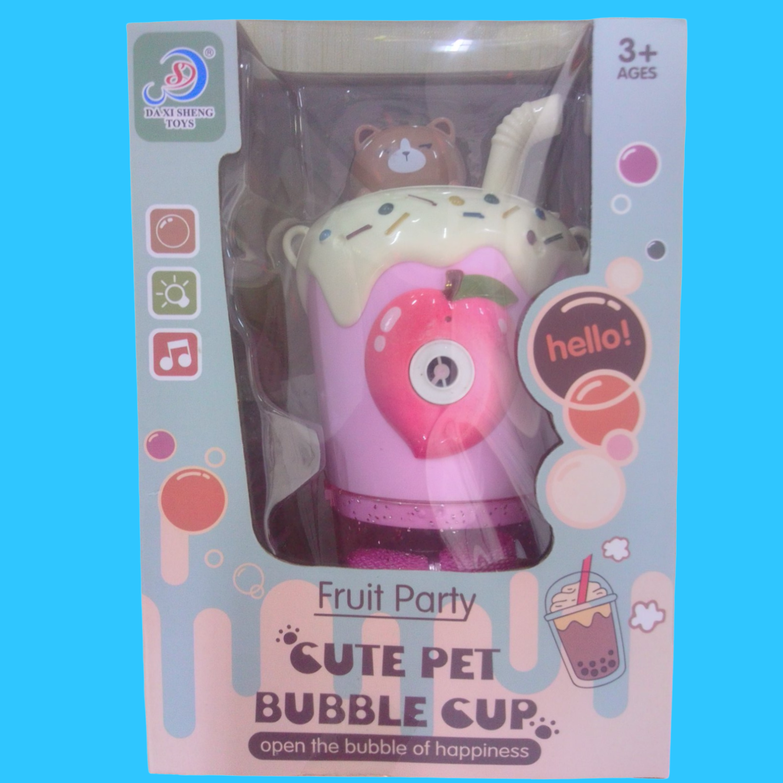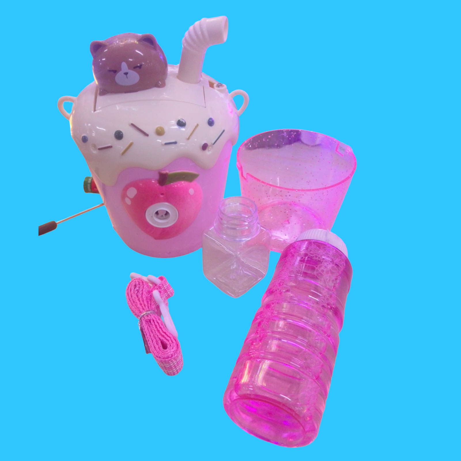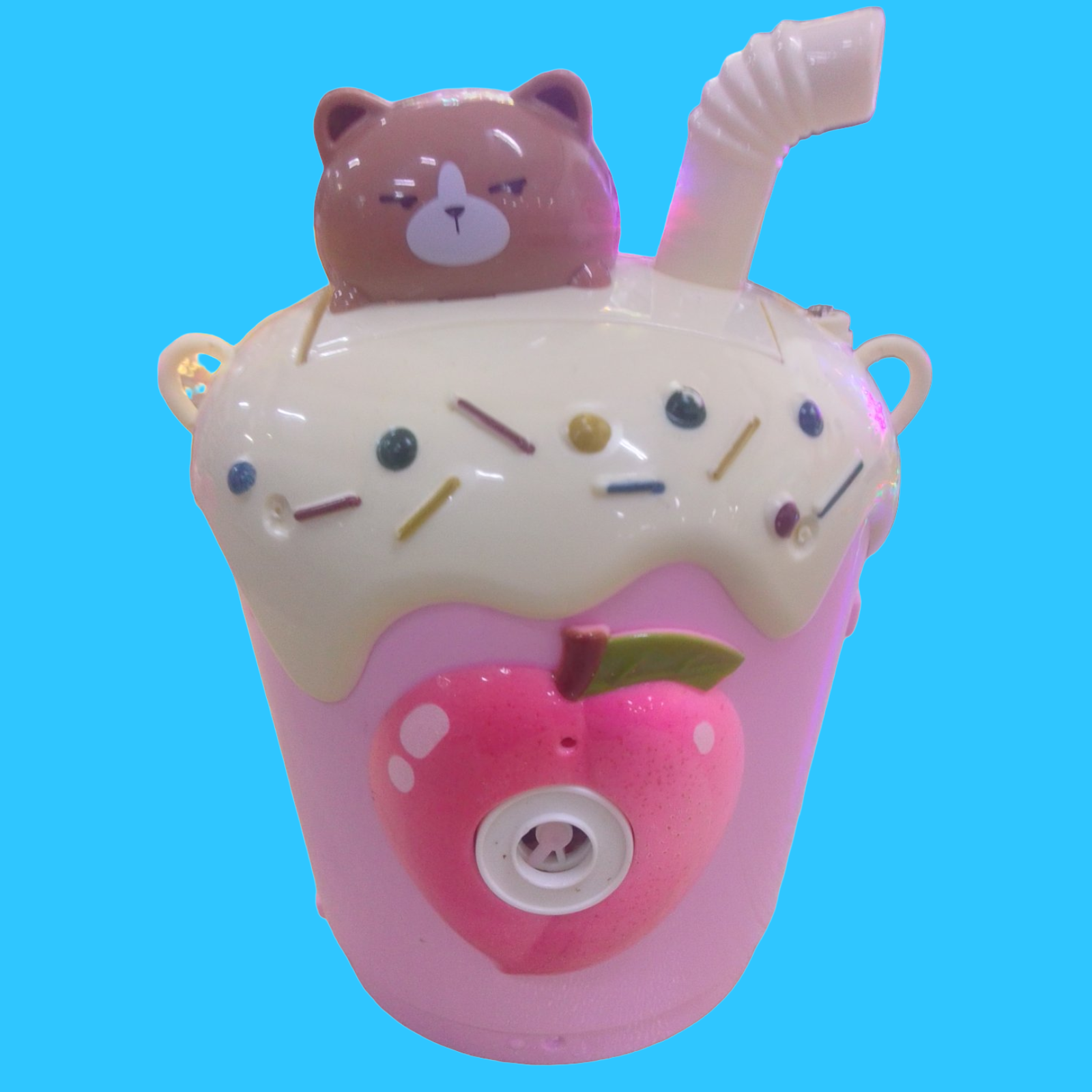 TAZA DE LANZA BURBUJAS Y CON LUCES MULTICOLORES Y MUSICAL. UTILIZA 3 BATERÍAS 2 A. Y FRASCO DE REPUESTOS DE BURBUJAS.