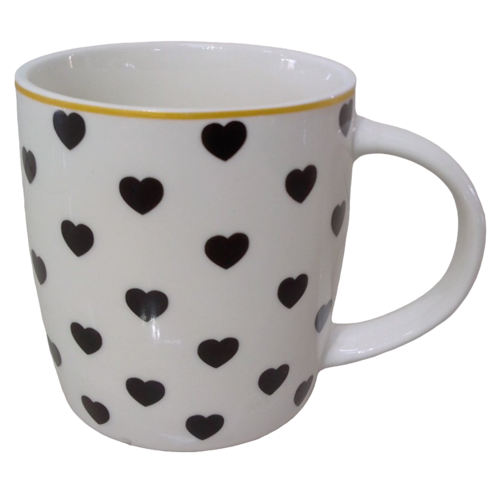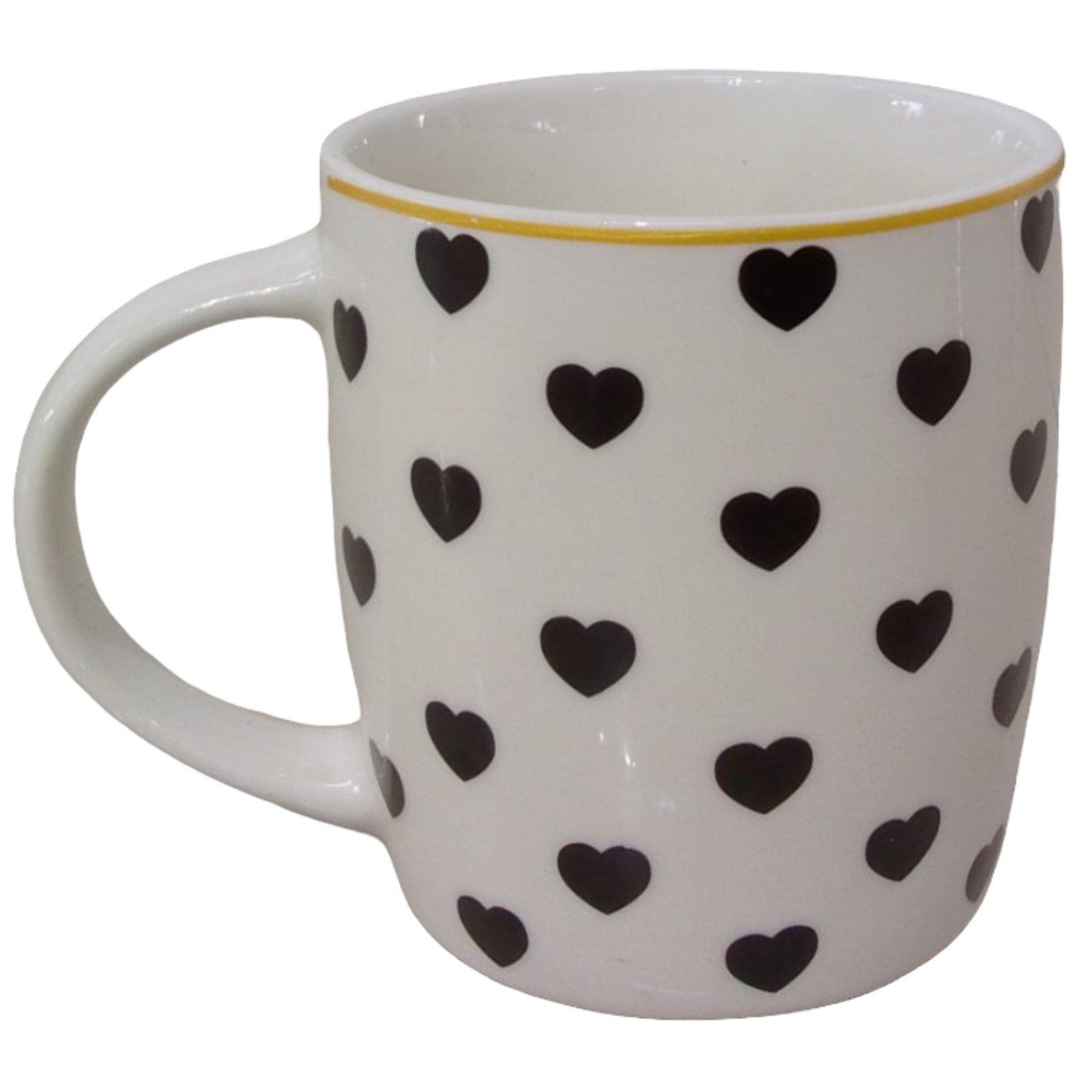Taza de porcelana con dibujos de corazónes de color negro, un detalle para regalar en este día del amor y la amistad.