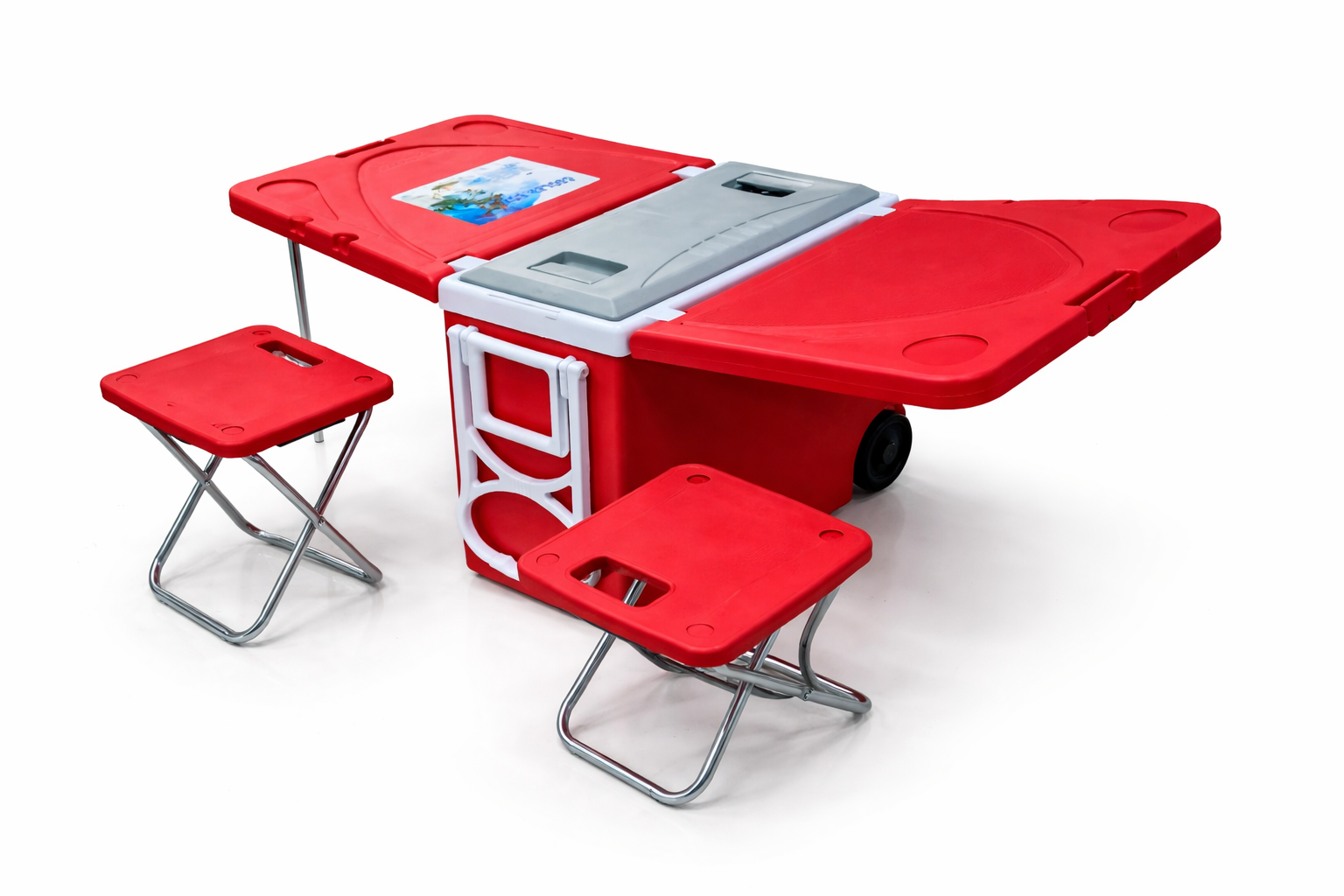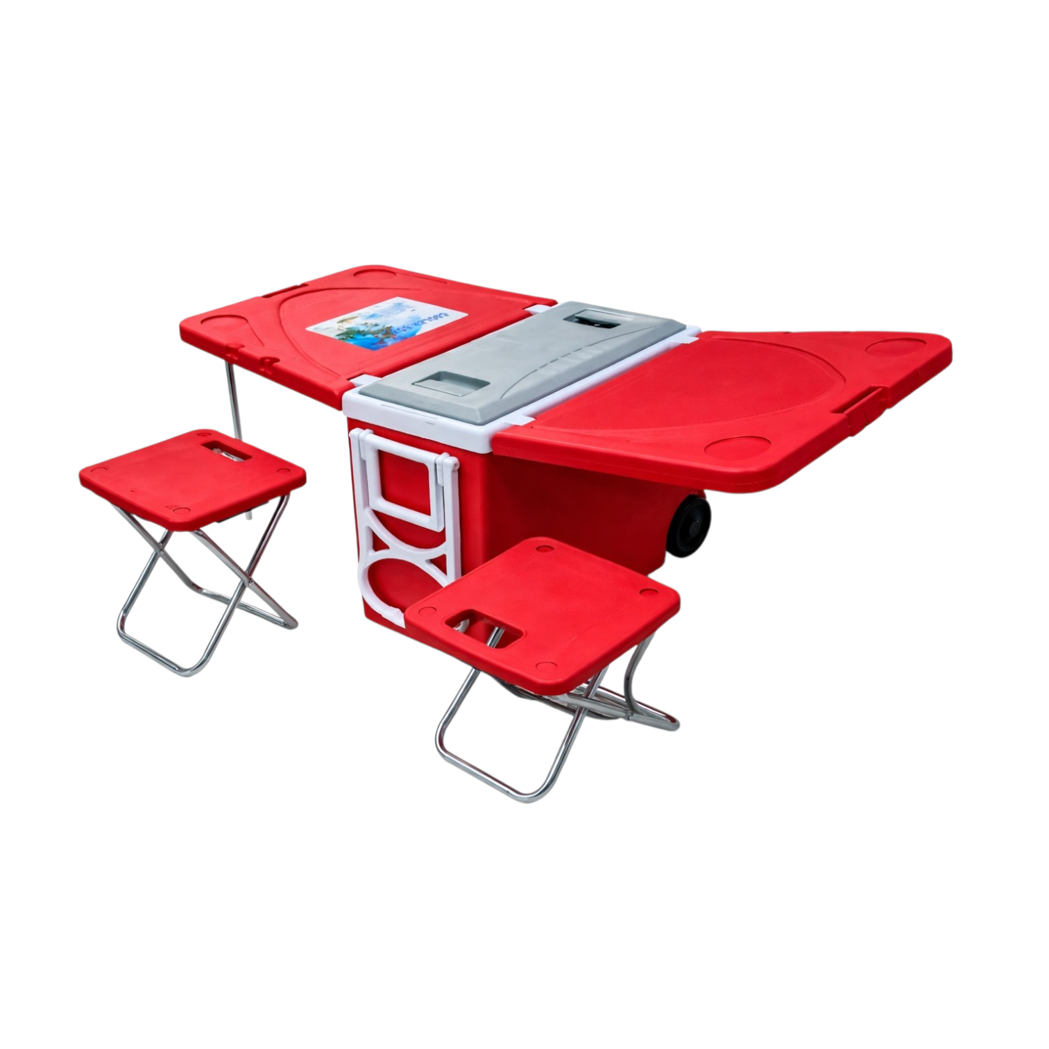 Termo de 28 litros que se convierte en mesita. Incluye ruedas, agarradero y depósito para bebidas, además de dos sillitas metálicas resistentes. Ideal para playa, picnic y actividades al aire libre.