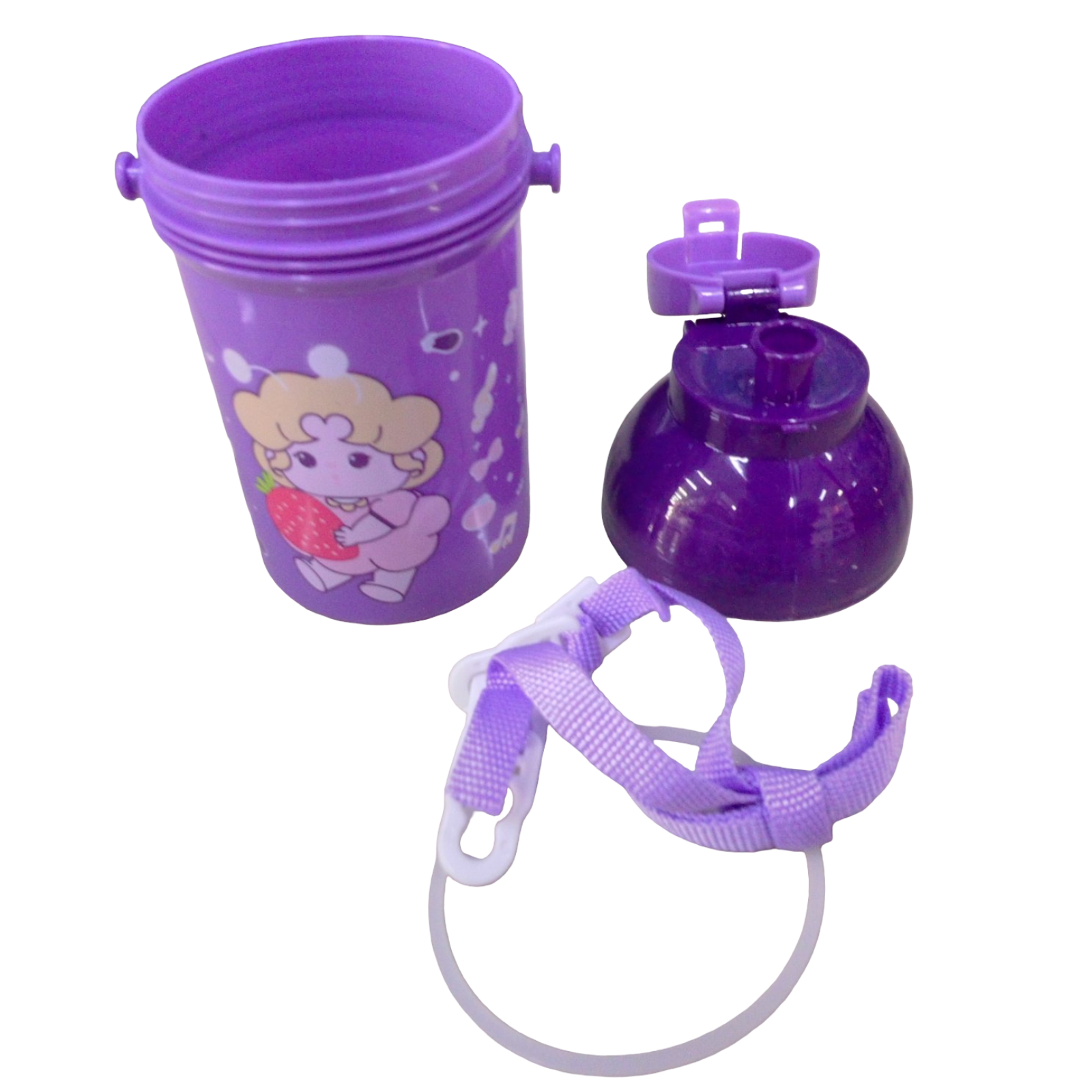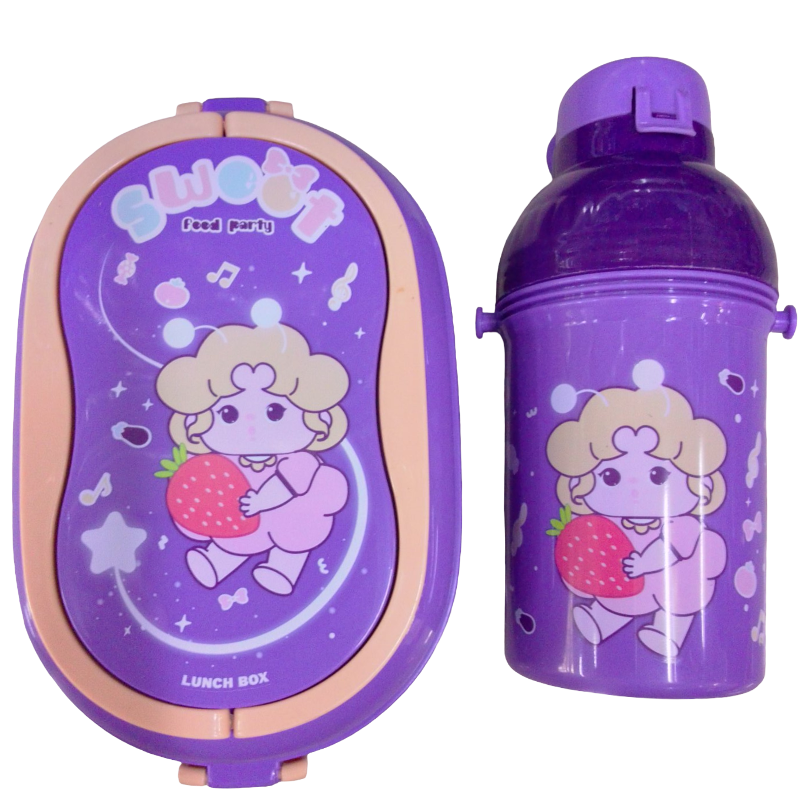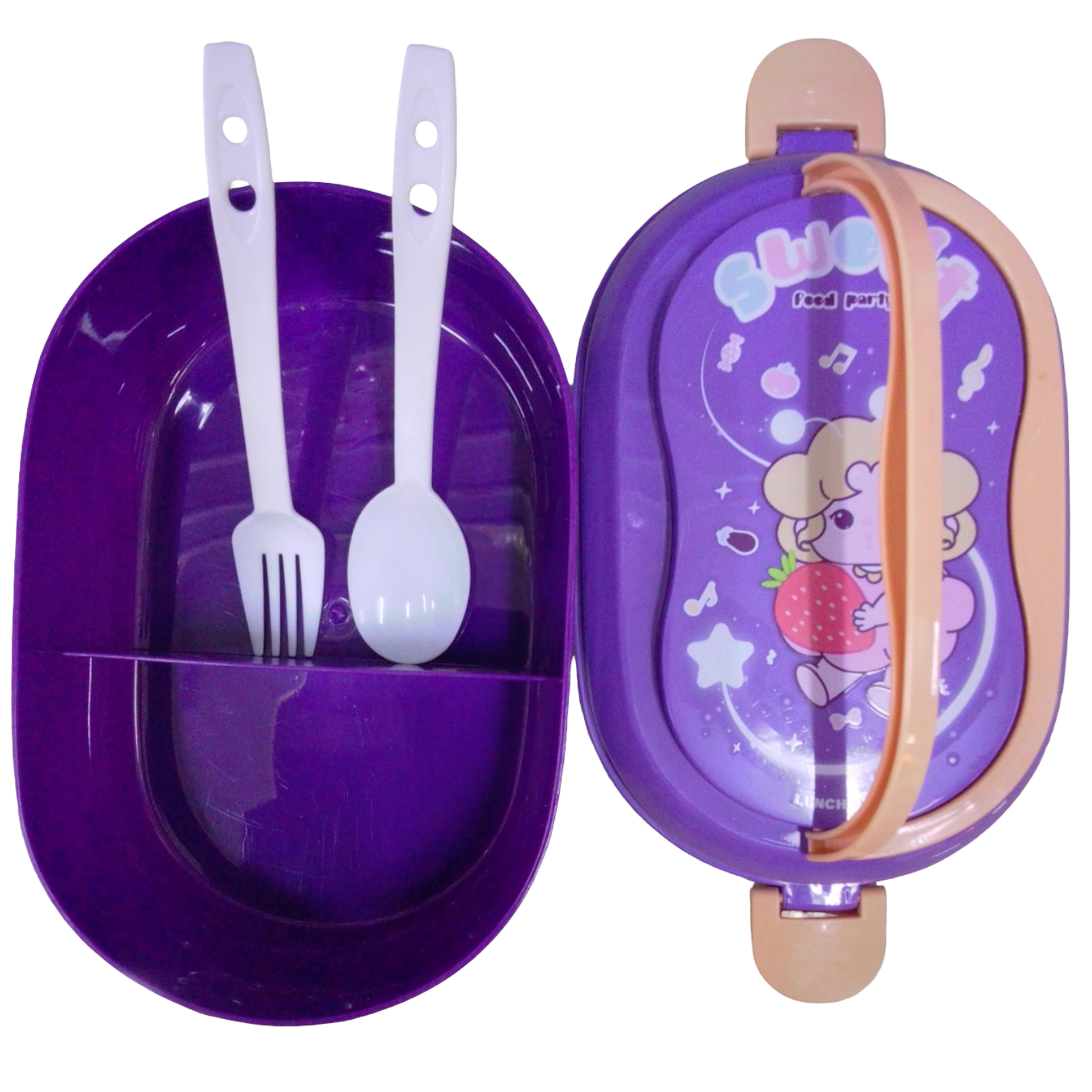 TERMO Y LONCHERA. COLOR MORADO PARA NIÑAS. LONCHERA TIENE 2 DEPÓSITOS PARA COMIDAS CON CUCHARA Y TENEDOR. TERMO CON ACCESORIOS CORREA PARA COLGAR.