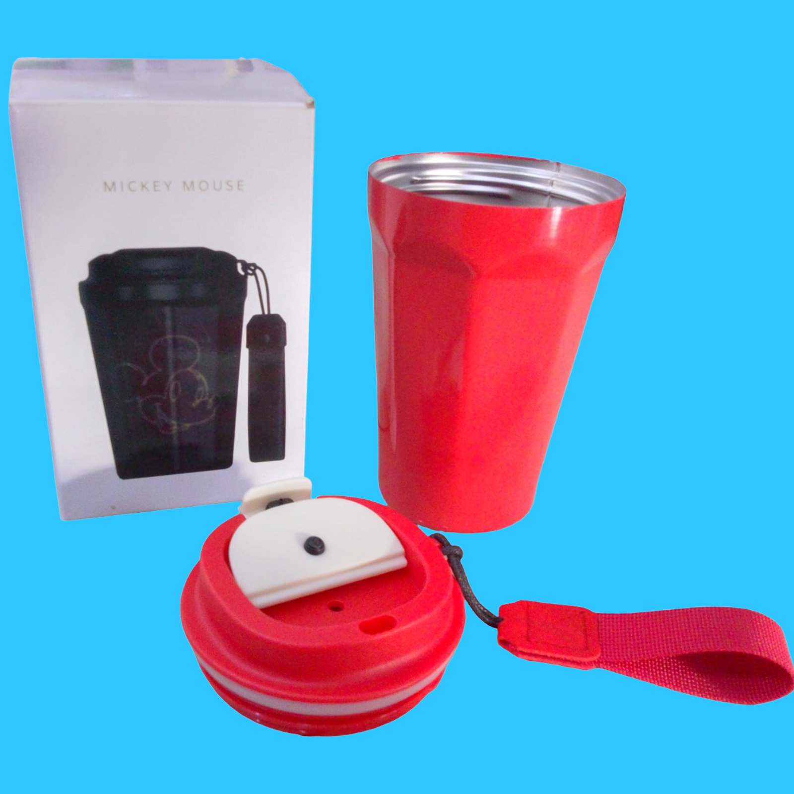 TERMO PARA BEBIDAS. CIN IMAGEN DE MICKEY MOUSE. TERMO DE COLOR ROJO.