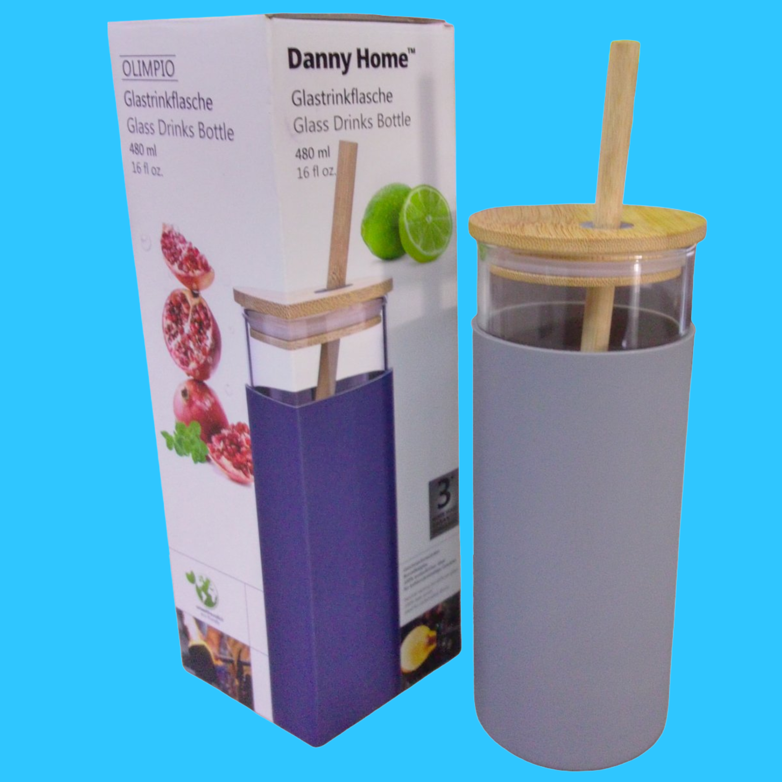 TERMO DE VIDRIO PARA BEBIDAS. CON PAJILLA Y PROTECTOR BASE DE GOMA. 480 ML.- 16 ONZAS.