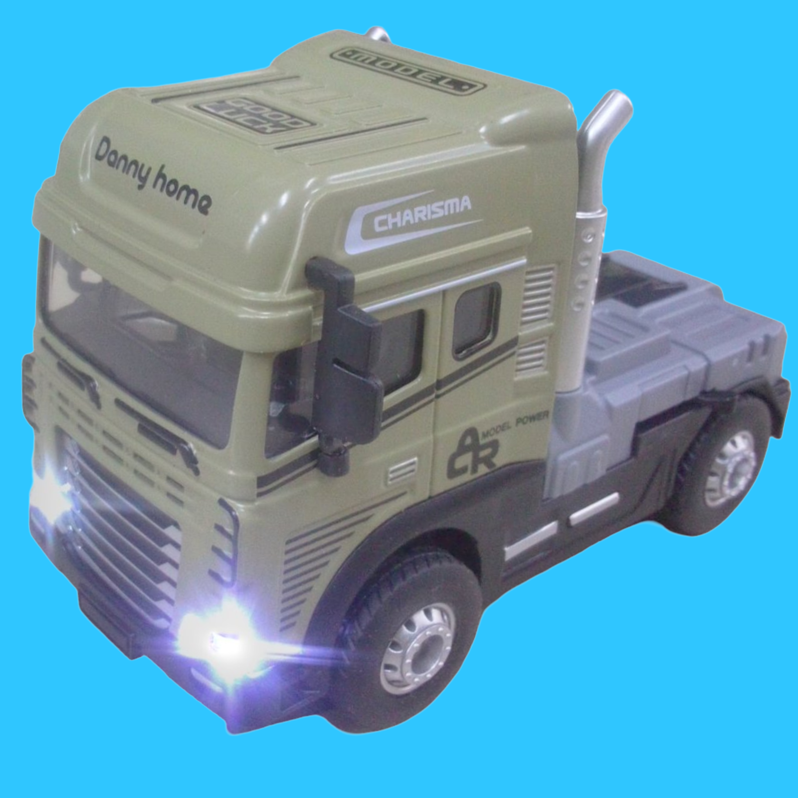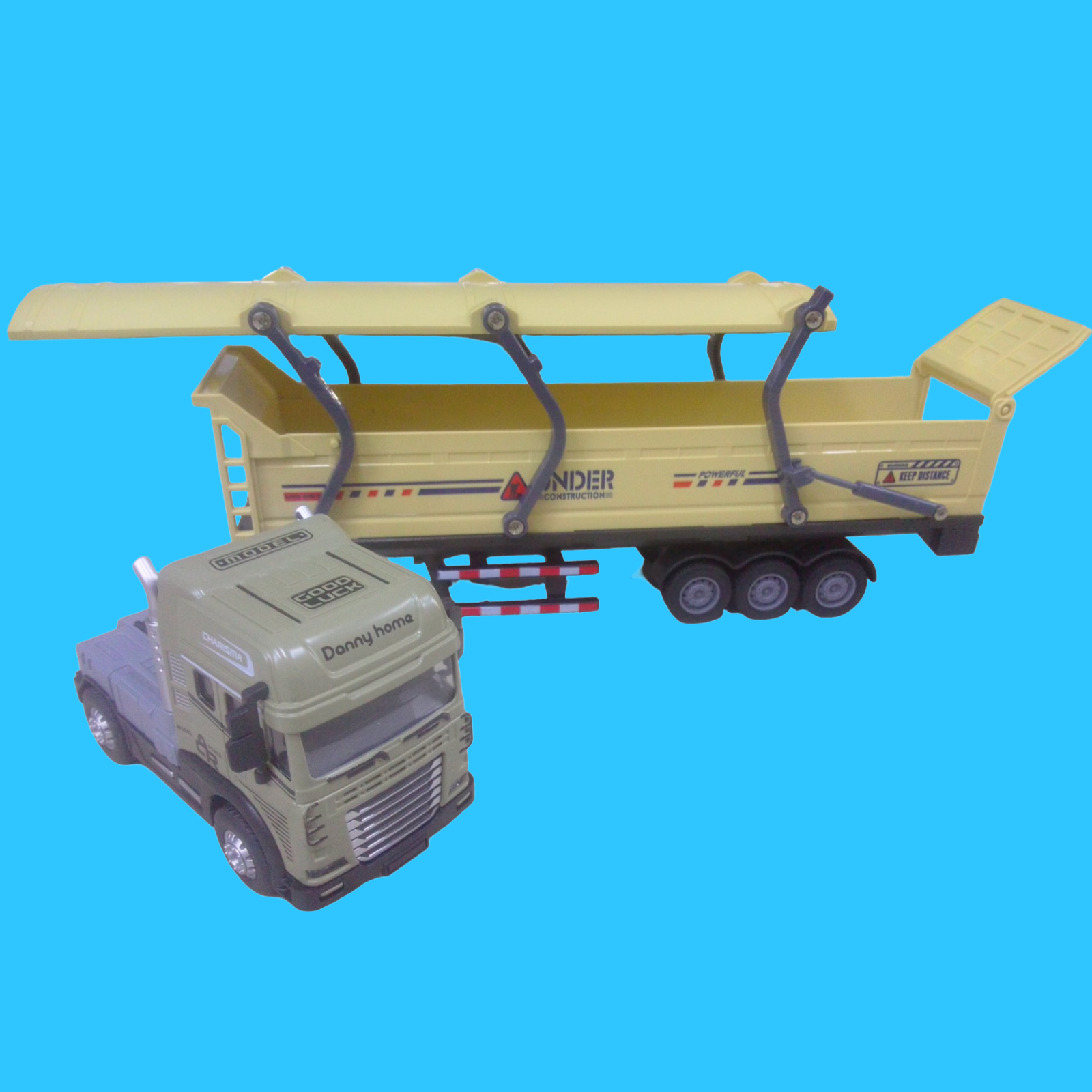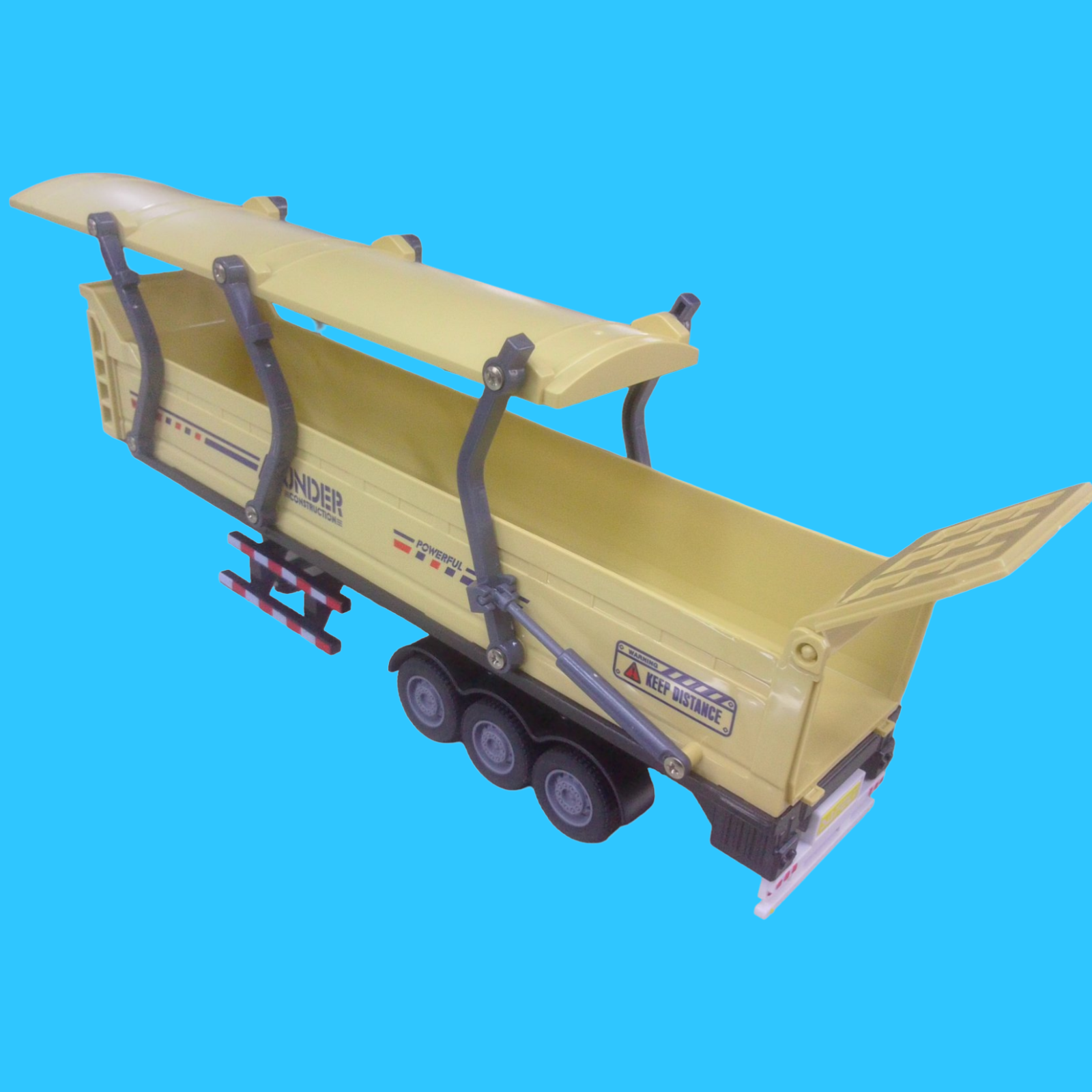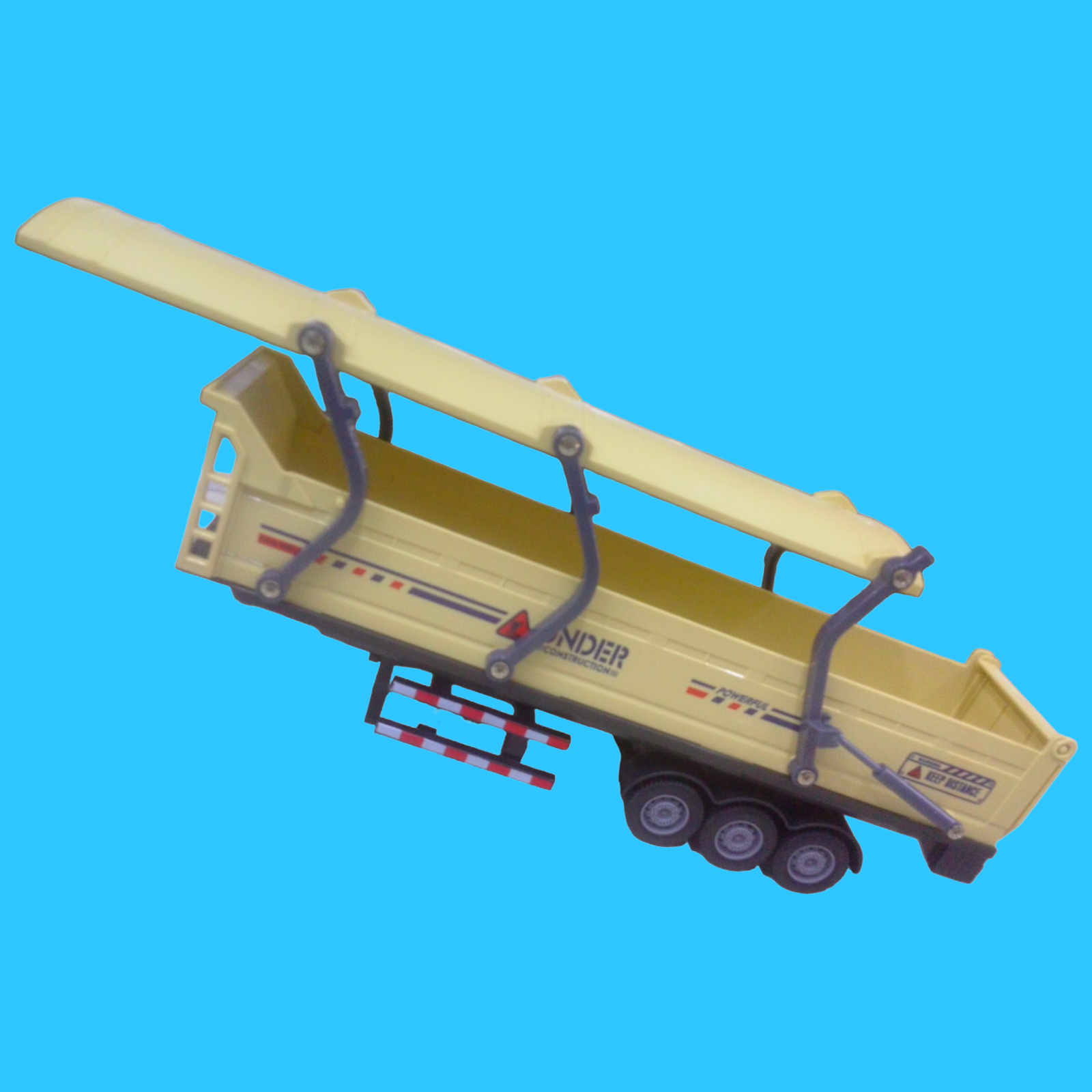 TRÁILER DE METAL, VAGON CON TAPA SUPERIOR Y OTRA ATRÁS, USA BATERÍAS 2 AG13, TIENE SONIDO DE TRAILER, DE ARRANQUE, ENCENDIDO DEL CAMIÓN, LUCES, CORRE A FRICCIÓN.