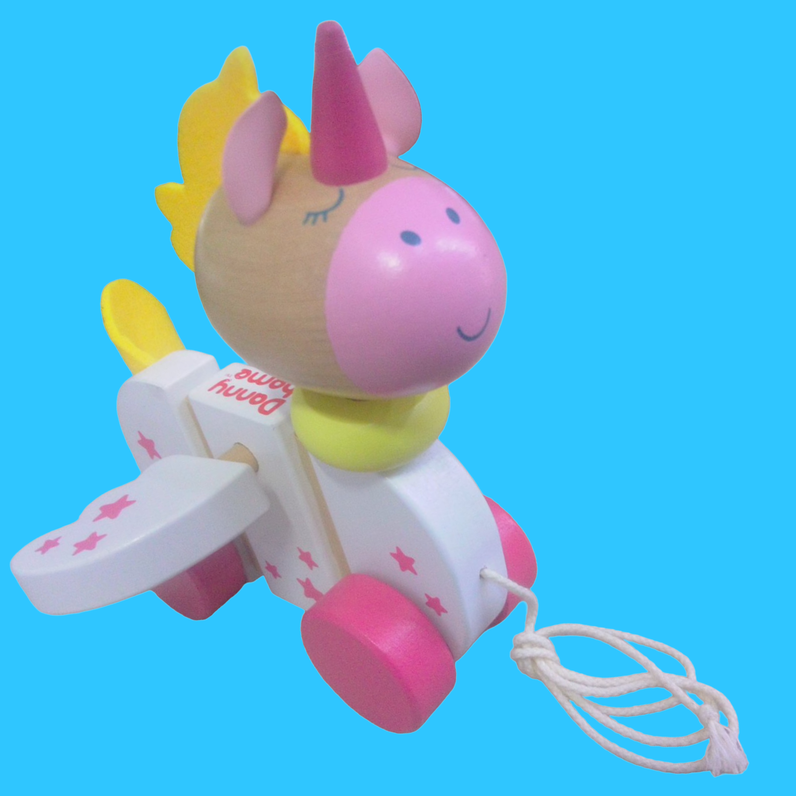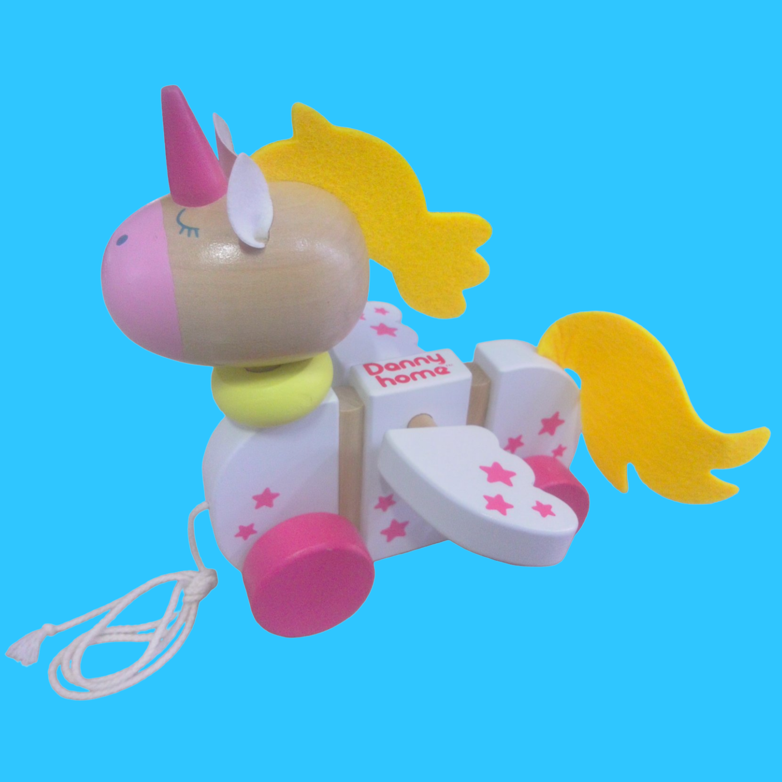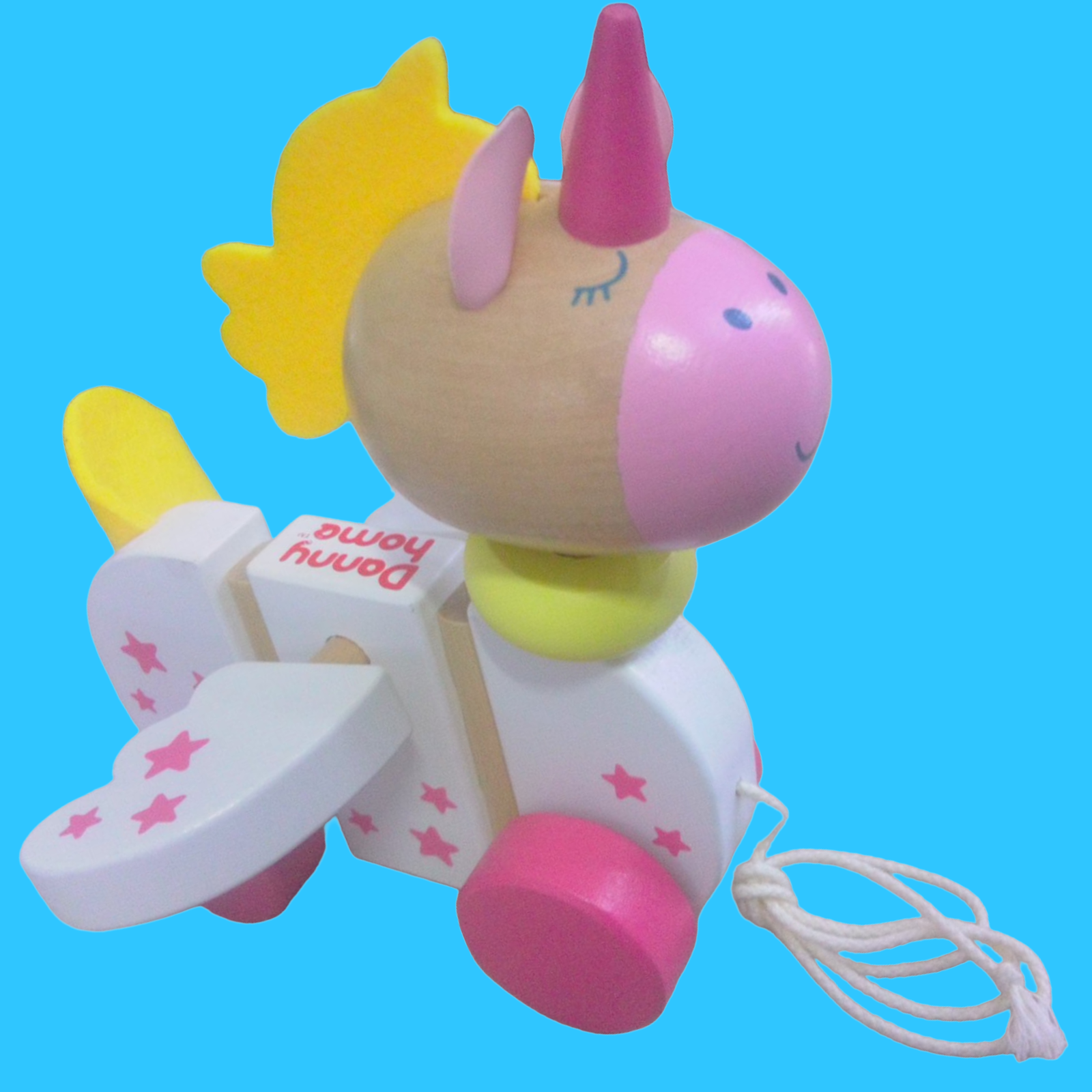 DIVERTIDA FIGURA UNICORNIO DE MADERA. CON COLORES BLANCO, ROSADO,Y AMARILLO.