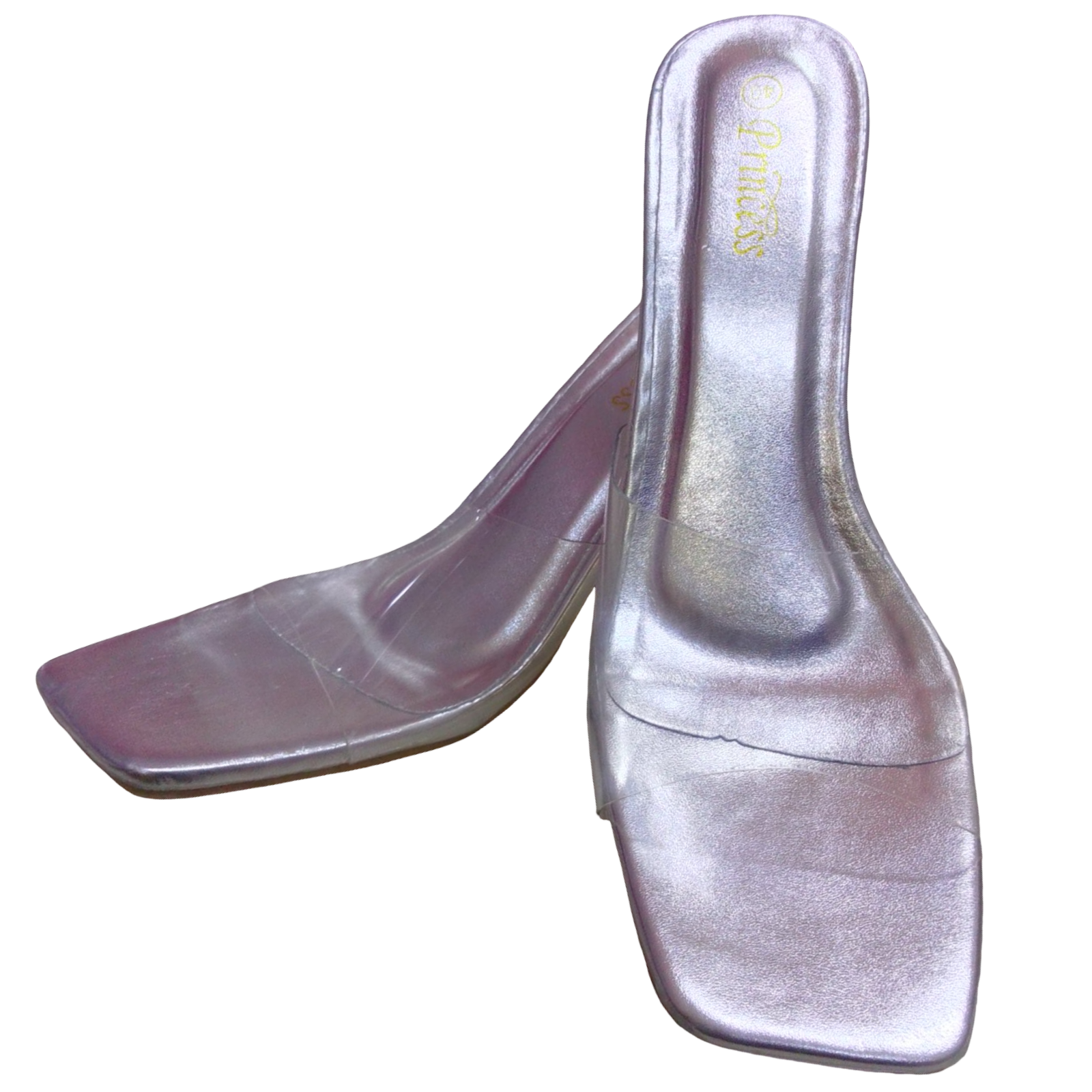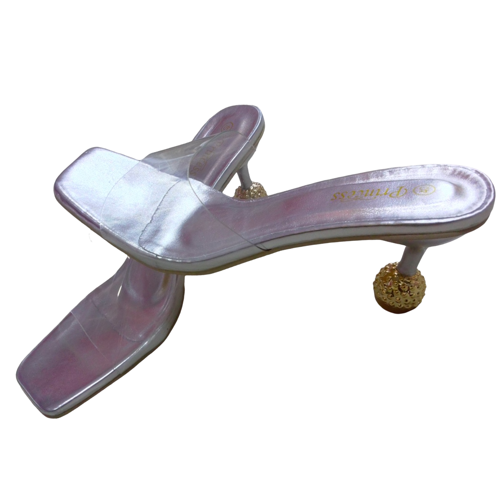 Zapatos de tacón para damas, color blanco, tacón dorado y transparente.